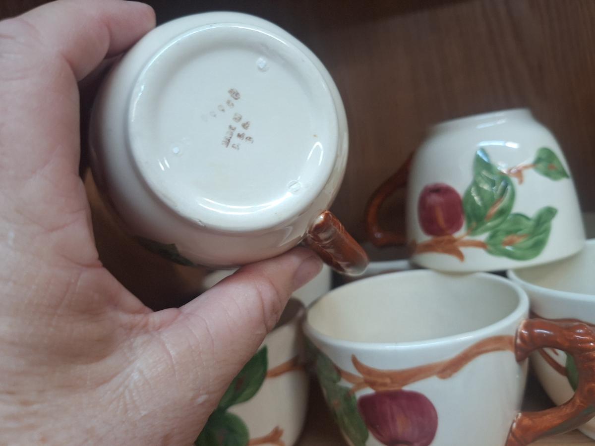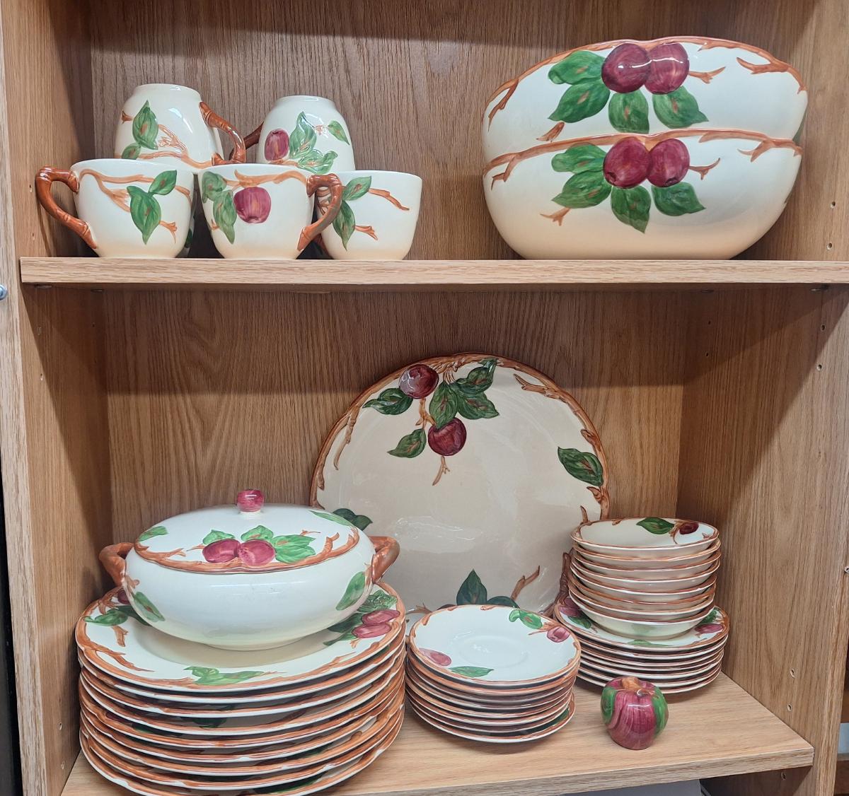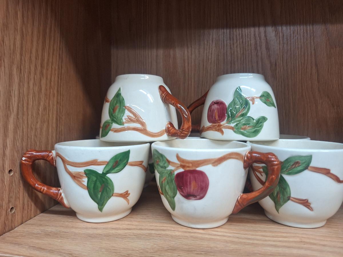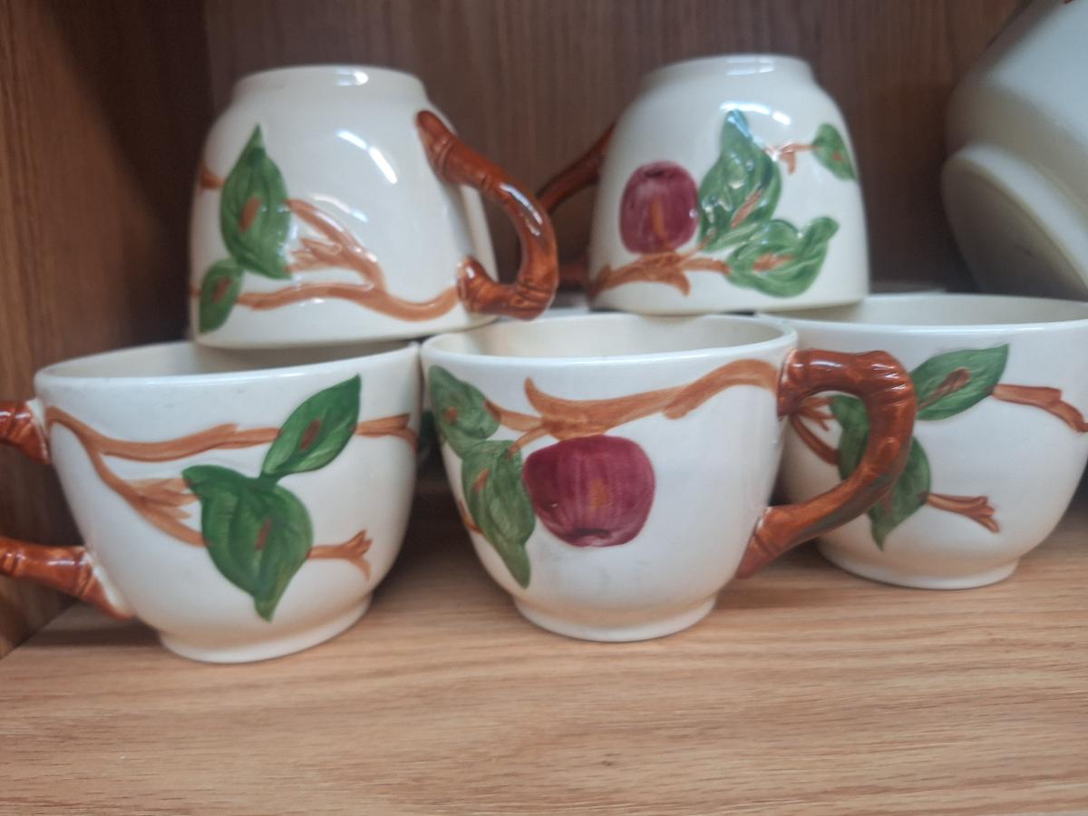 this includes all of the pieces you see on these two shelves. There are 8 coffee cups if you're not able to see them all to count. There is an additional bowl that's not in the first photo, it has a crack -see other photos for it.