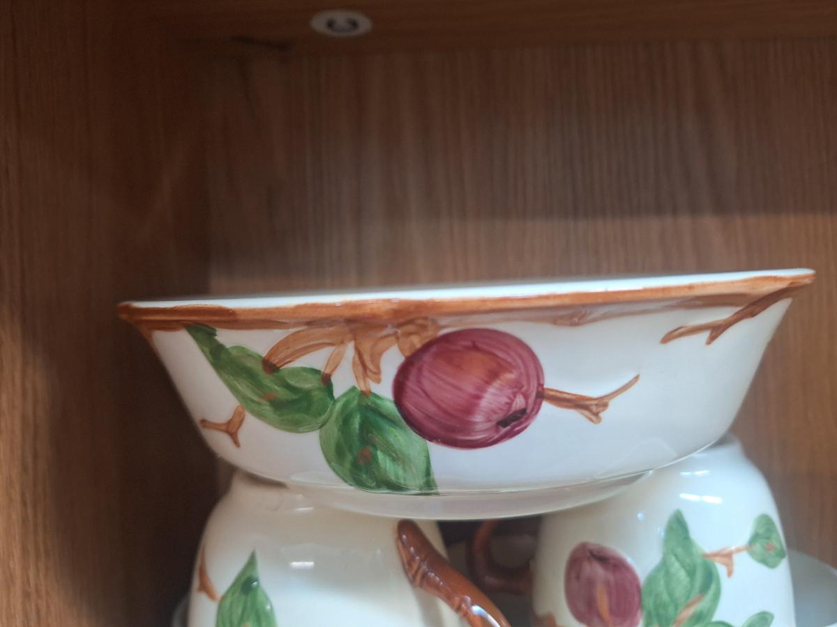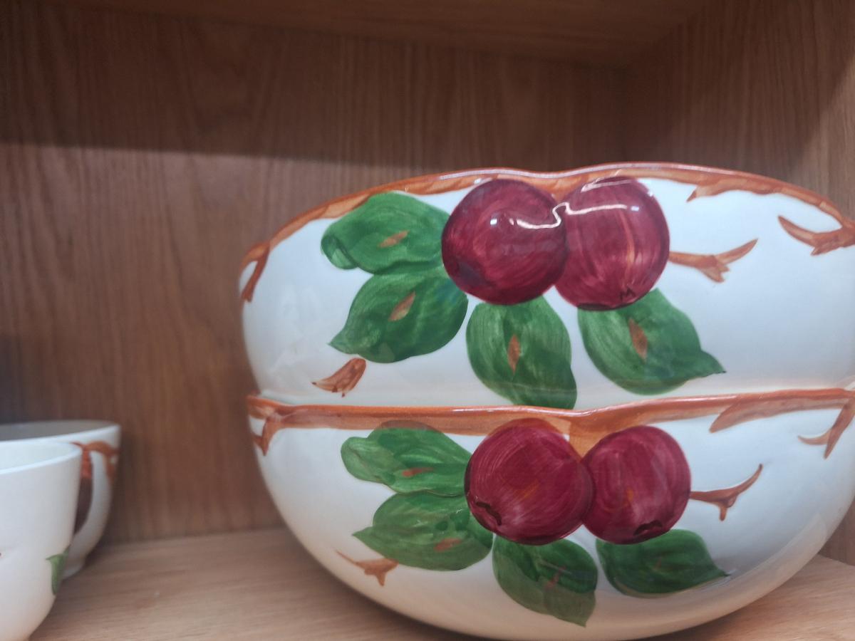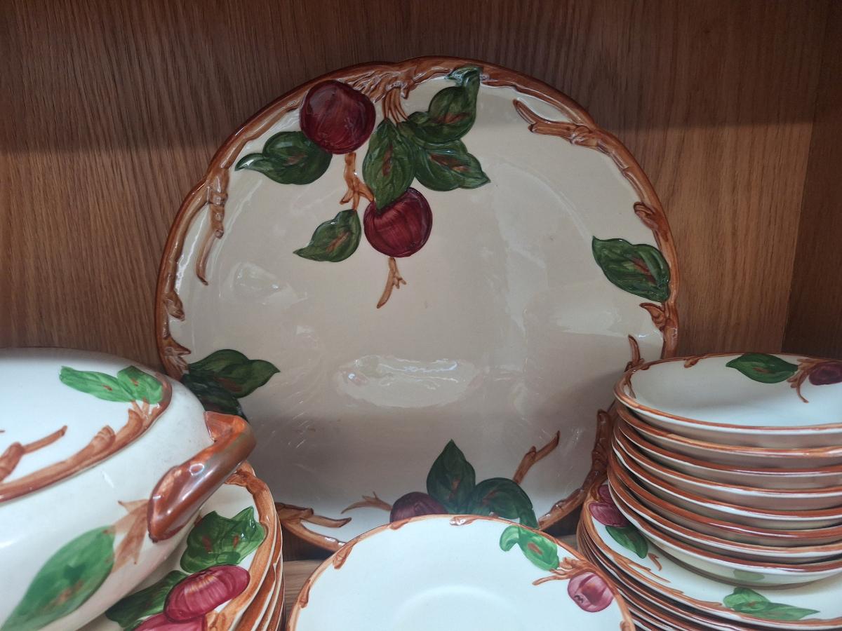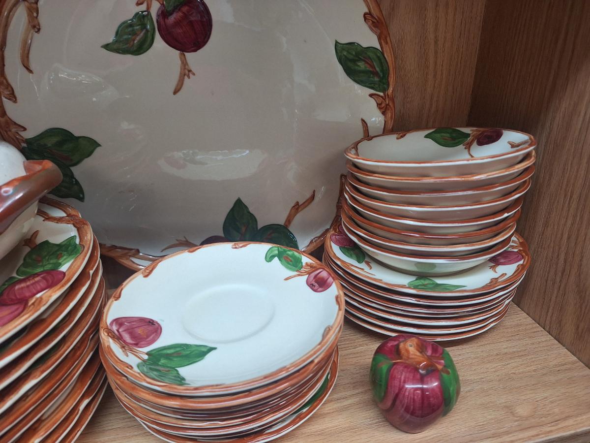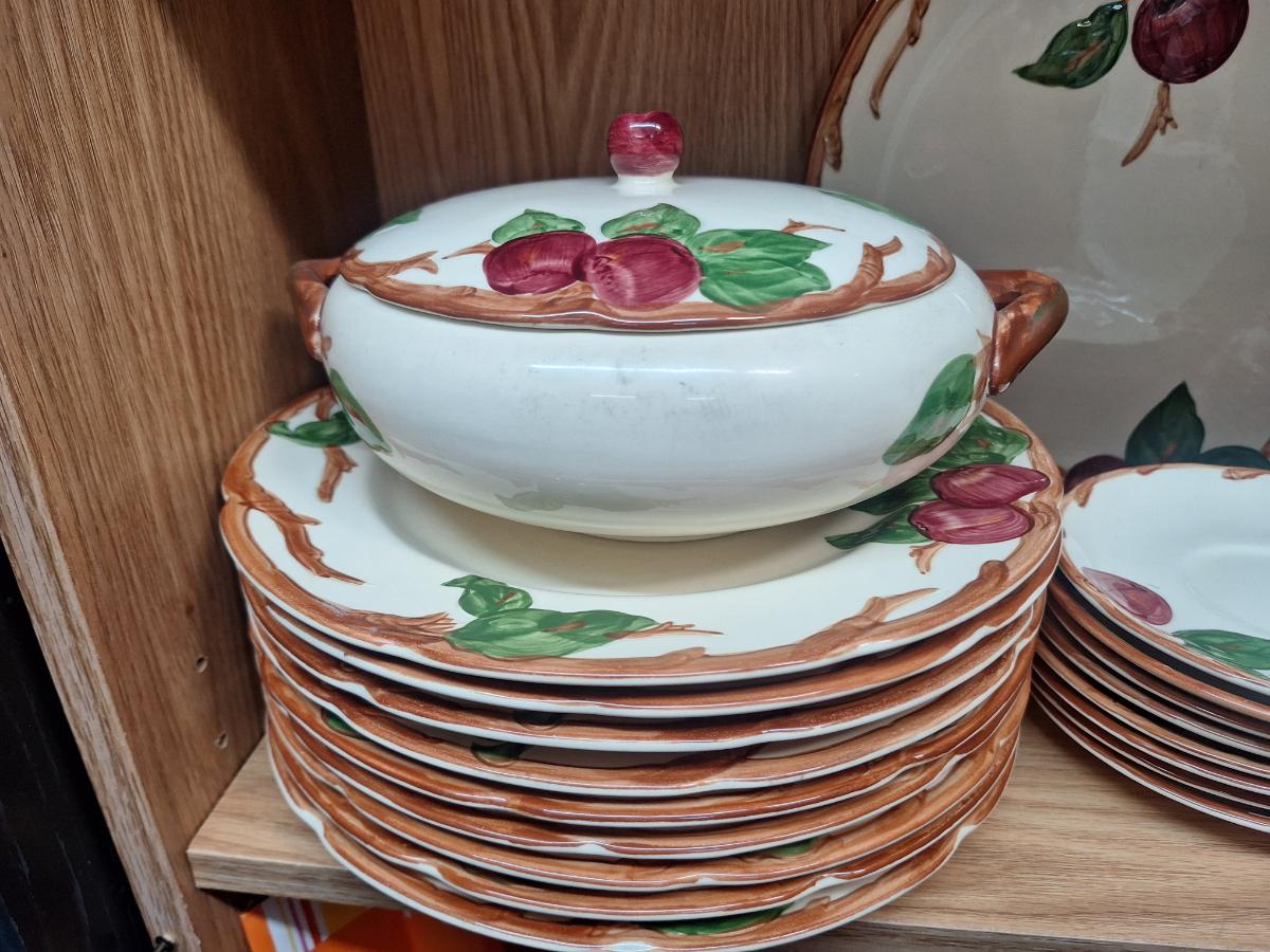 this includes all of the pieces you see on these two shelves. There are 8 coffee cups if you're not able to see them all to count. There is an additional bowl that's not in the first photo, it has a crack -see other photos for it.