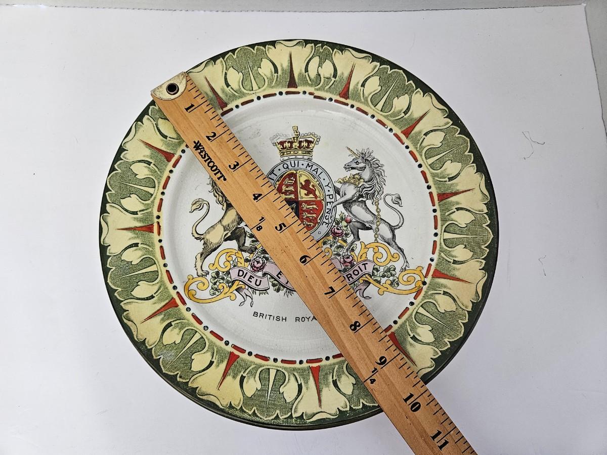 This is a vintage, antique Frank Beardmore & Co. Fenton plate from the "National Emblems" series. The plate features the intricately designed British Royal Arms crest in the center, which includes the iconic lion and unicorn, along with the mottos "DIEU ET MON DROIT" (God and my right) and "HONI SOIT QUI MAL Y PENSE" (Shame on him who thinks evil of it). It has an ornate green acanthus leaf and red berry border. Produced in Fenton, England, this earthenware pottery dates to between 1903 and 1913, making it a genuine piece of Edwardian-era English history.