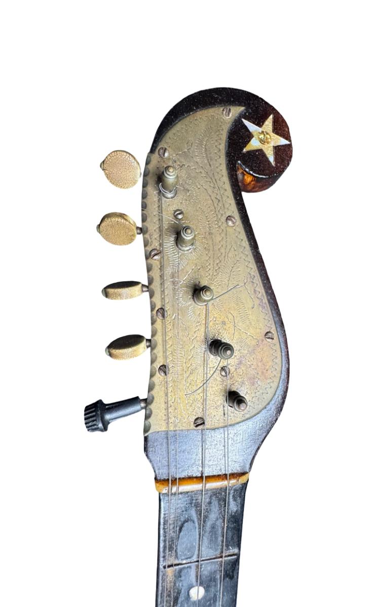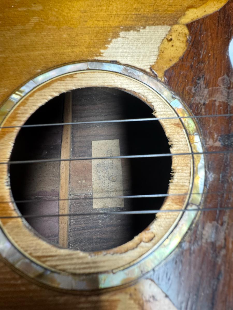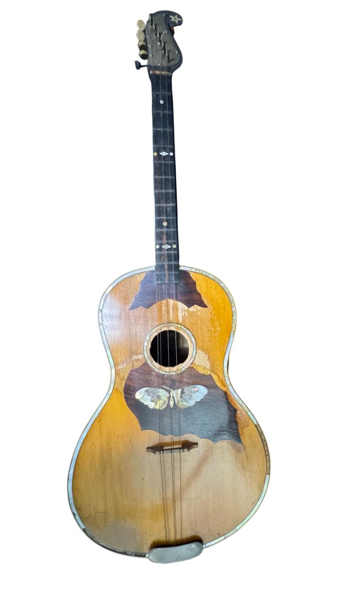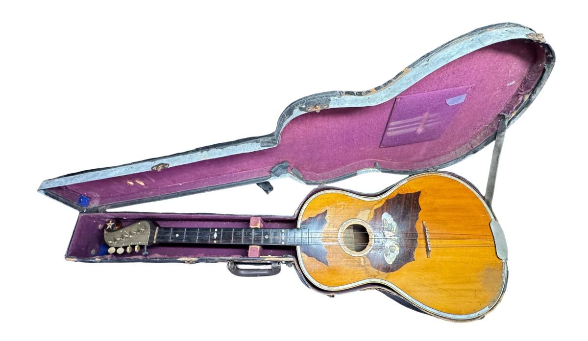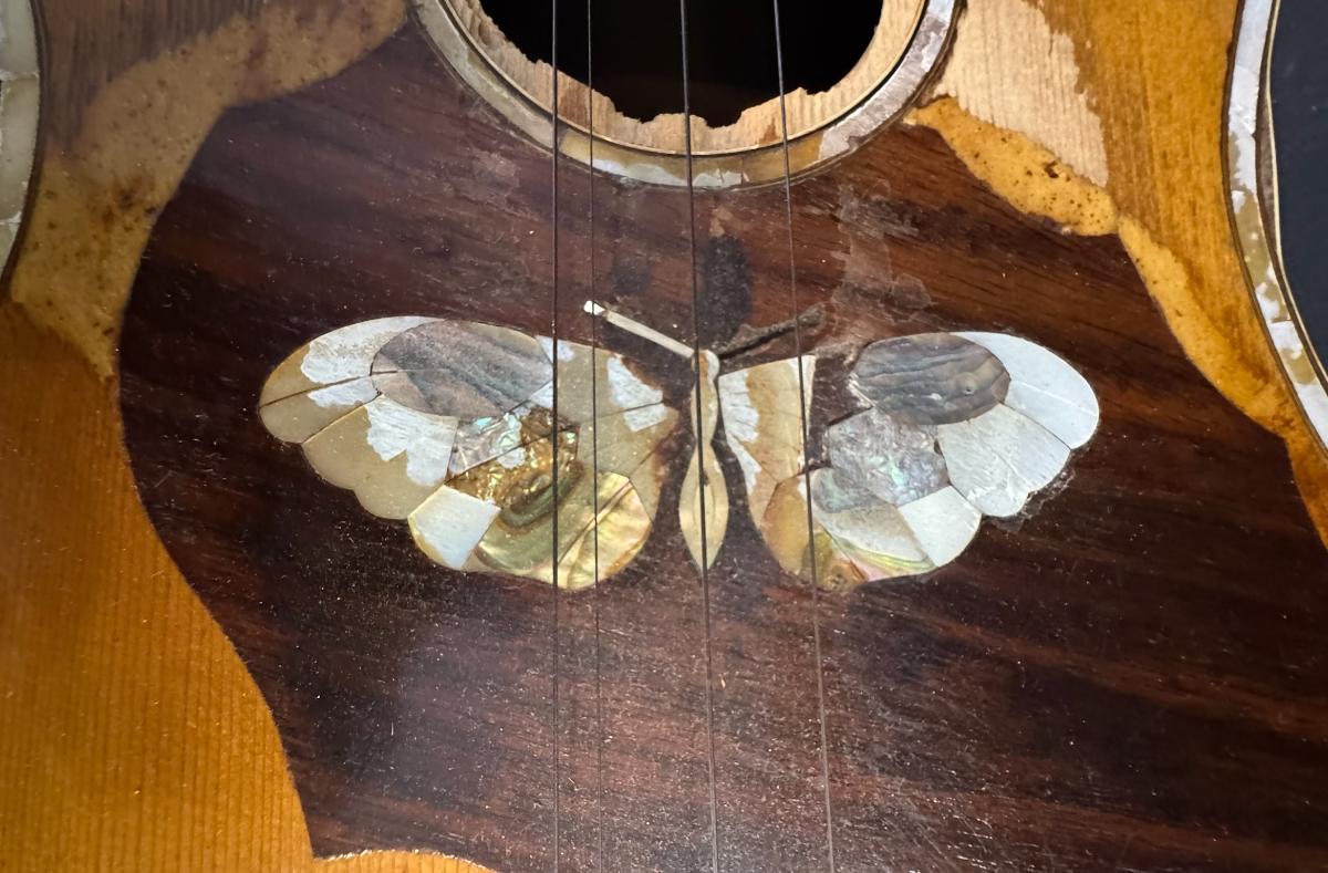 Includes vintage wood case. This guitar has an inlaid butterfly. Age related wear. [LI]