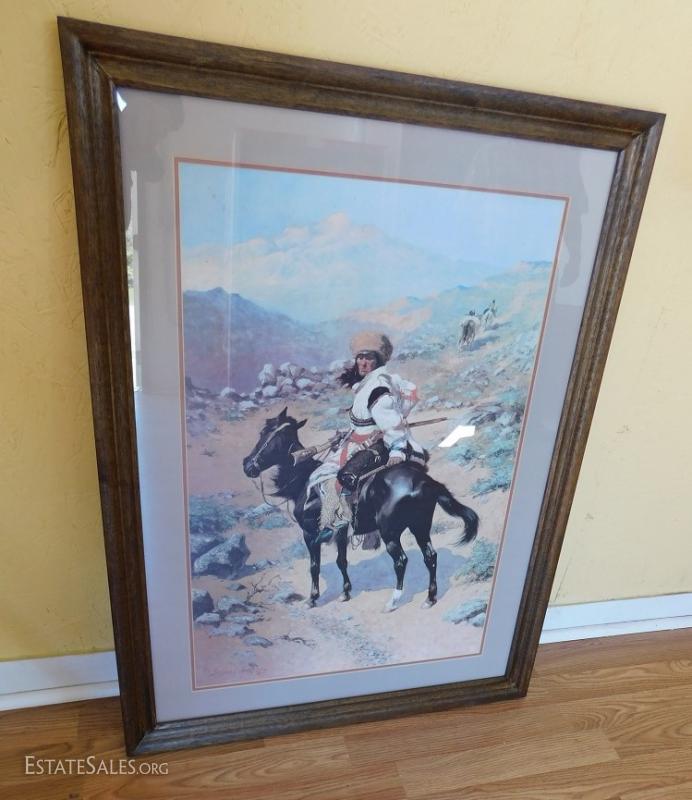 Remington Print "An Indian Trapper" Framed 39"h x 28"L. Reproduction 1902. In good condition