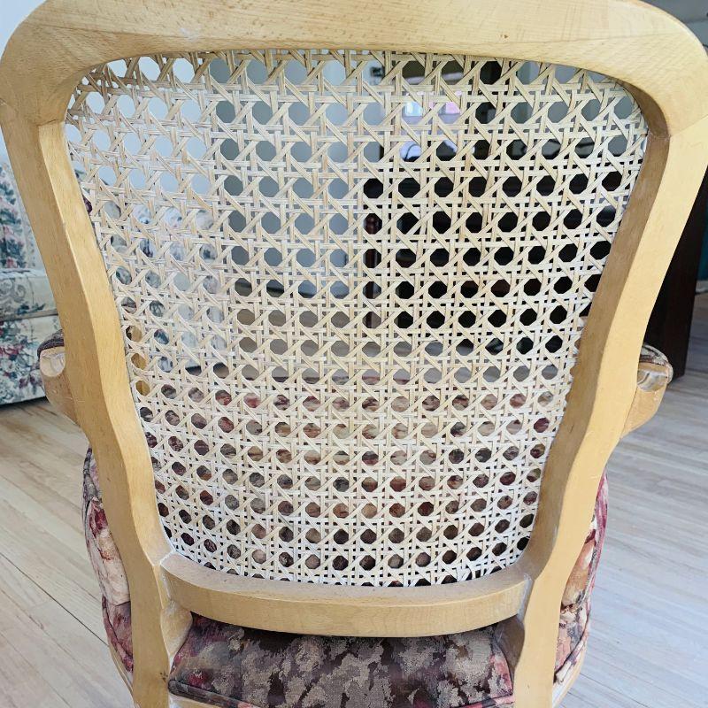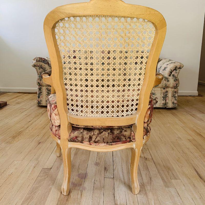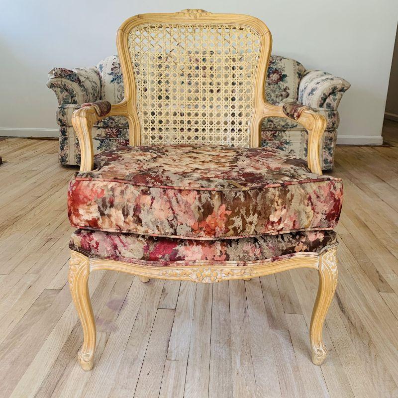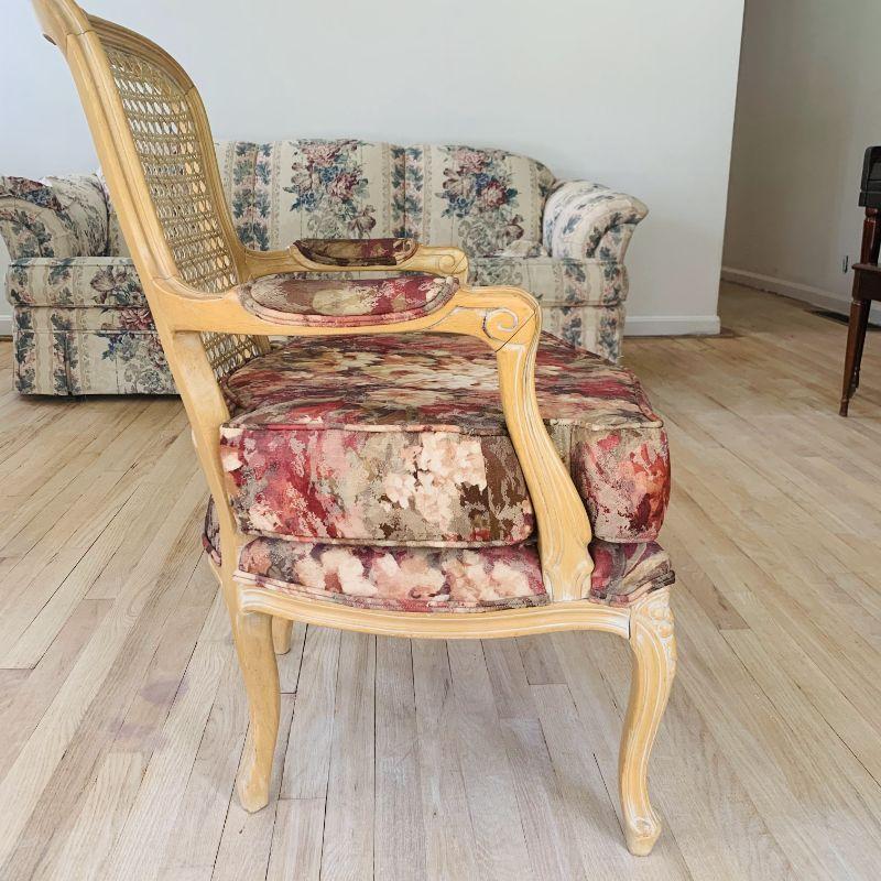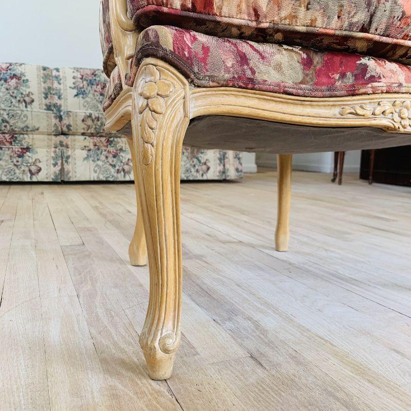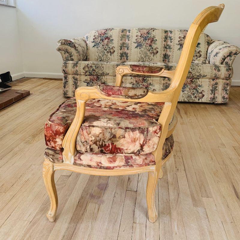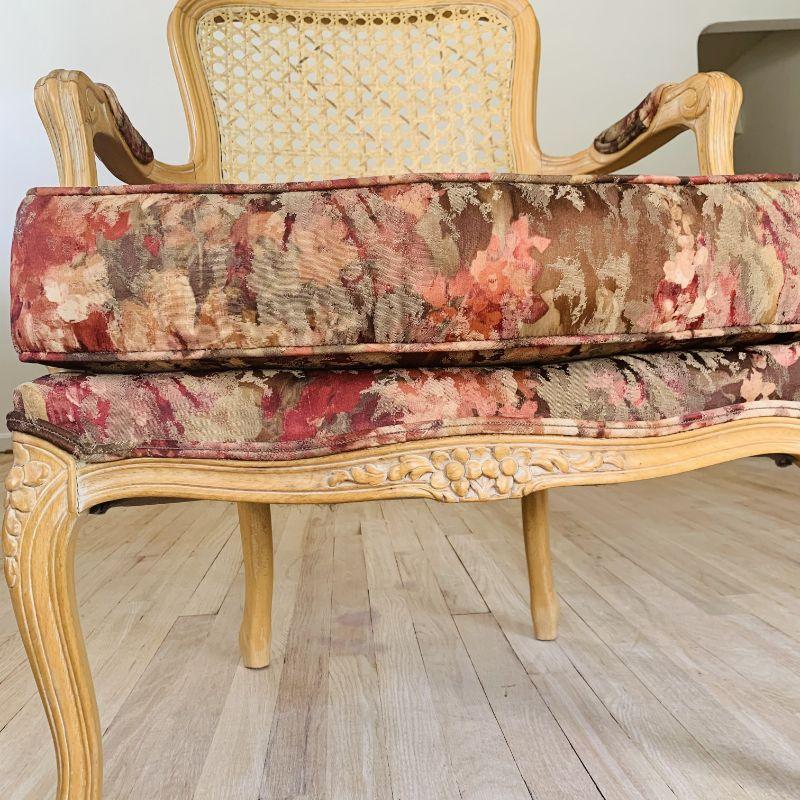 Upholstered arms, Cabriole legs, decorative apron, floral rose design on cushions