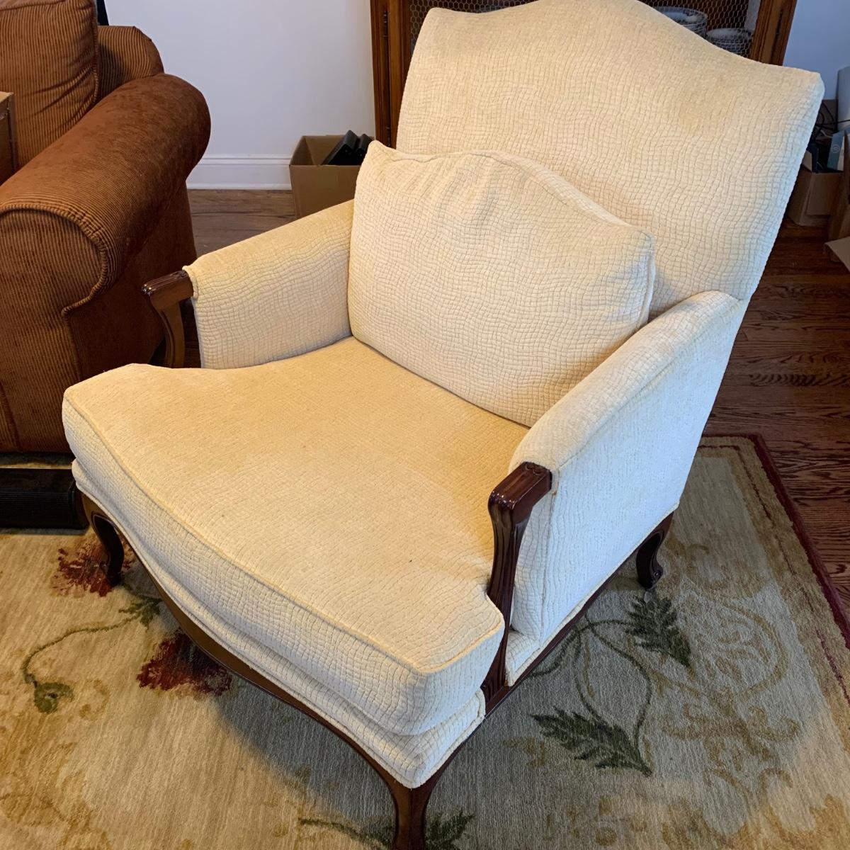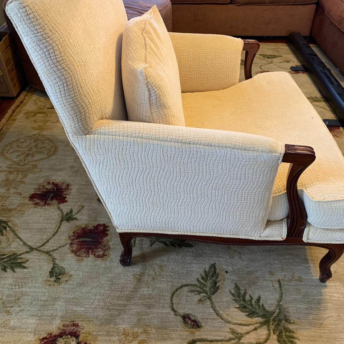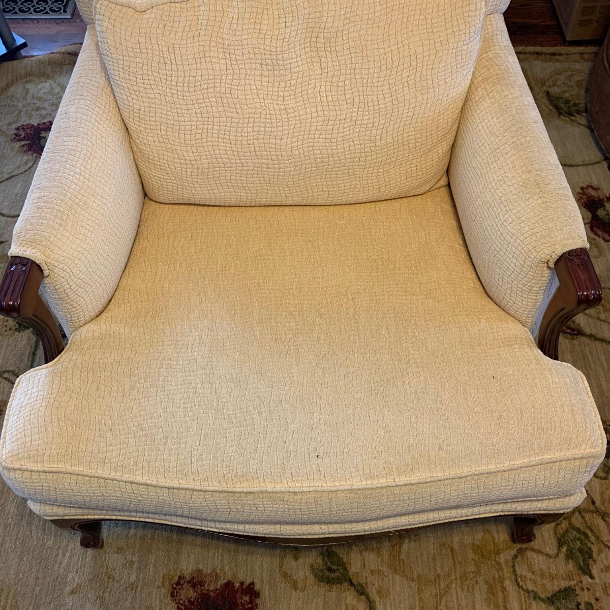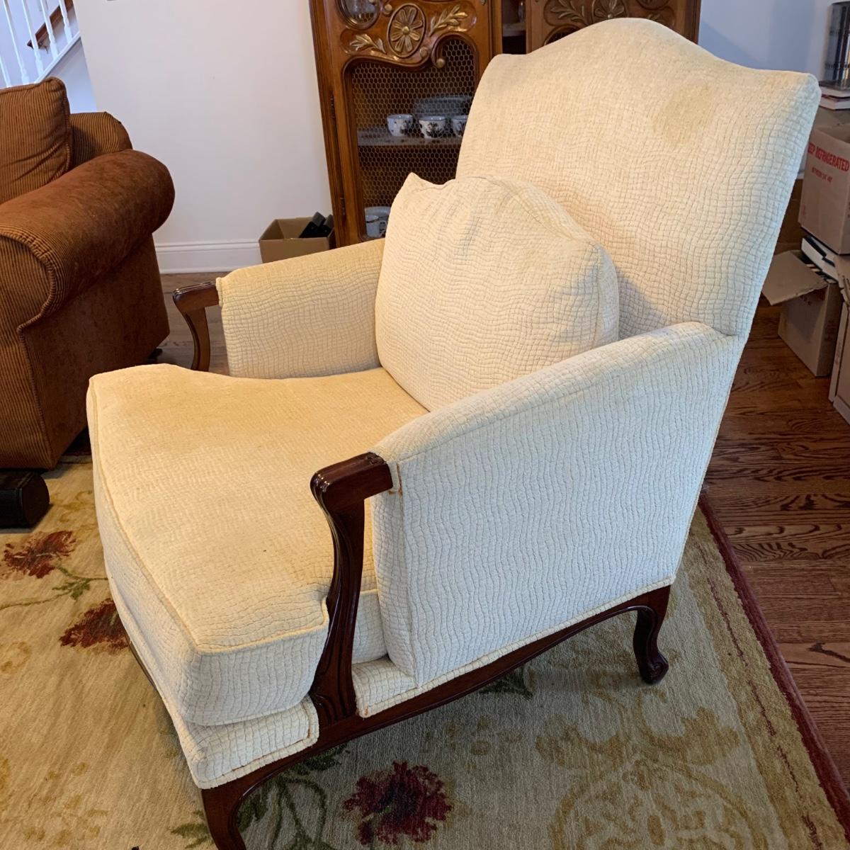Vintage French Louis-style oversized armchair with solid wood arms and footing. Chair is upholstered with ivory-colored fabric and measures approximately, 33” x 31” x 38”H with a seat height of 17”H. Headrest is slightly discolored, but it appears that it could be cleaned. Please see photos for more details.