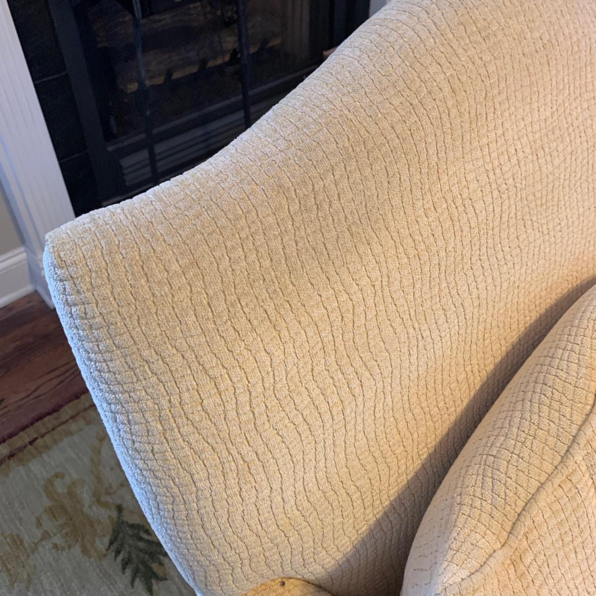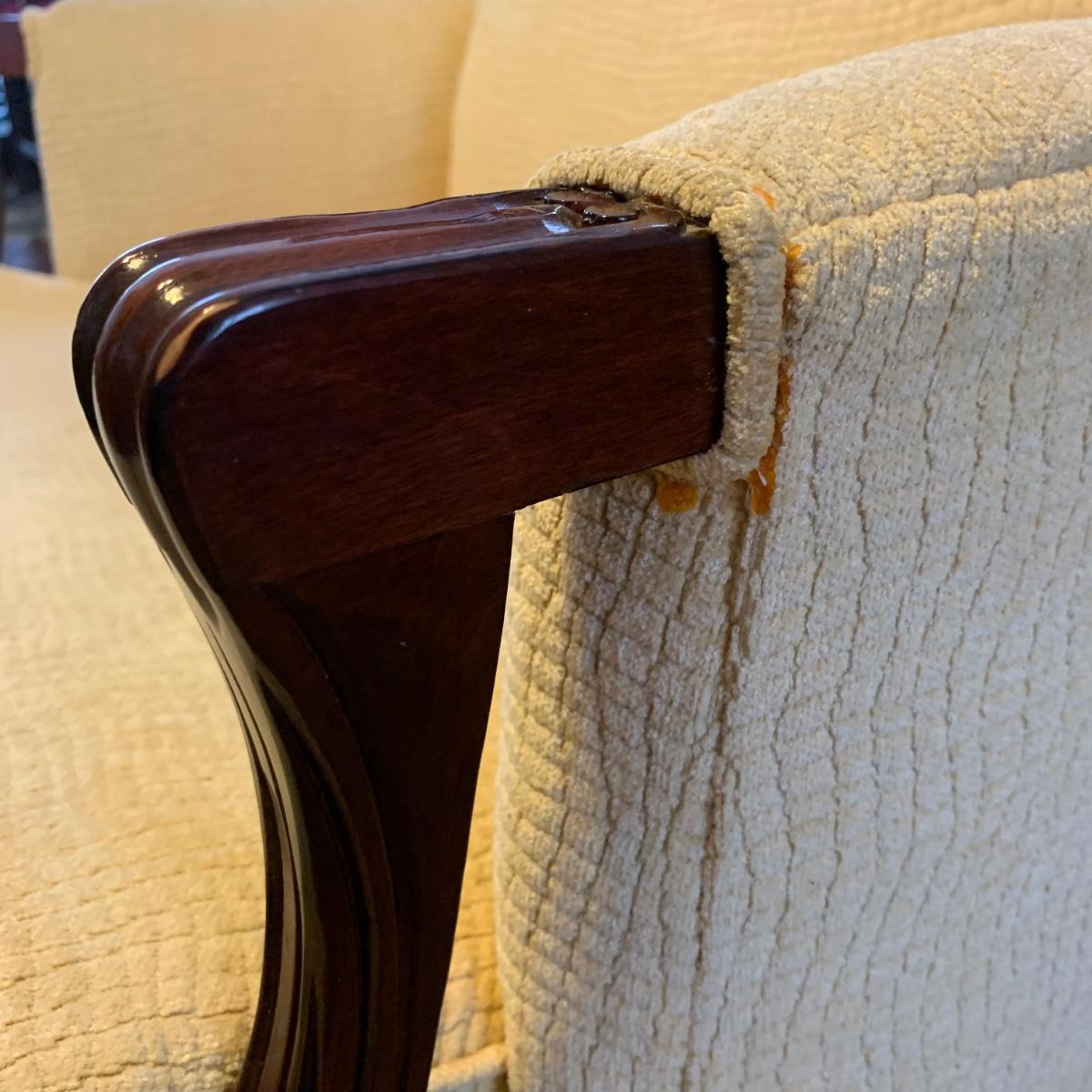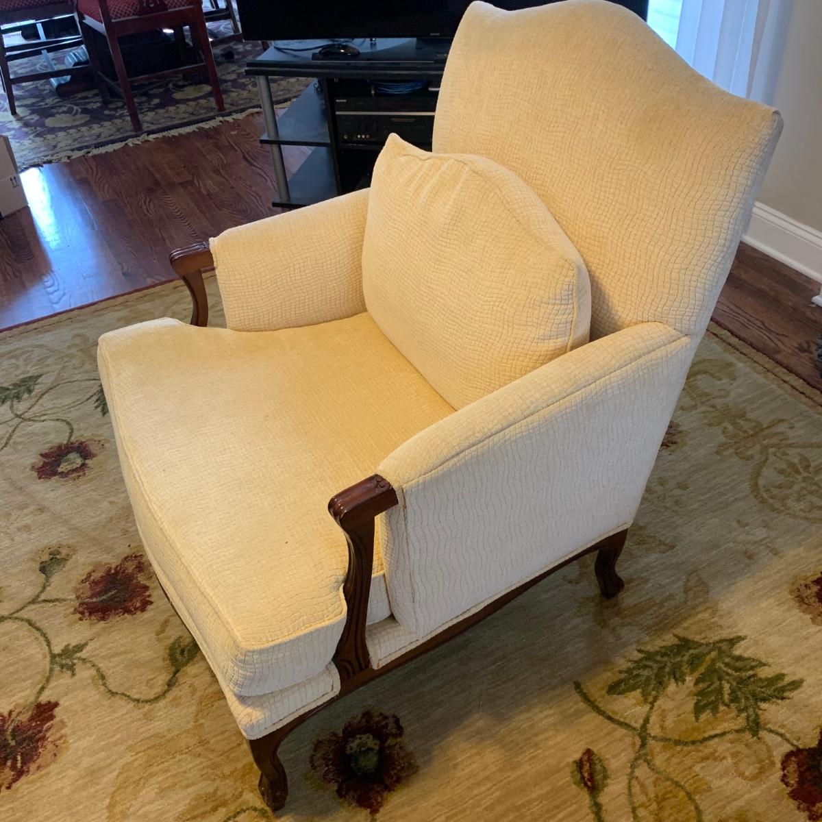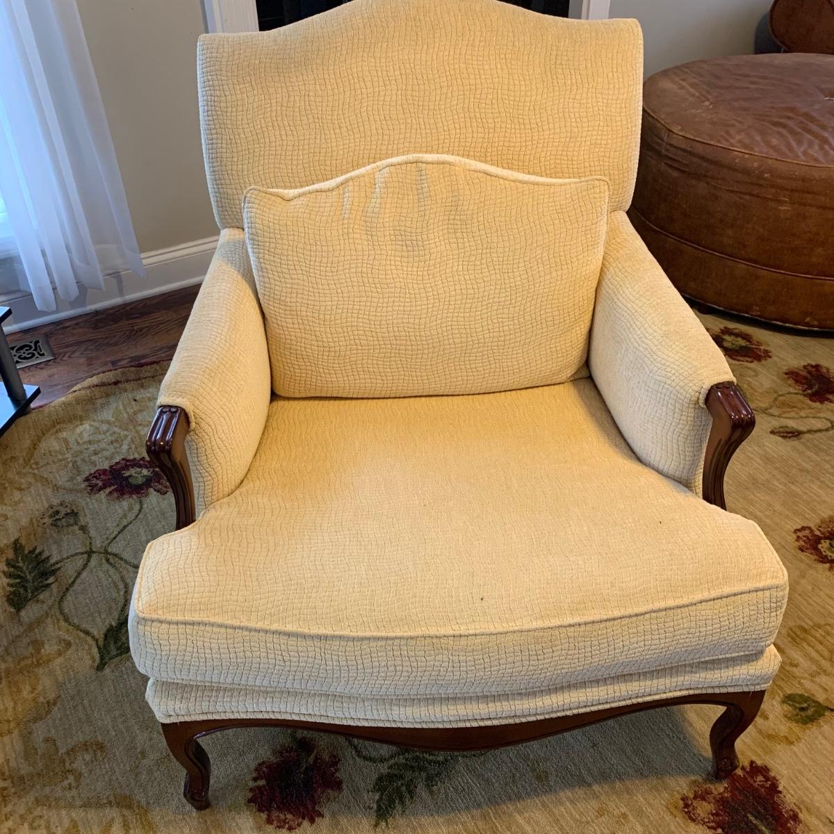 Vintage French Louis-style oversized armchair with solid wood arms and footing. Chair is upholstered with ivory-colored fabric and measures approximately, 33” x 31” x 38”H with a seat height of 17”H. Headrest is slightly discolored, but it appears that it could be cleaned. Please see photos for more details.