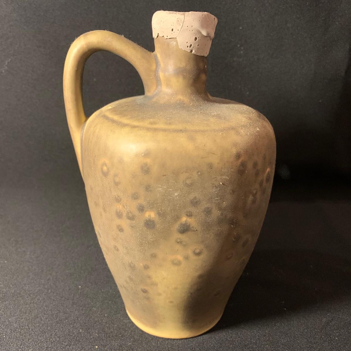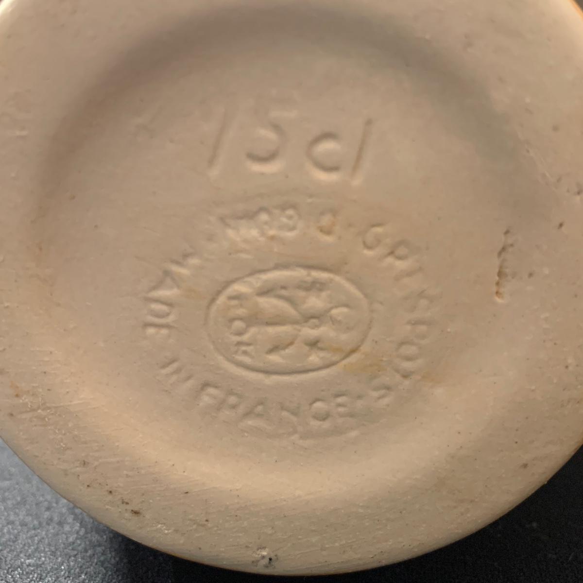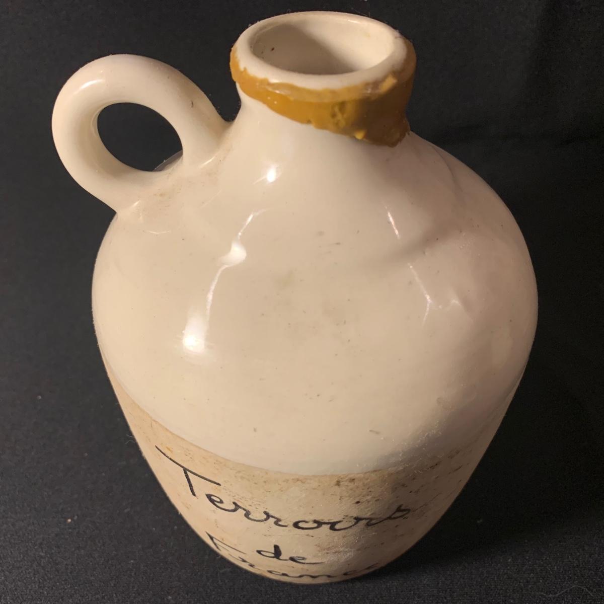 Vintage olive oil jugs and lidded garlic roaster. Olive oil jugs are handmade from France. Please see photos for more details. Tallest jug measures, 4”D x 8”H.