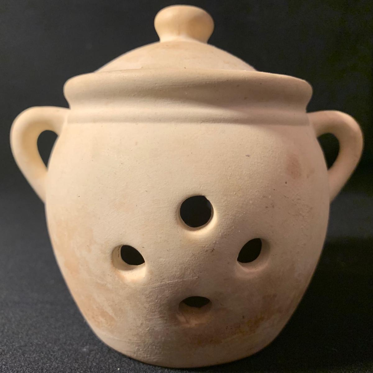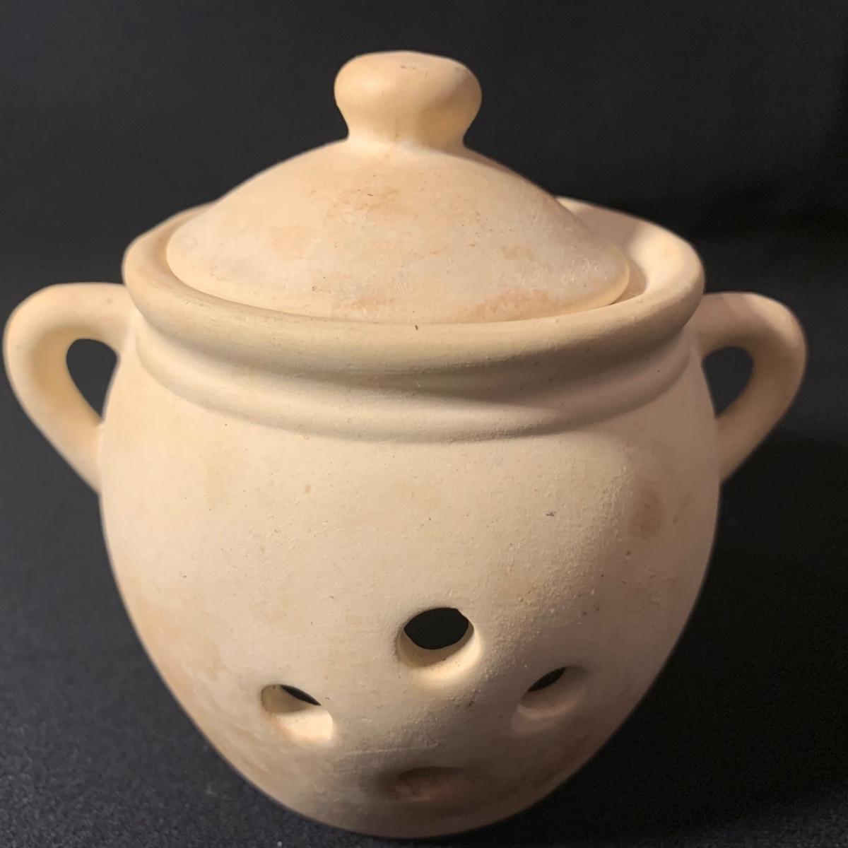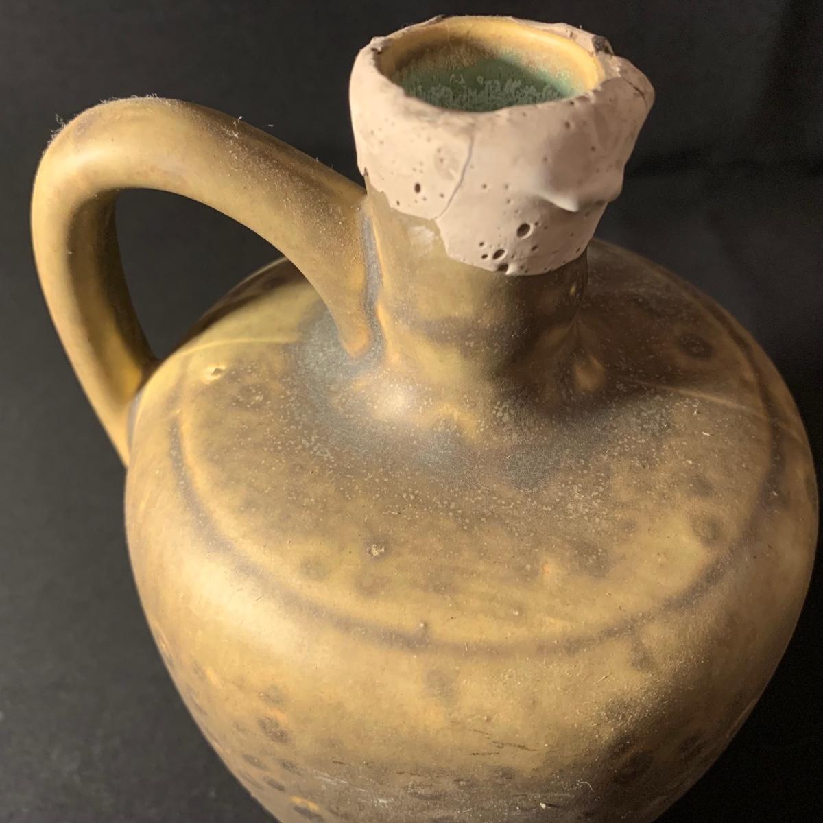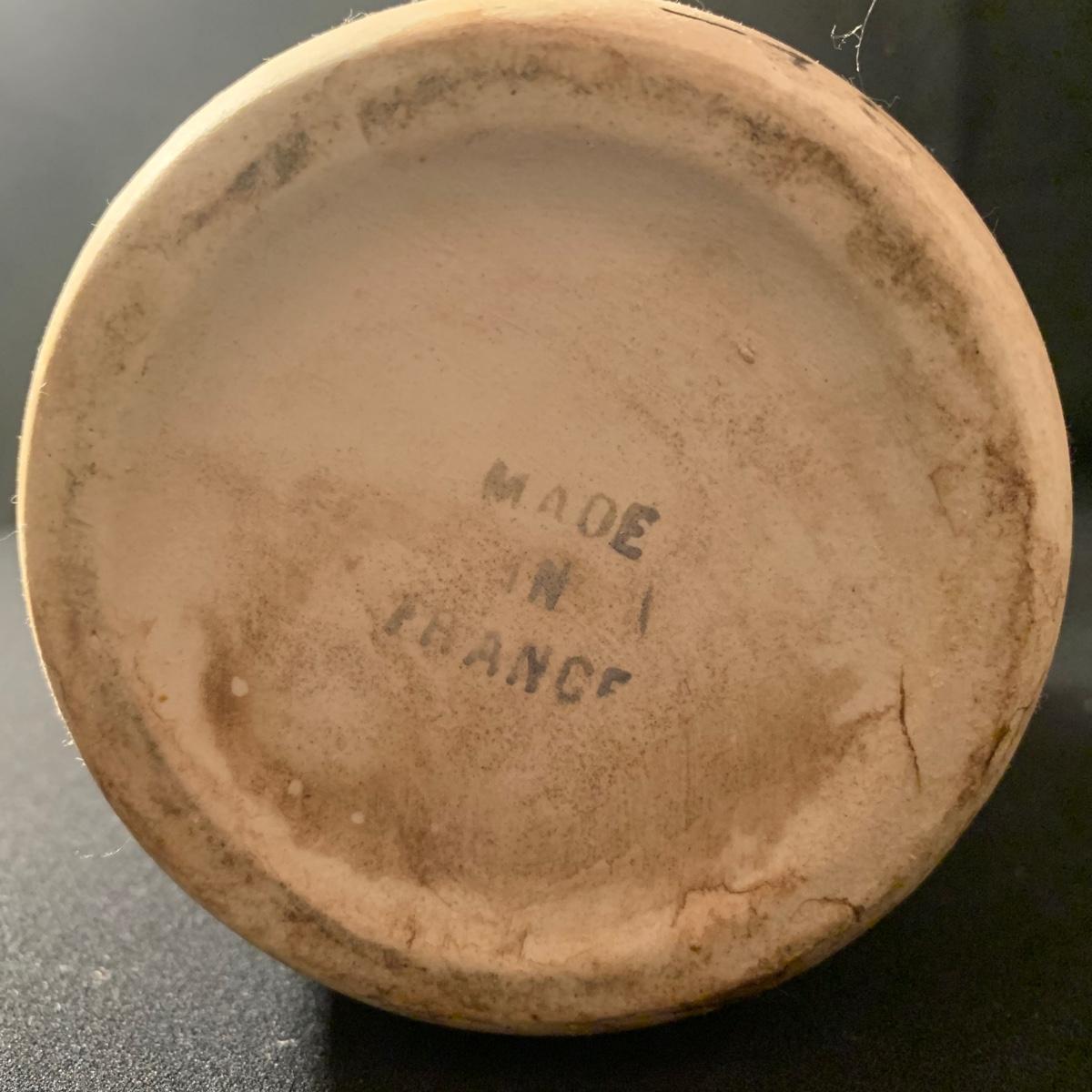 Vintage olive oil jugs and lidded garlic roaster. Olive oil jugs are handmade from France. Please see photos for more details. Tallest jug measures, 4”D x 8”H.