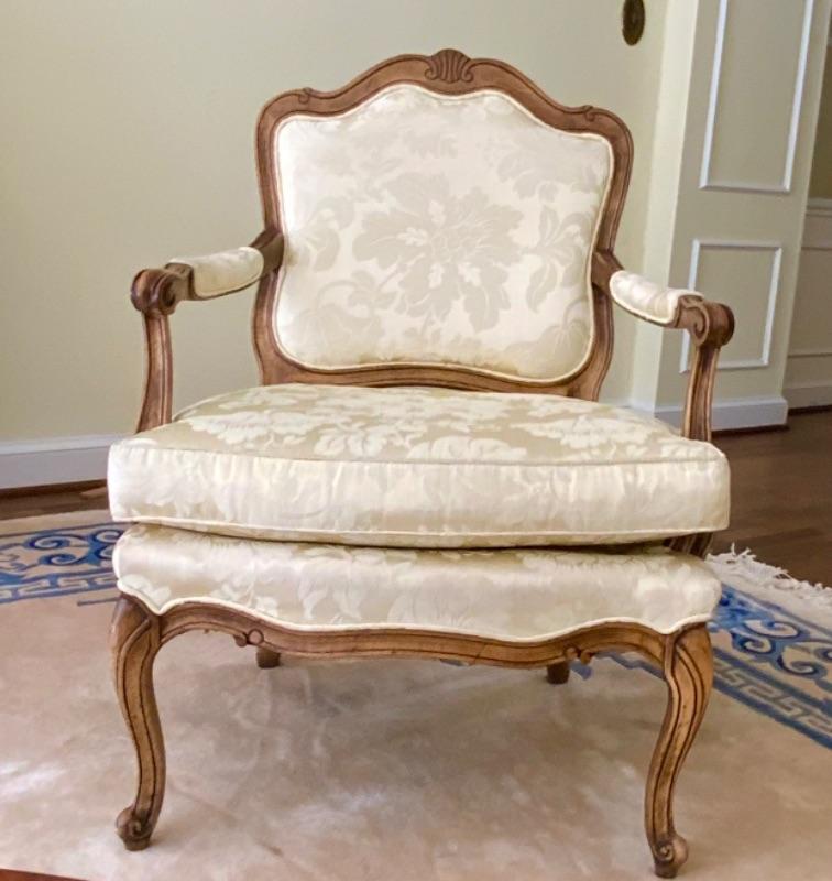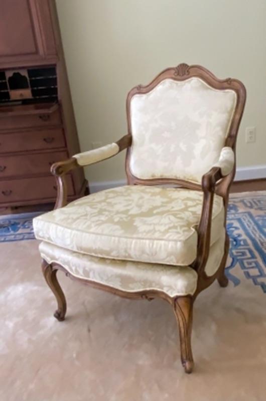 Vintage 60s era French Provincial well proportioned large arm chair. Seems to be walnut with etched accents, cabriole legs, nice pale yellow damask.