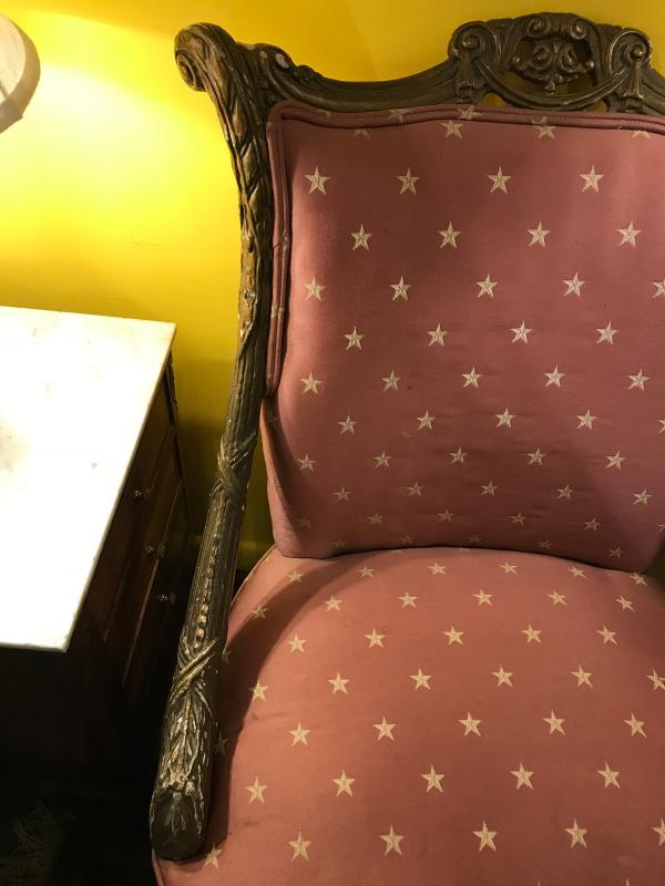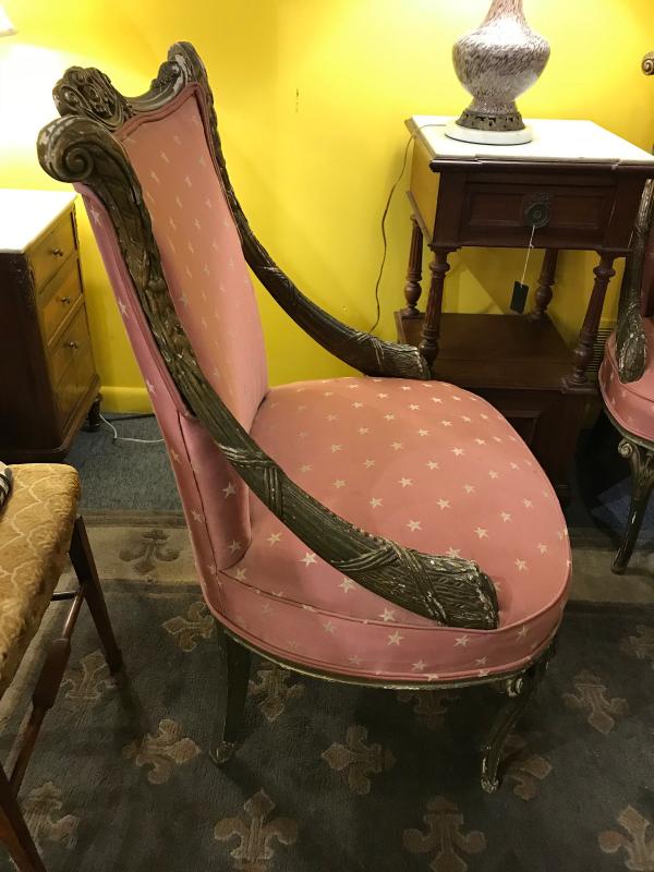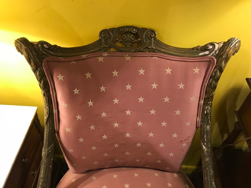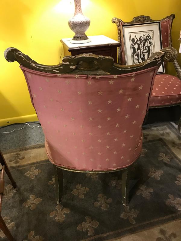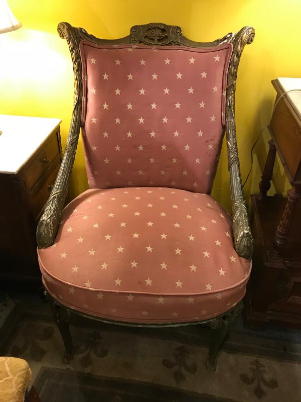 Vintage 1920's - 1940's French style club chair with its original gilt finish. Gilt finish is in as found shabby, chippy condition with a great look. Frame is elaborately carved all over. Top rail is pierced and carved with scrolls and swags. Arms/hip rests are carved cross tied bundles of reeds terminating in acanthus leaves, scrolls, and bell flowers. Curved legs are pierced and carved scrolls and bell flowers. Upholstered in pink fabric with woven stars. These are old Hollywood glamor at its best! 25" x 27" x 38" H Pair available.