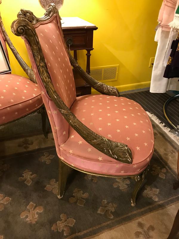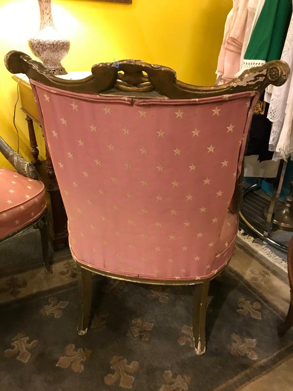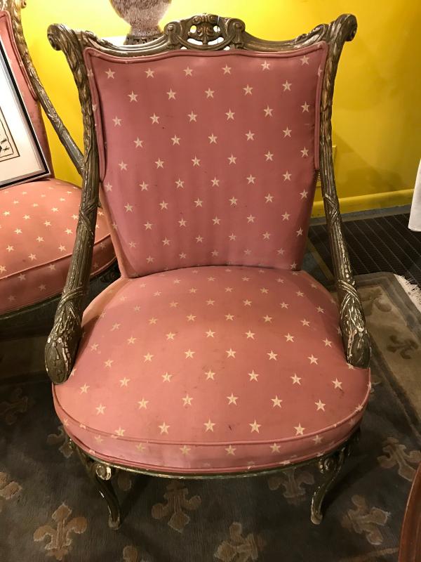 Vintage 1920's - 1940's French style club chair with its original gilt finish. Gilt finish is in as found shabby, chippy condition with a great look. Frame is elaborately carved all over. Top rail is pierced and carved with scrolls and swags. Arms/hip rests are carved cross tied bundles of reeds terminating in acanthus leaves, scrolls, and bell flowers. Curved legs are pierced and carved scrolls and bell flowers. Upholstered in pink fabric with woven stars. These are old Hollywood glamor at its best! 25" x 27" x 38" H Pair available.