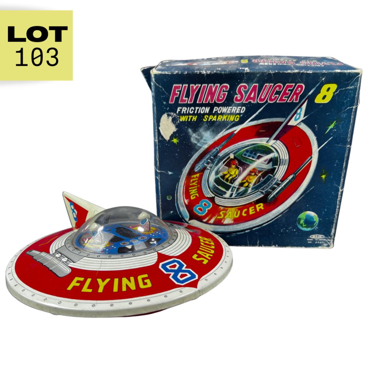 This Vintage Friction Toy, the Flying Saucer, was produced by HAJI in the mid 1900s. Created in Japan, there have been many iterations of this flying saucer, each numbered. This saucer comes with its original box. This toy is a FRICTION toy, and works, but is hard to show. Please see photos for details and condition. **|** ::: Shipping is available on this lot. If you require shipping you must let us know at the close of the auction. We will coordinate with you after the item has been won. Shipping fees will include insurance up to or exceeding the value of all items being mailed. If you have any questions regarding this lot please contact the auctioneer either via this website, by direct email or by phone. PICK UP TIMES and other important information can be found in the TERMS and DESCRIPTION of the auction. Please take a look for pertinent information. Thanks!