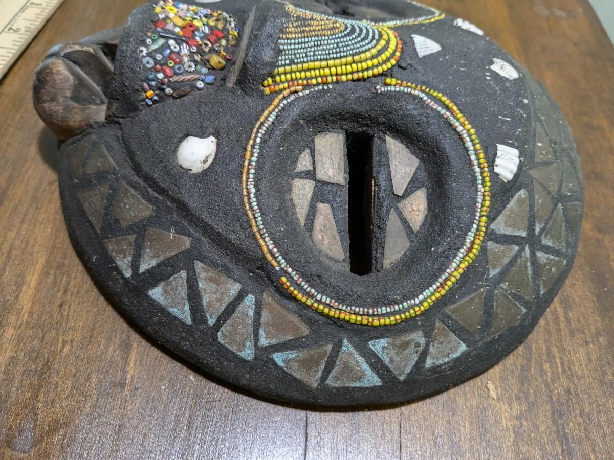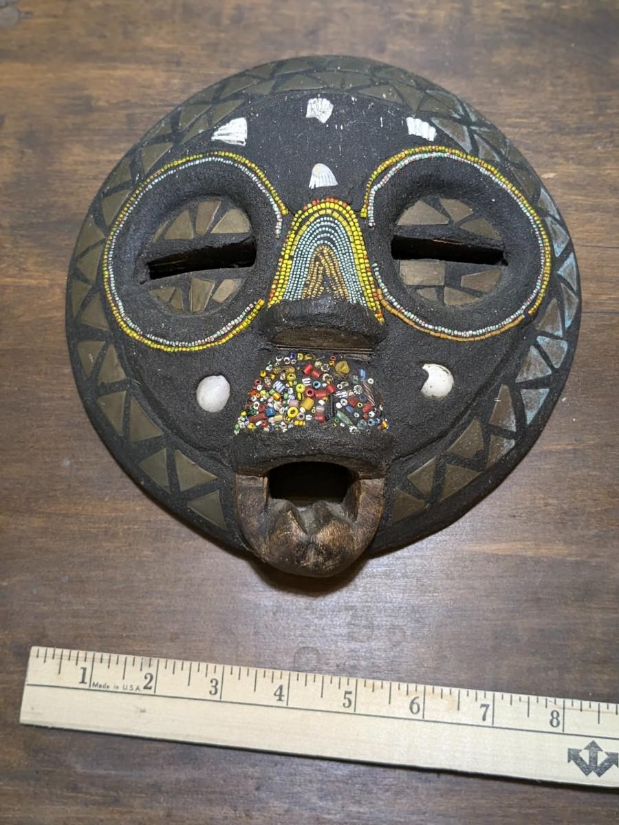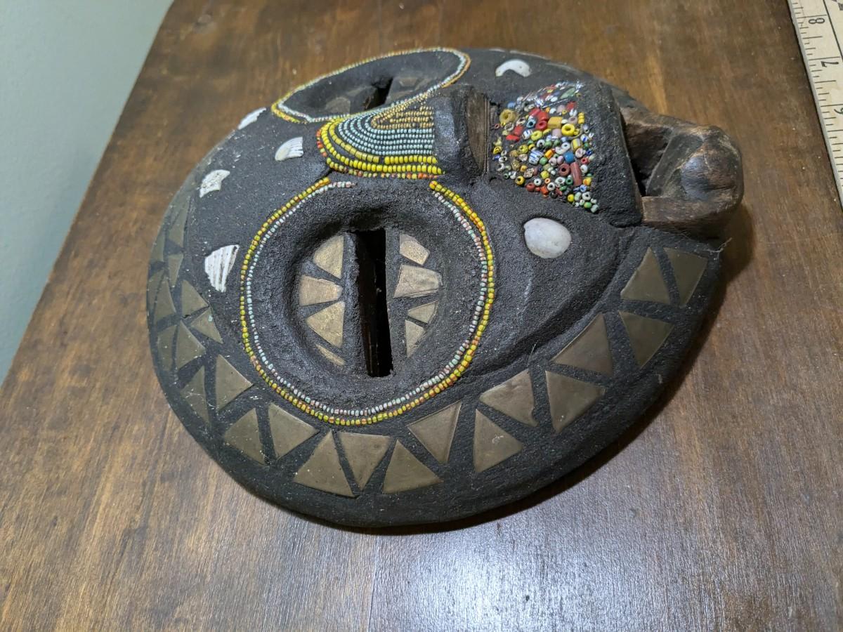 Vintage, from Ghana, Round Wood Tribal Mask Inlay Glass Beads, Copper