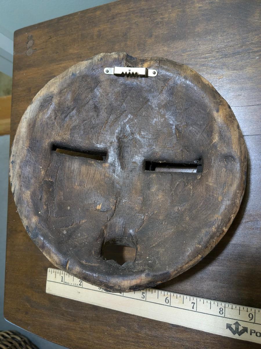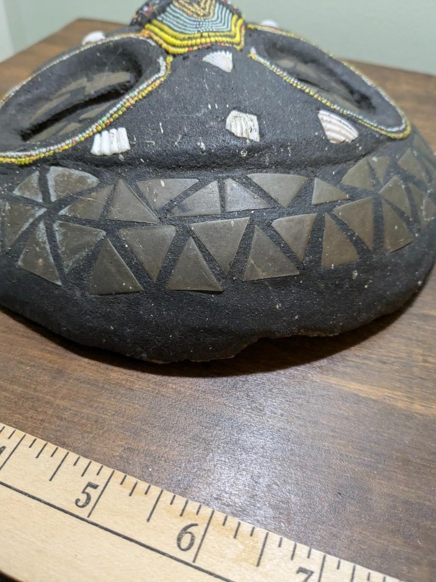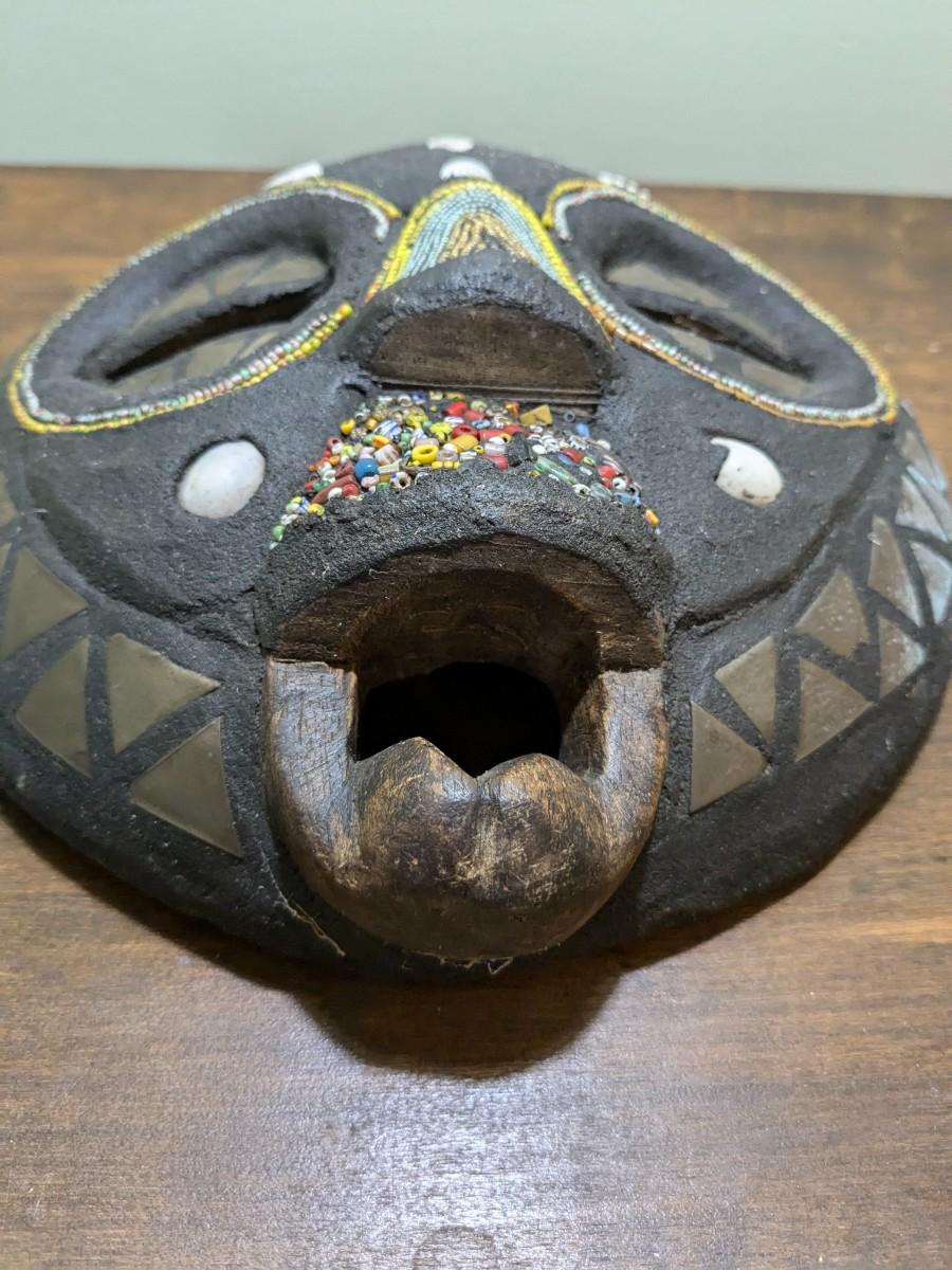 Vintage, from Ghana, Round Wood Tribal Mask Inlay Glass Beads, Copper