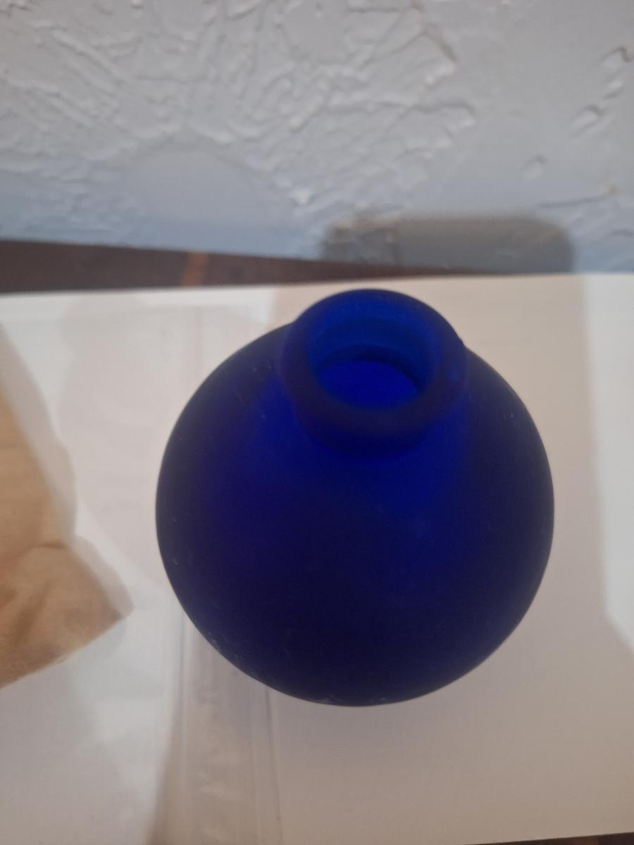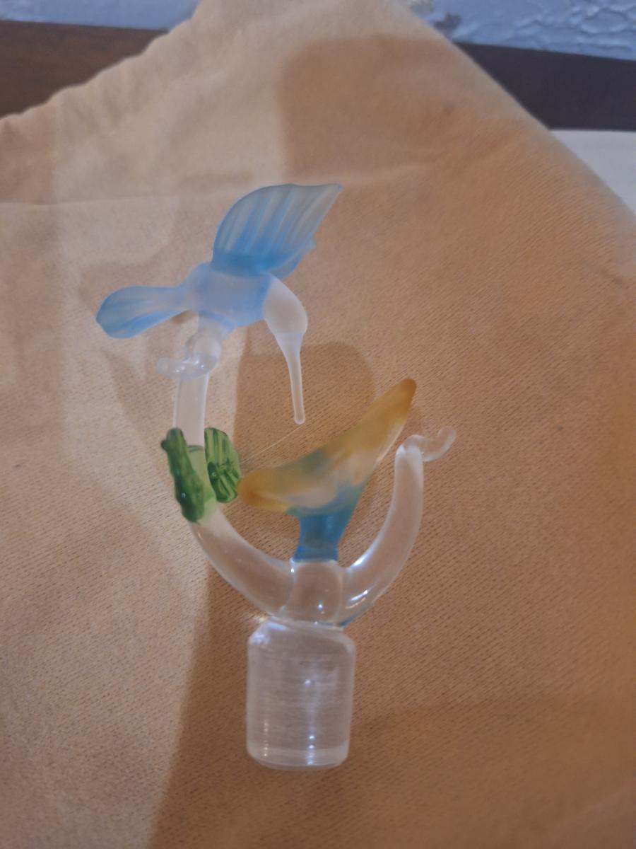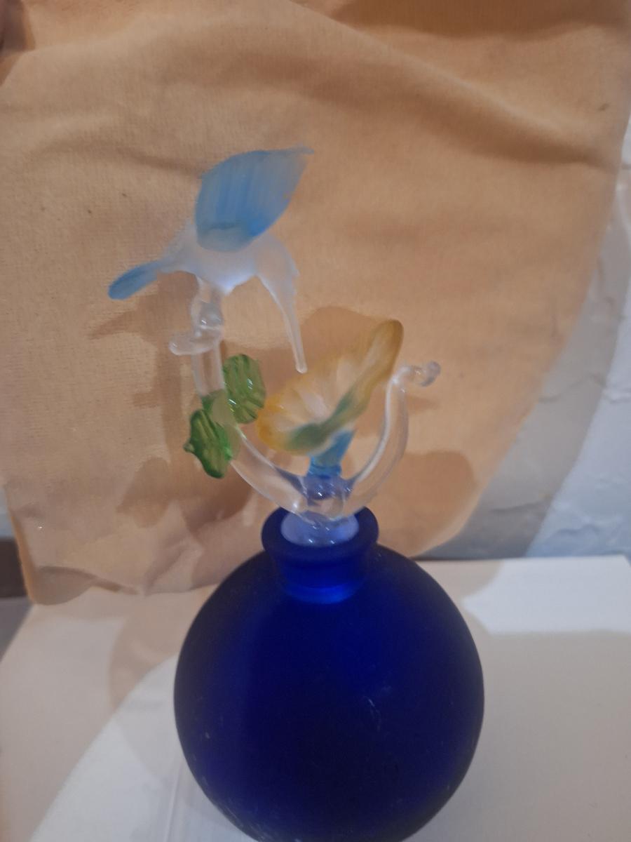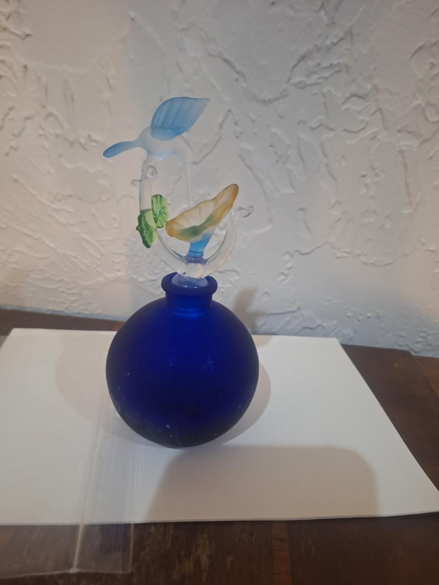Vintage frosted cobalt blue satin glass perfume bottle with hummingbird glass stopper