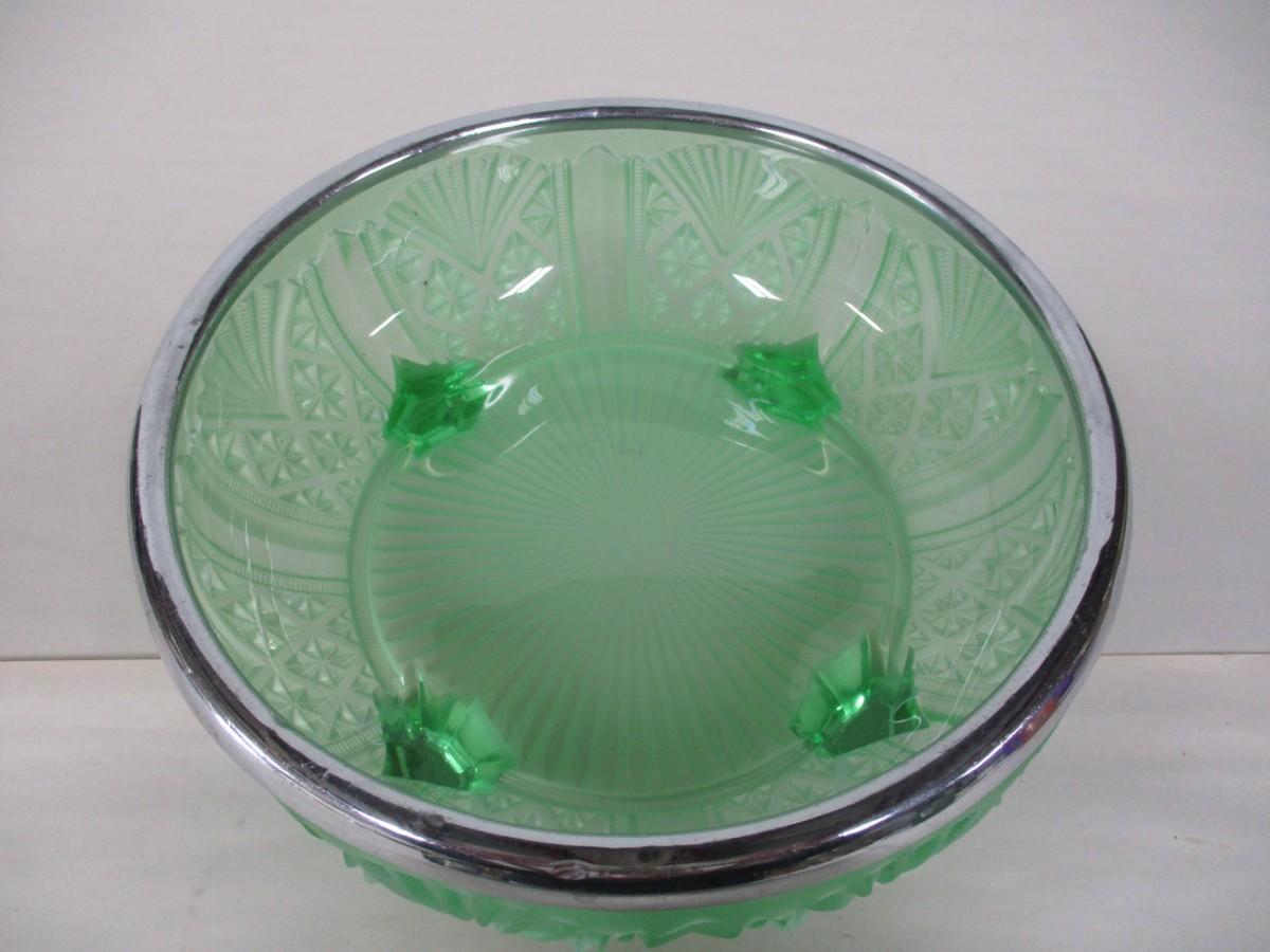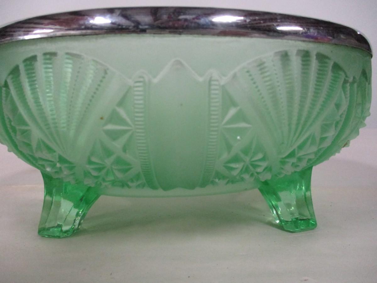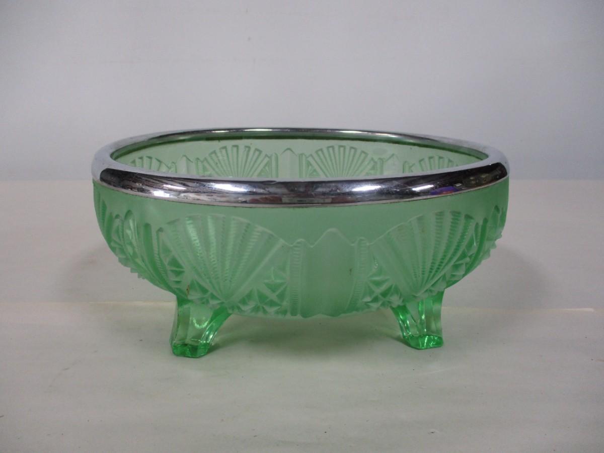 Vintage Frosted Green Pressed Glass Footed Bowl With Metal Rim