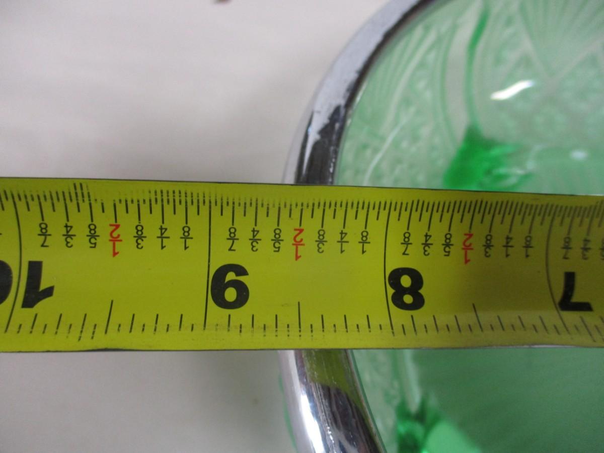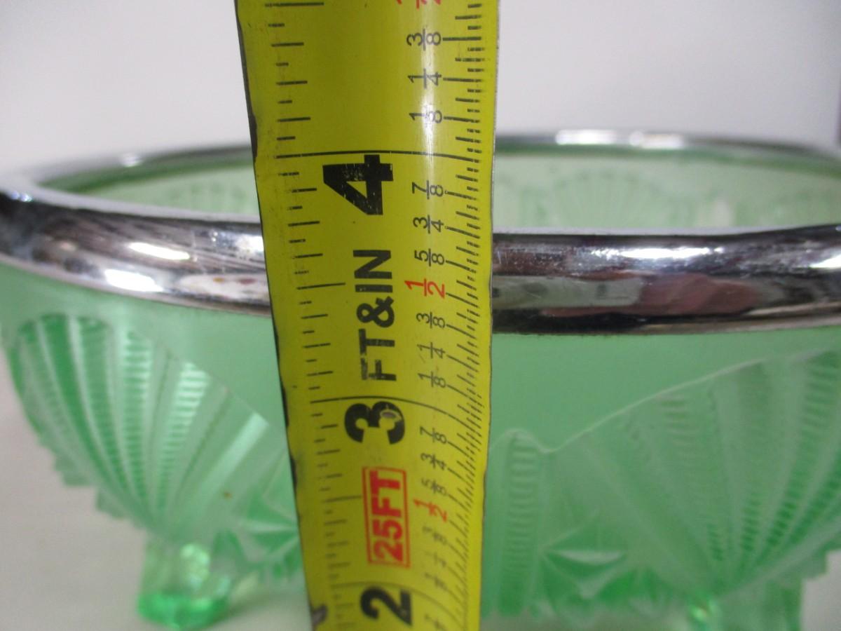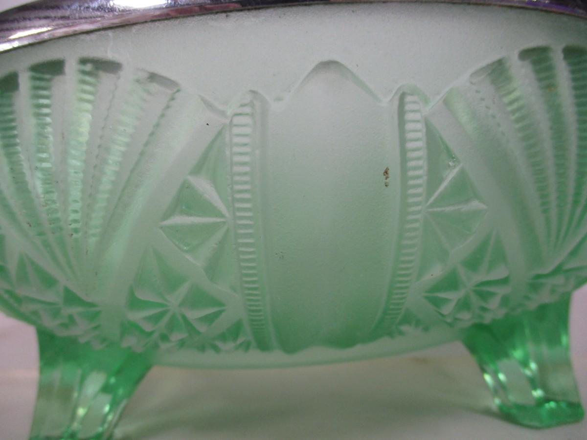 Vintage Frosted Green Pressed Glass Footed Bowl With Metal Rim