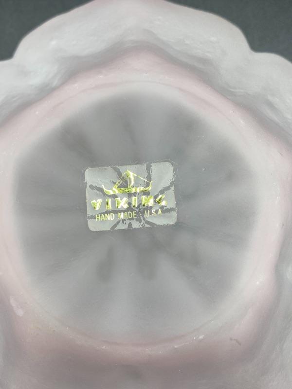 Beautiful frosted pale pink lotus flower dish from Viking Glass. Could be used as a trinket dish, a candle base, or as is. Displays nicely. About 6" size. Has original Viking sticker on the bottom.
