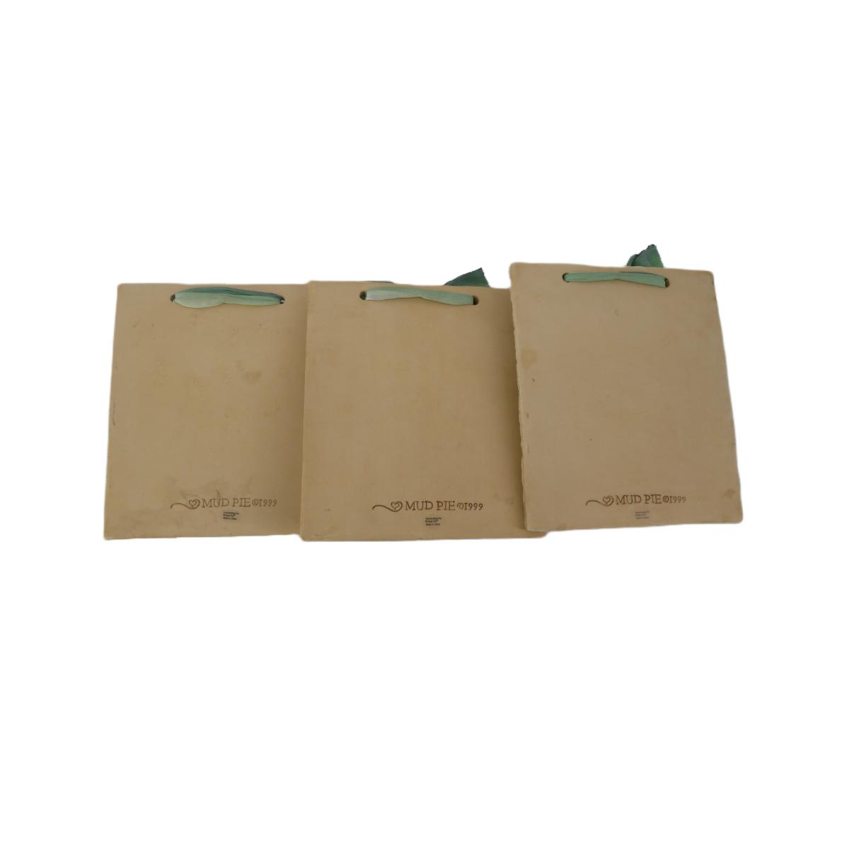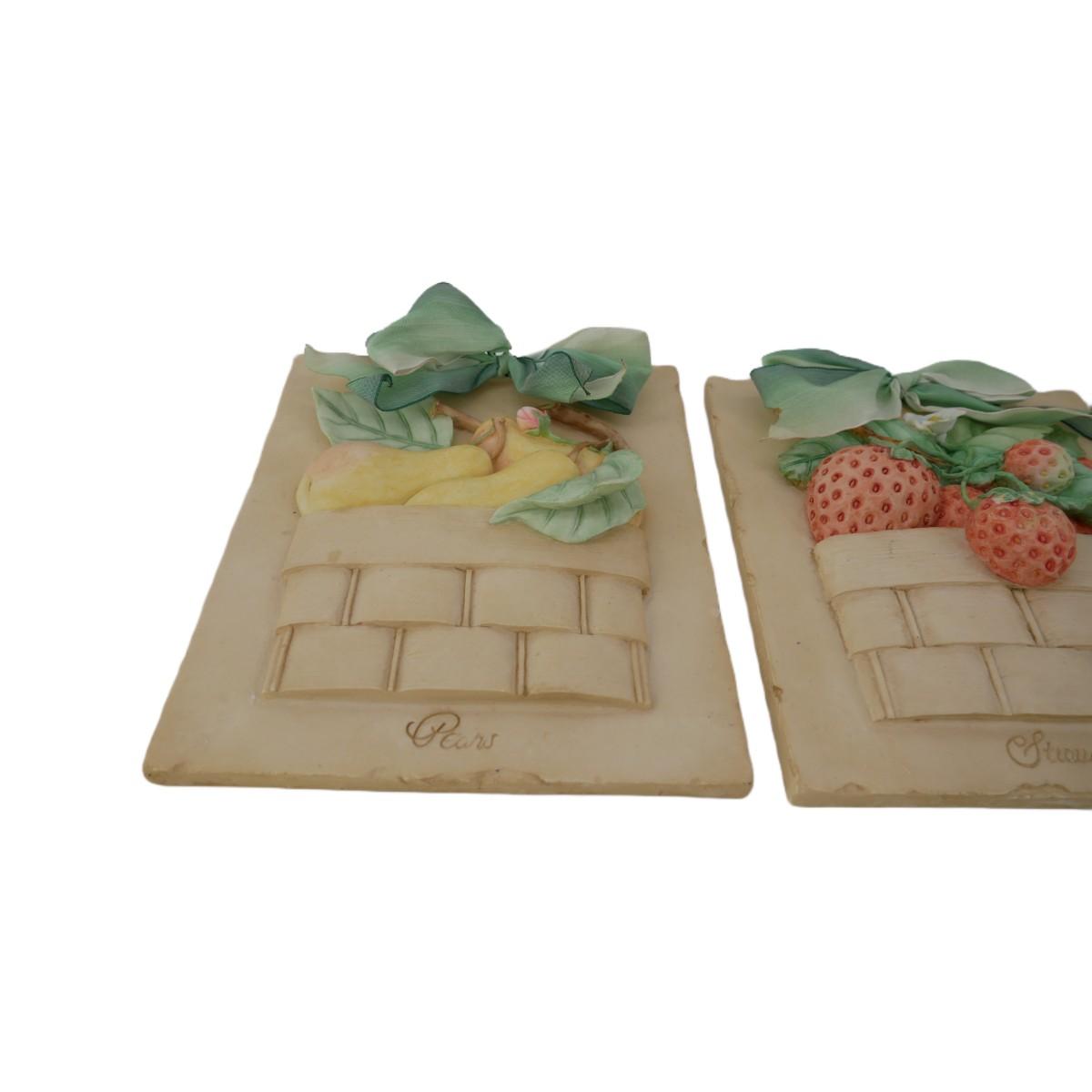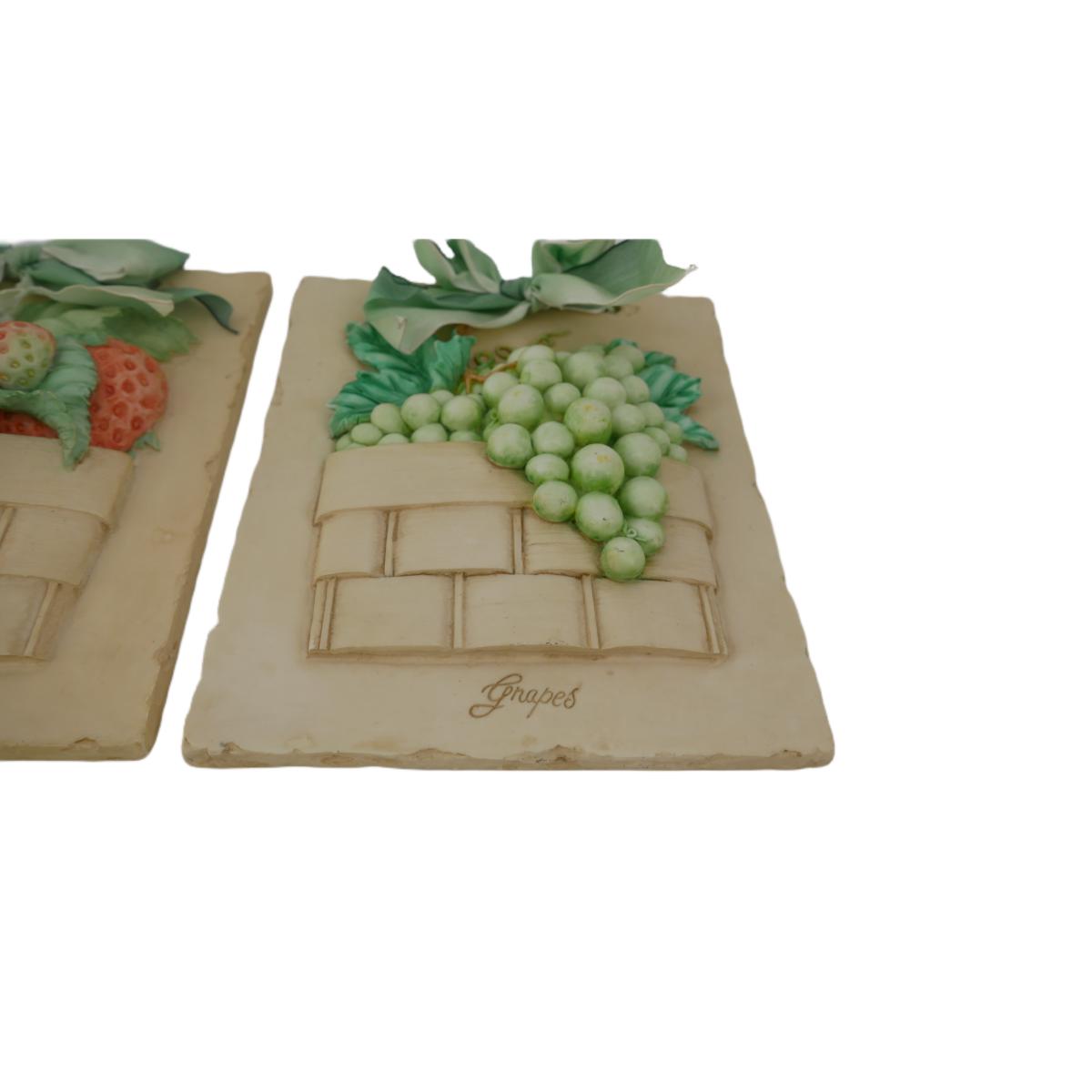 Vintage Mud Pie 1999 3-D fruit basket plaque signs with grapes, strawberry, and pears.French/Italian style home décor. Each measures approximately L 5.5" x H 6.5" x 1". Lot weighs 2 lb 10 oz. (D26)