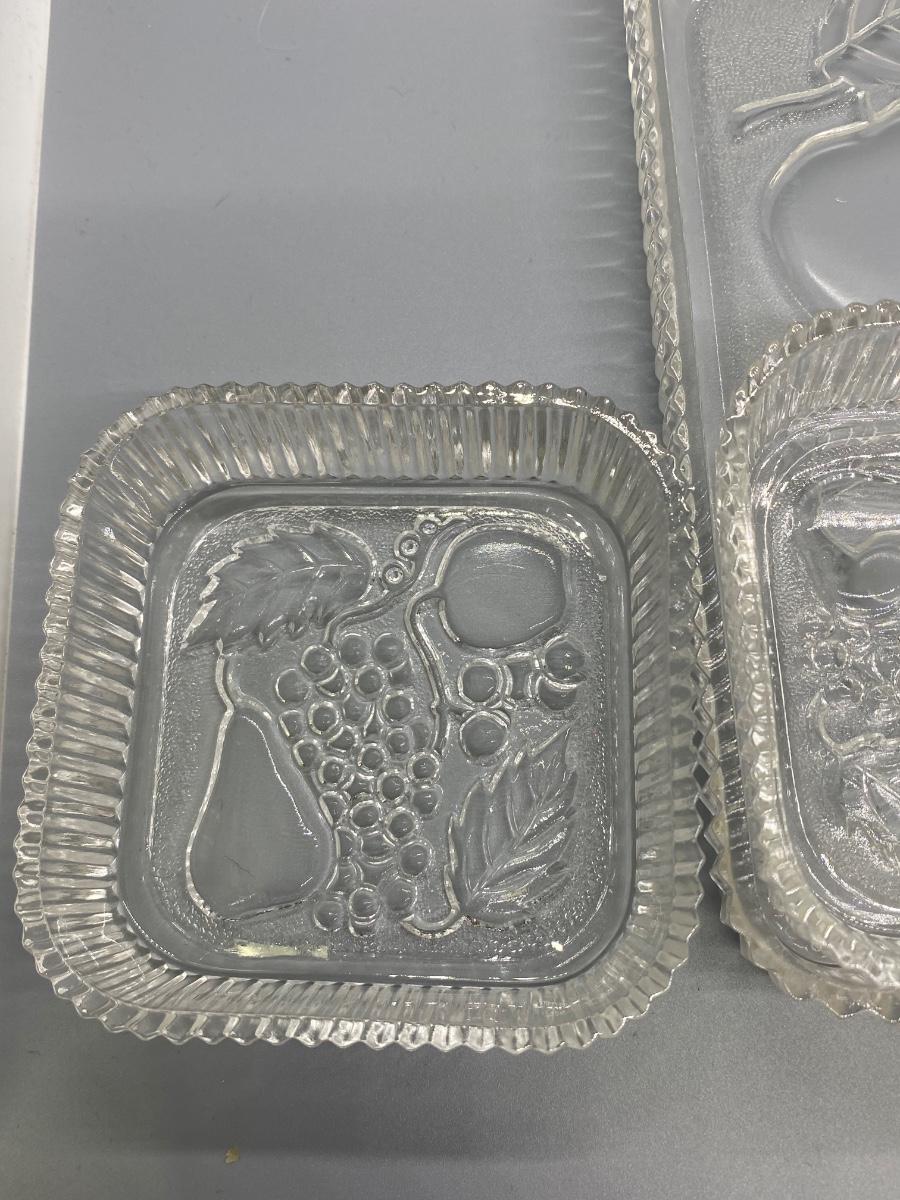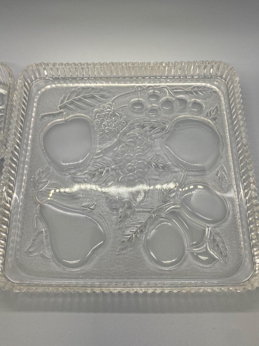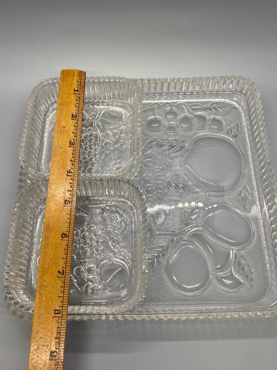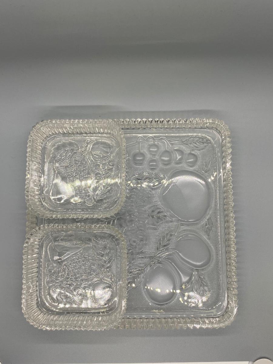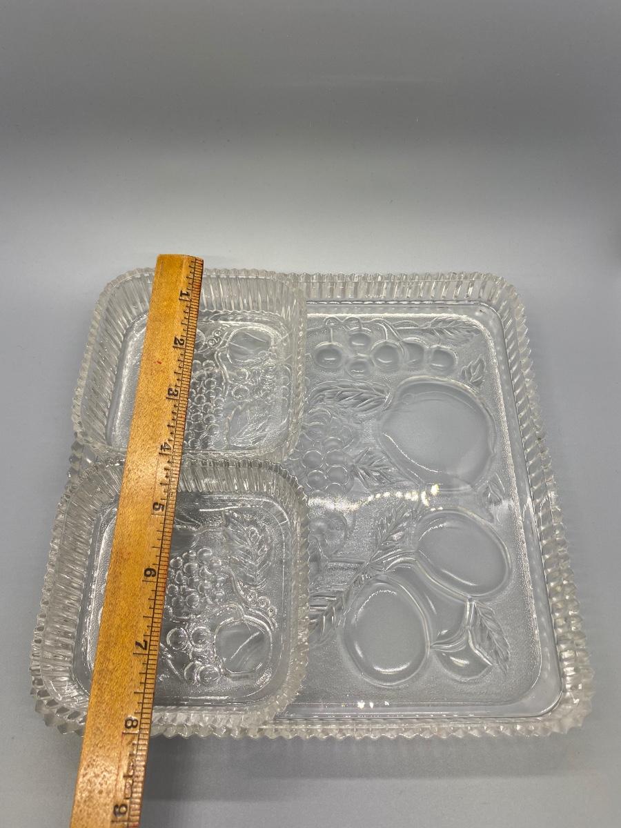 Vintage clear glass fruit embossed luncheon set. Square shaped plate with two smaller square shaped dishes. Could be used for a meal or as serving pieces. Good condition. Large plate 8" size, smaller are about 4" size.