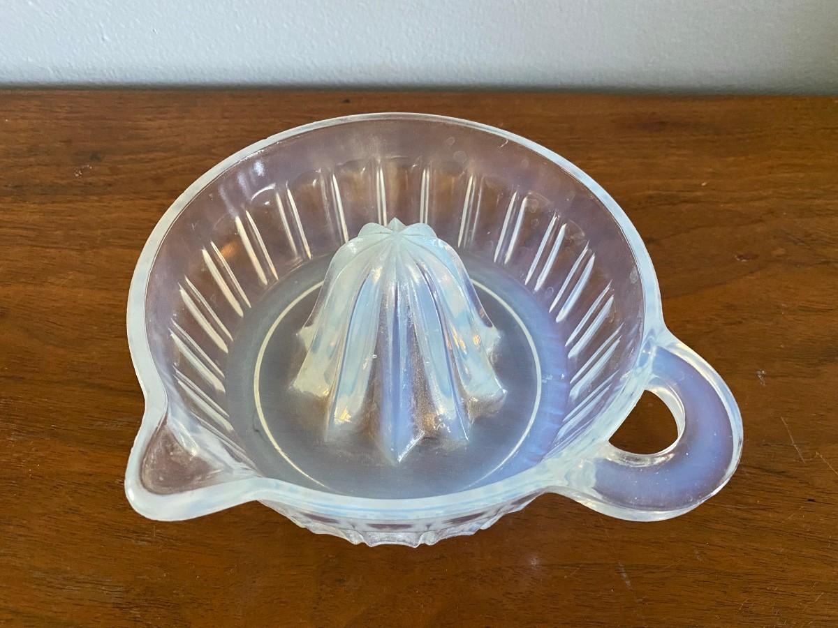 Vintage Fry Glass opalescent/opaque citrus reamer juicer. Large size, bowl is about 6" across. In good vintage condition. may be a flea bite nick along edge but no noticeable chips.