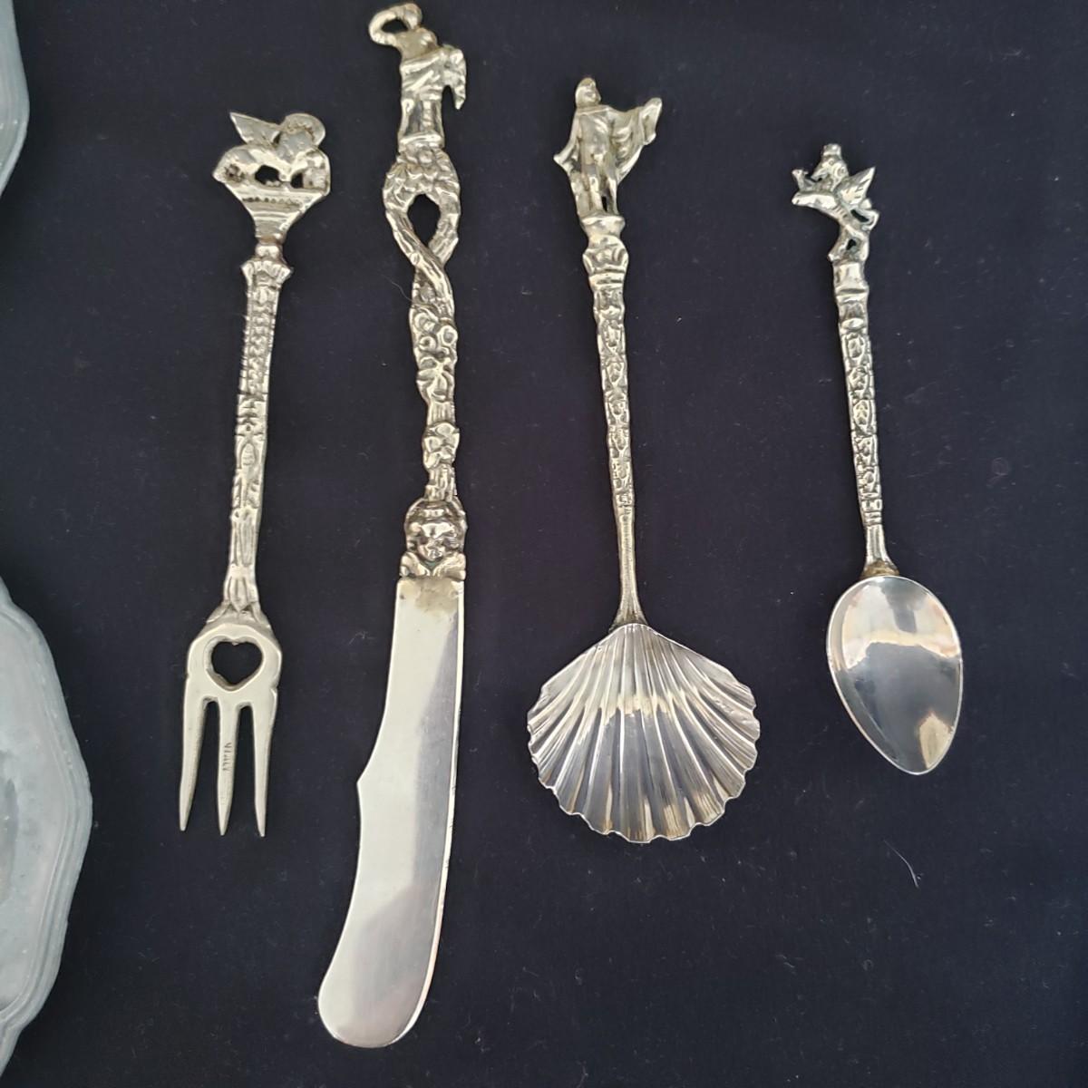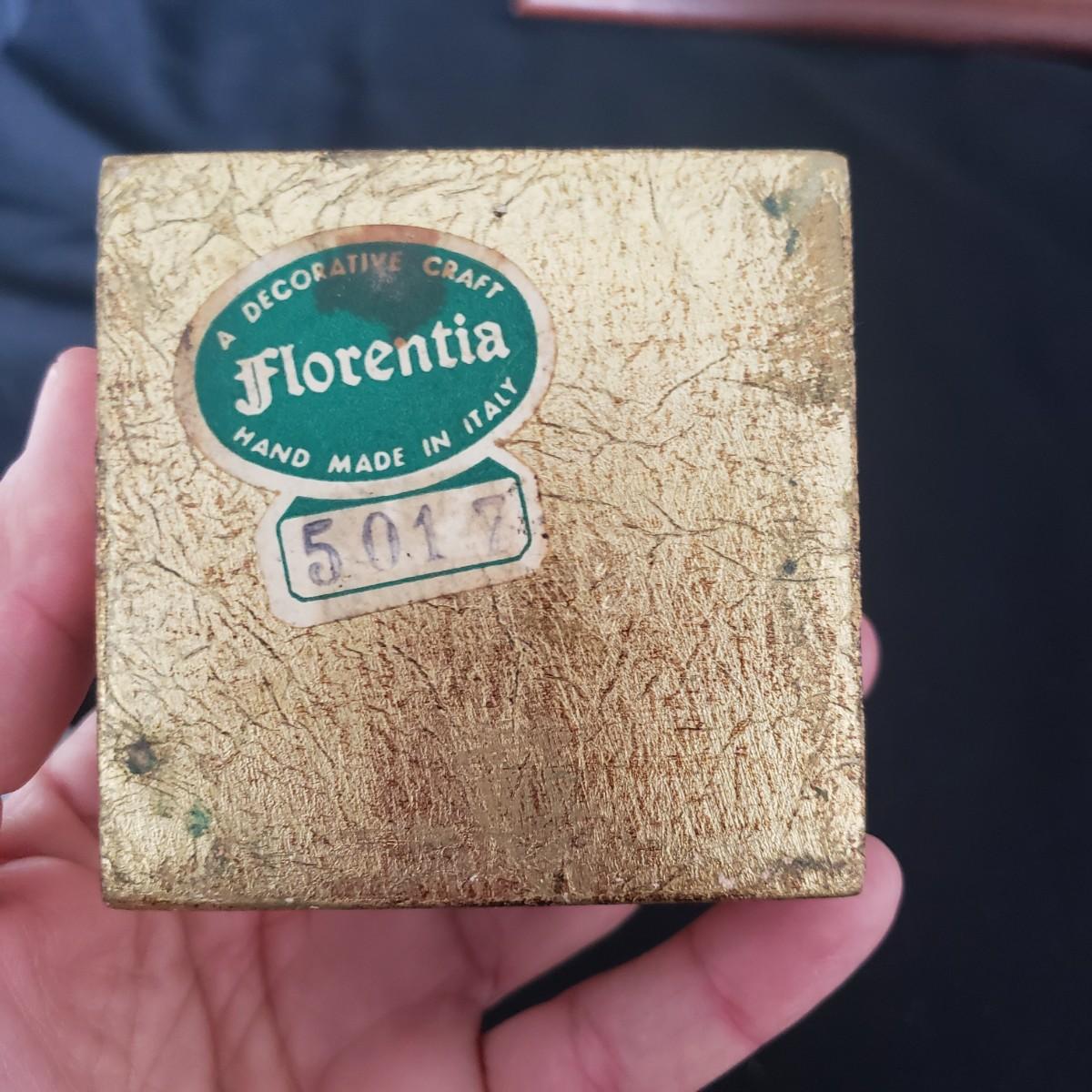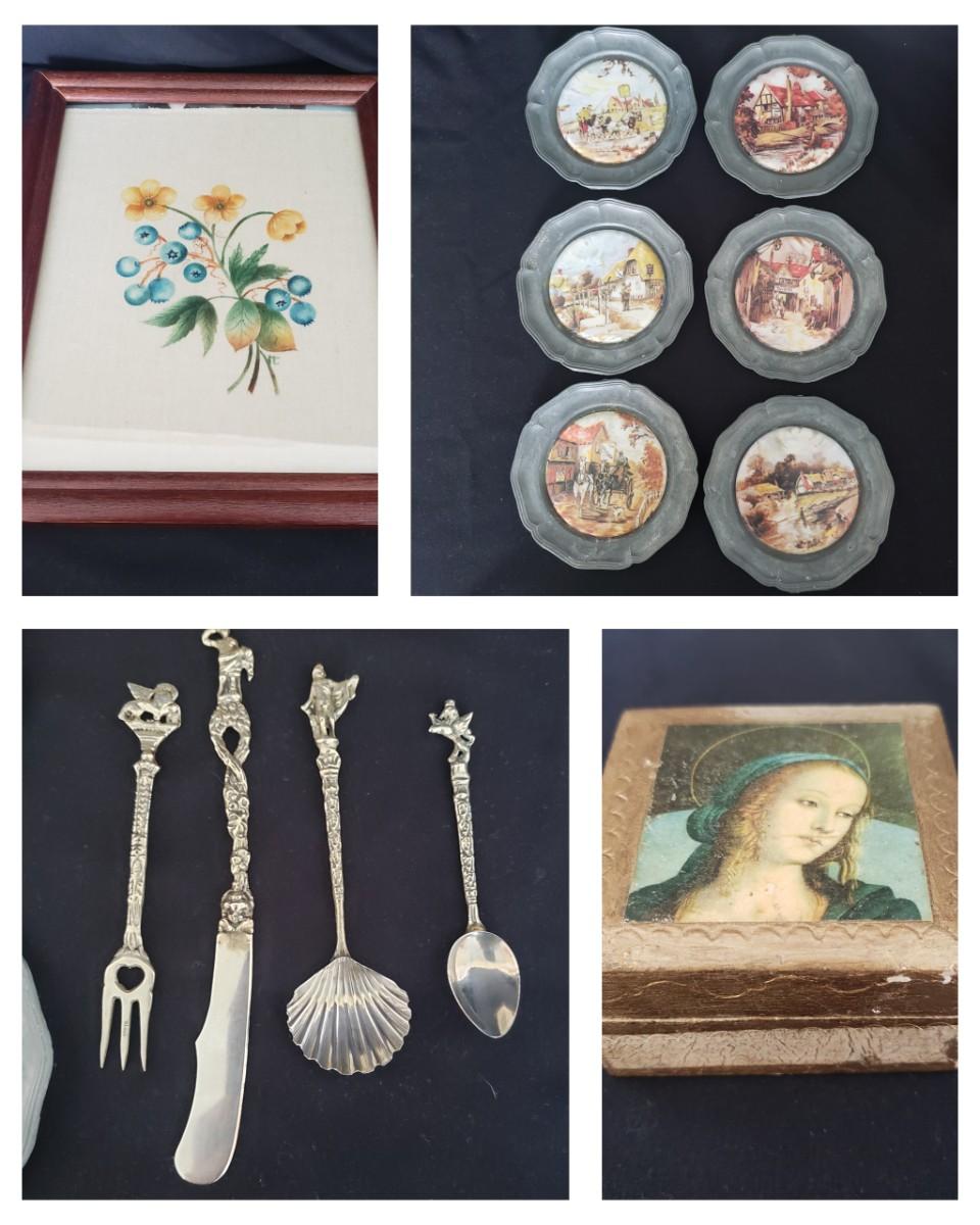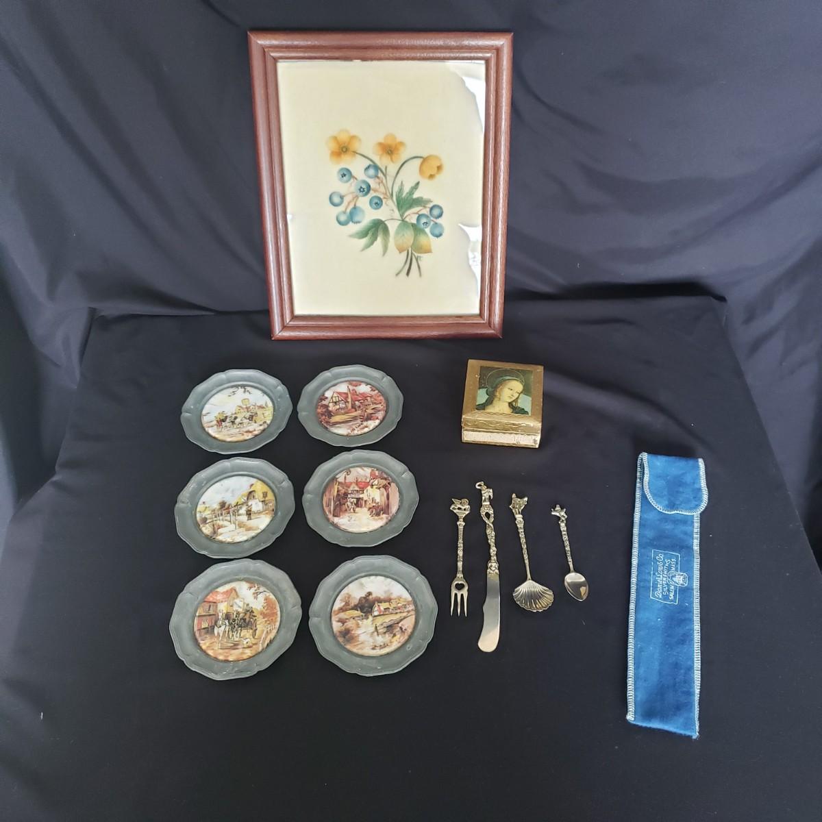 This vintage lot features four pieces of flatware made in Italy, with various Italian landmarks and figures on the ends. Silverware comes with a cloth case from Massachusetts. A six-piece coaster set with various medieval Inns. The coasters appear to be a metal with a plastic picture insert. The Florencia wooden box measures approximately 3" x 3" x 2"H. The wooden frame under glass print of blueberries and flowers is on a cloth.