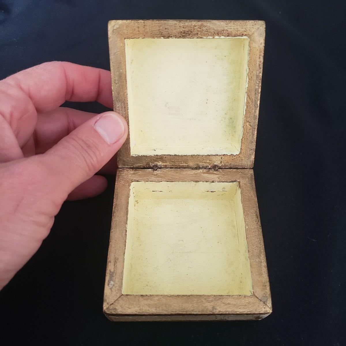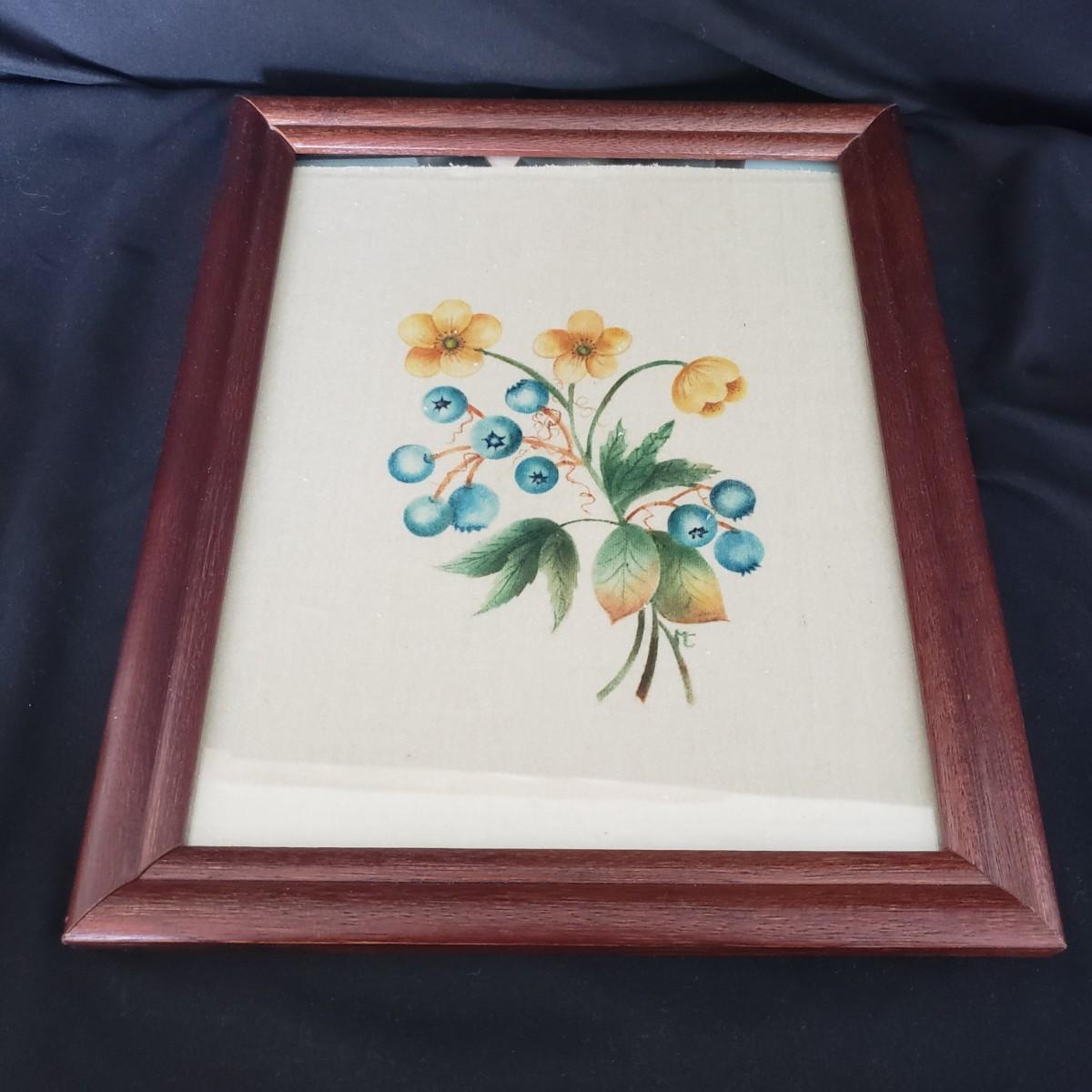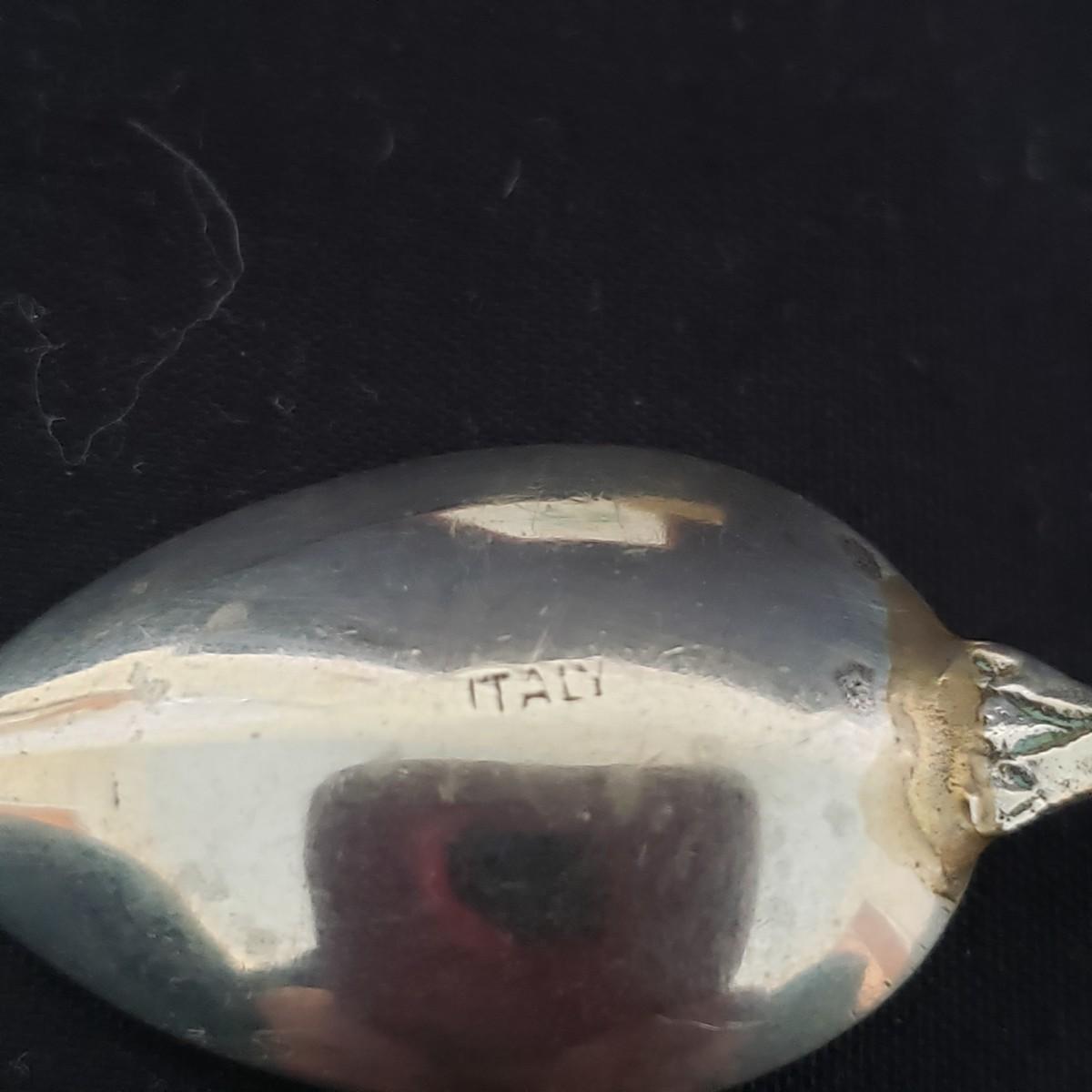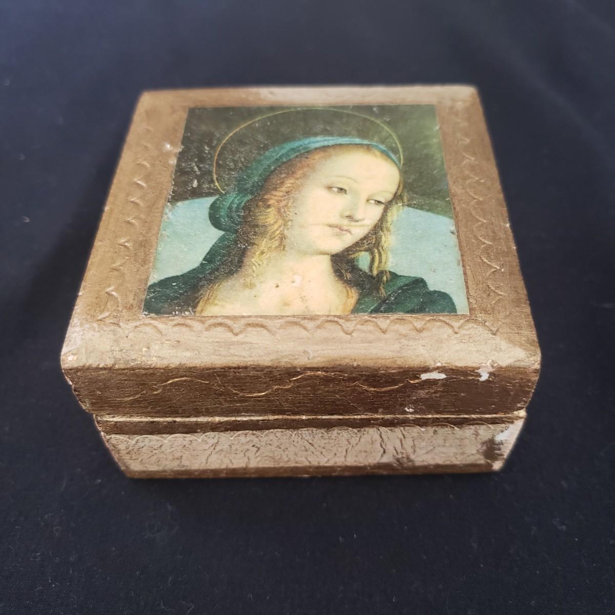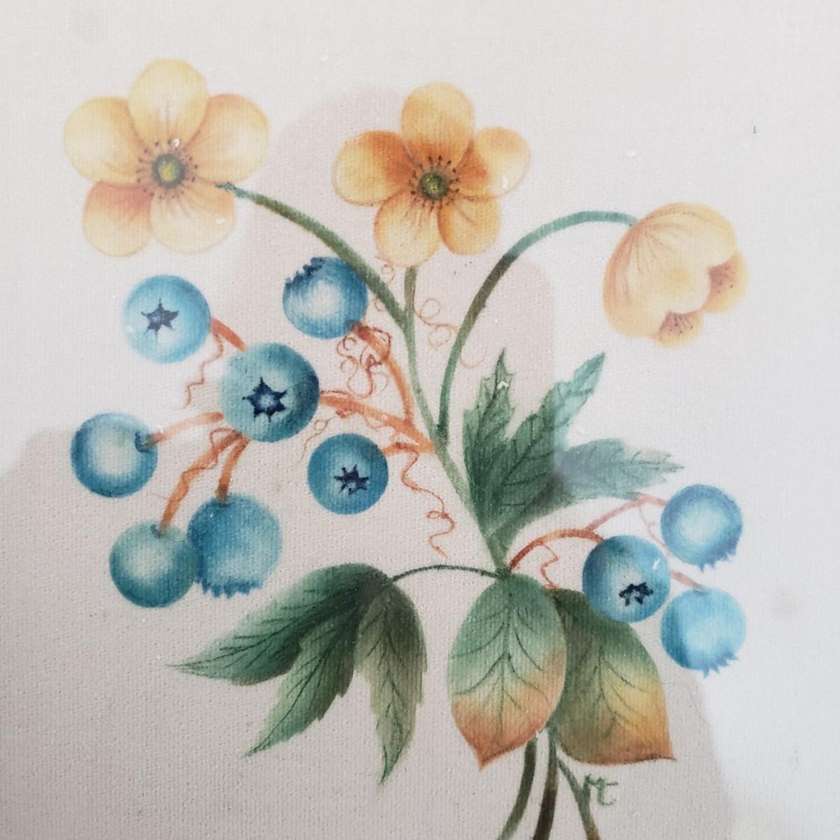 This vintage lot features four pieces of flatware made in Italy, with various Italian landmarks and figures on the ends. Silverware comes with a cloth case from Massachusetts. A six-piece coaster set with various medieval Inns. The coasters appear to be a metal with a plastic picture insert. The Florencia wooden box measures approximately 3" x 3" x 2"H. The wooden frame under glass print of blueberries and flowers is on a cloth.