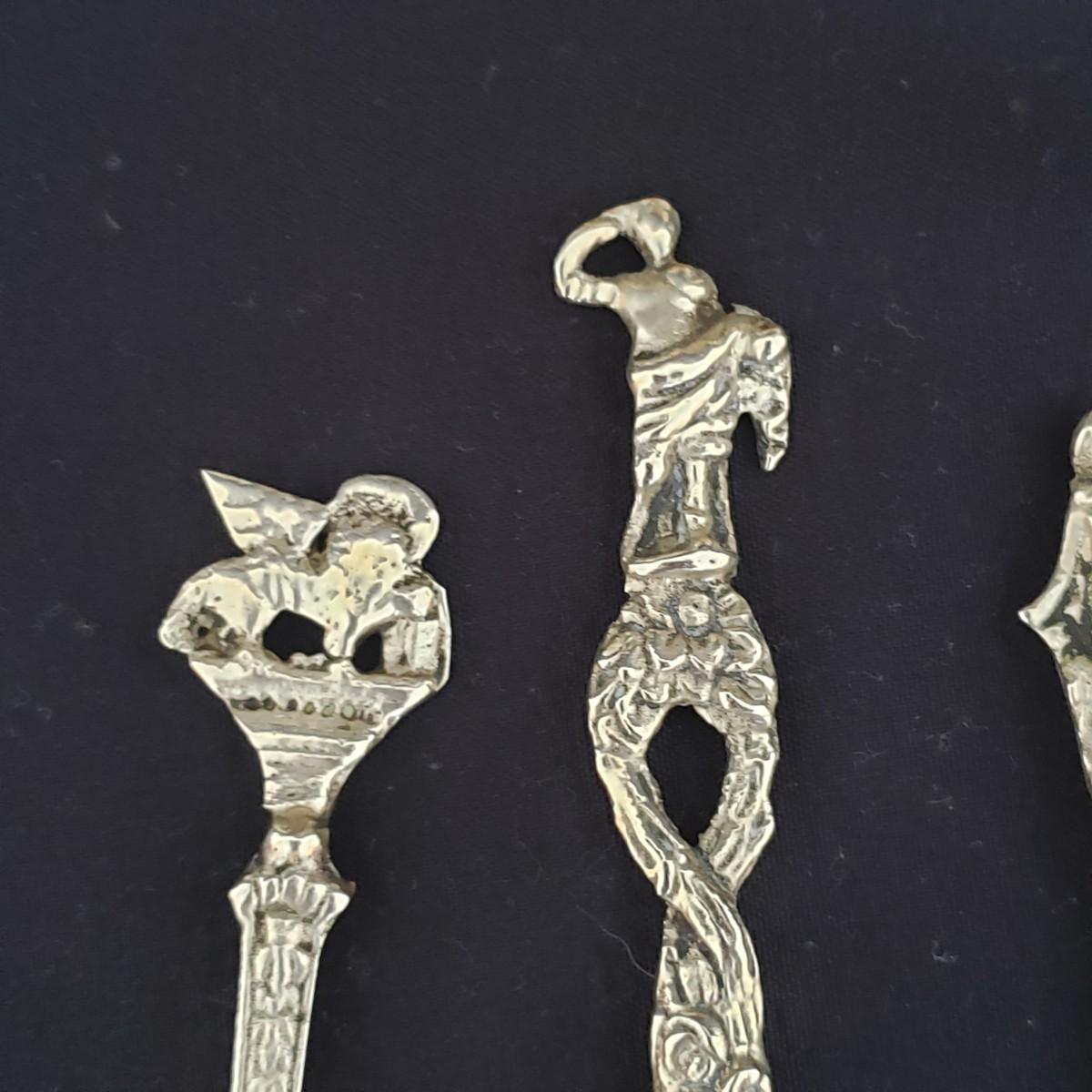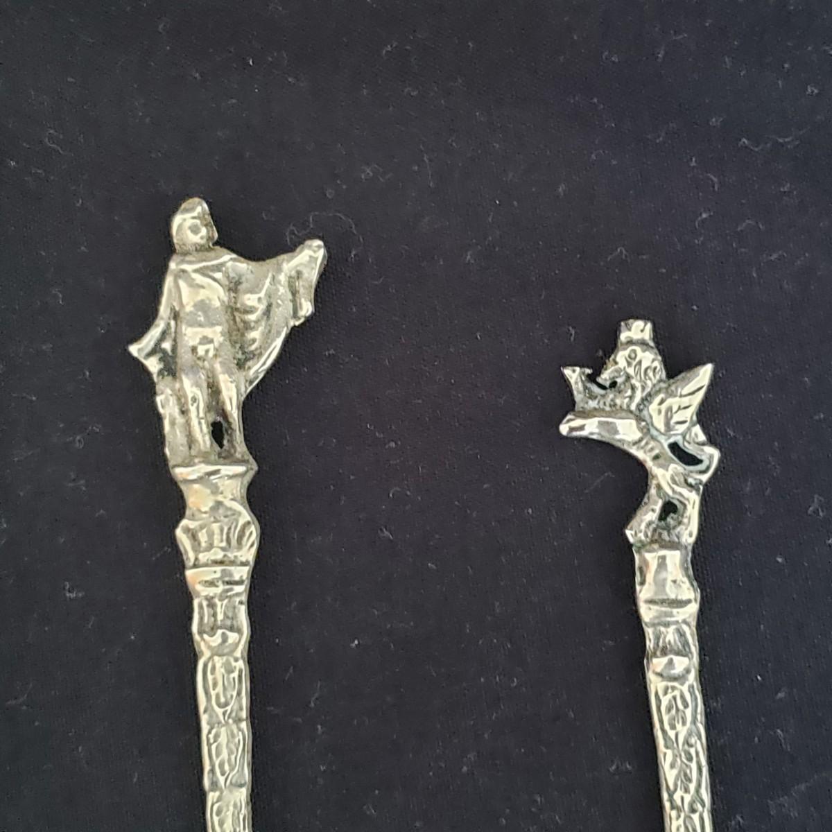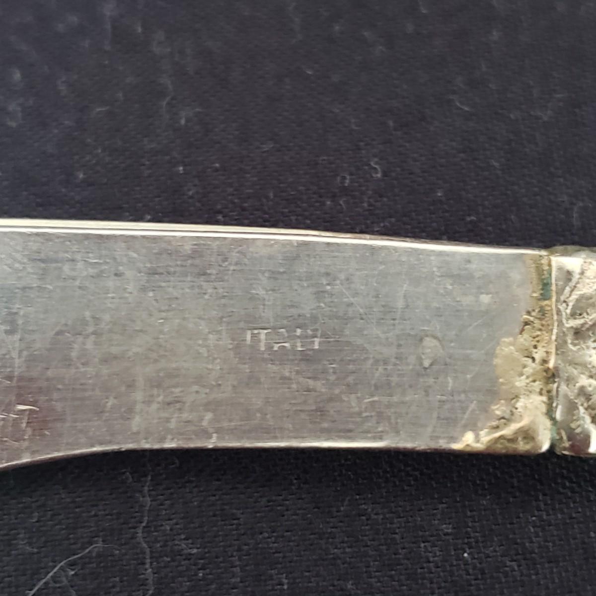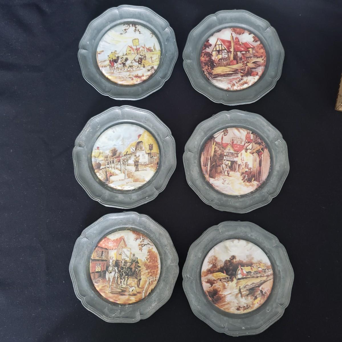 This vintage lot features four pieces of flatware made in Italy, with various Italian landmarks and figures on the ends. Silverware comes with a cloth case from Massachusetts. A six-piece coaster set with various medieval Inns. The coasters appear to be a metal with a plastic picture insert. The Florencia wooden box measures approximately 3" x 3" x 2"H. The wooden frame under glass print of blueberries and flowers is on a cloth.