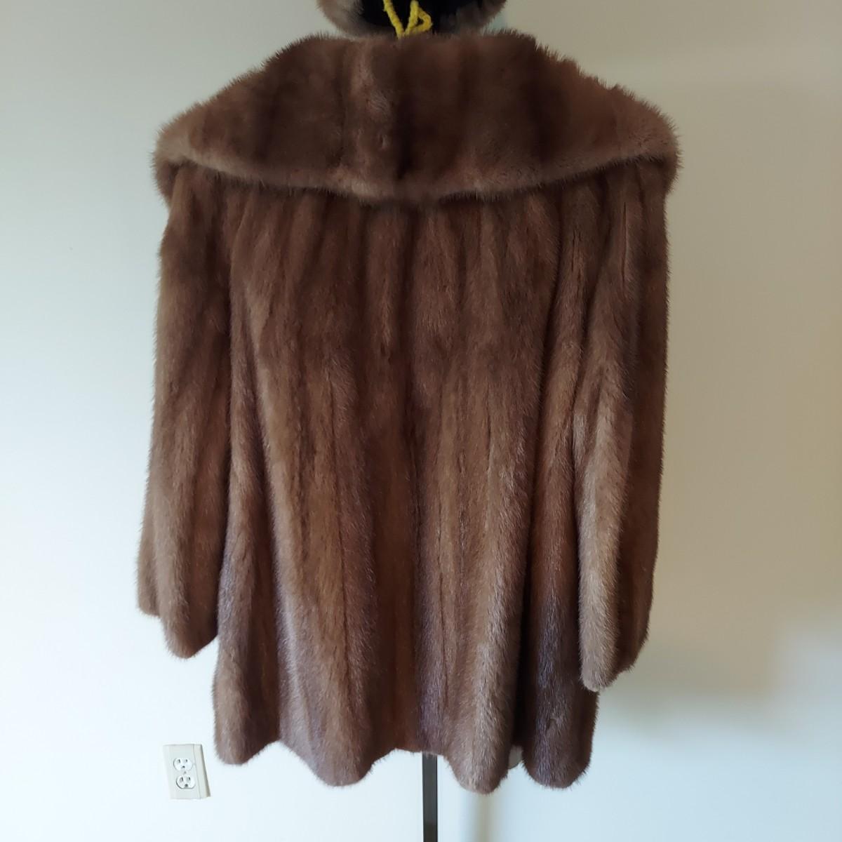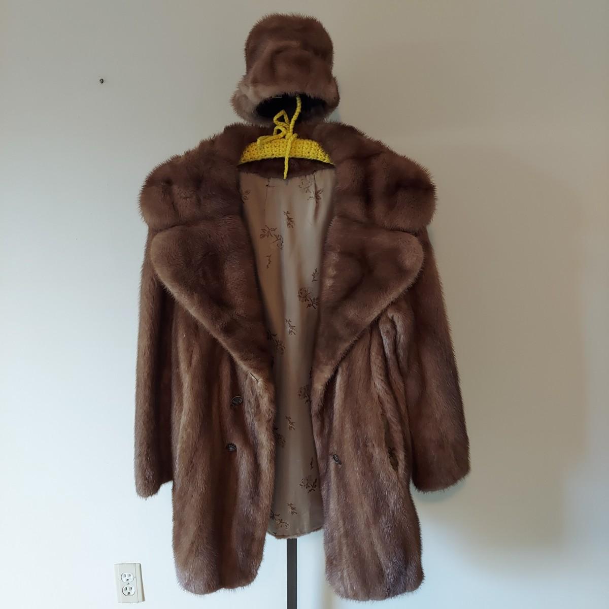 Beautiful matching fur coat and hat. Coat doesn't have a visible size but best fits an approximate medium, measures 21” shoulder x 22” chest x 33” long. Hat is 22” around. There are no tags but it appears to be real fur and vintage. Some condition issues. Please see photos for details. Shipping available. Clothing racks are props and are not included in the auction!
