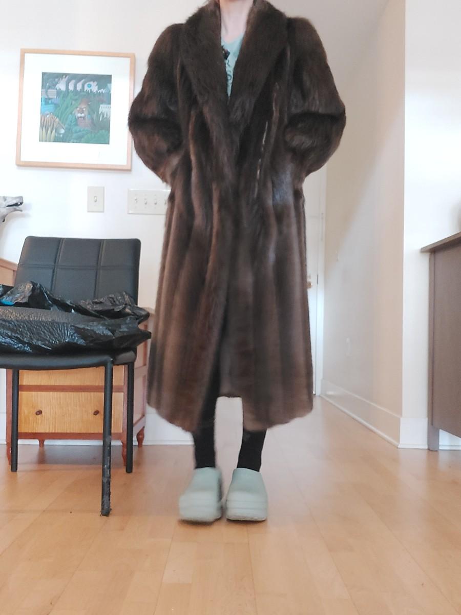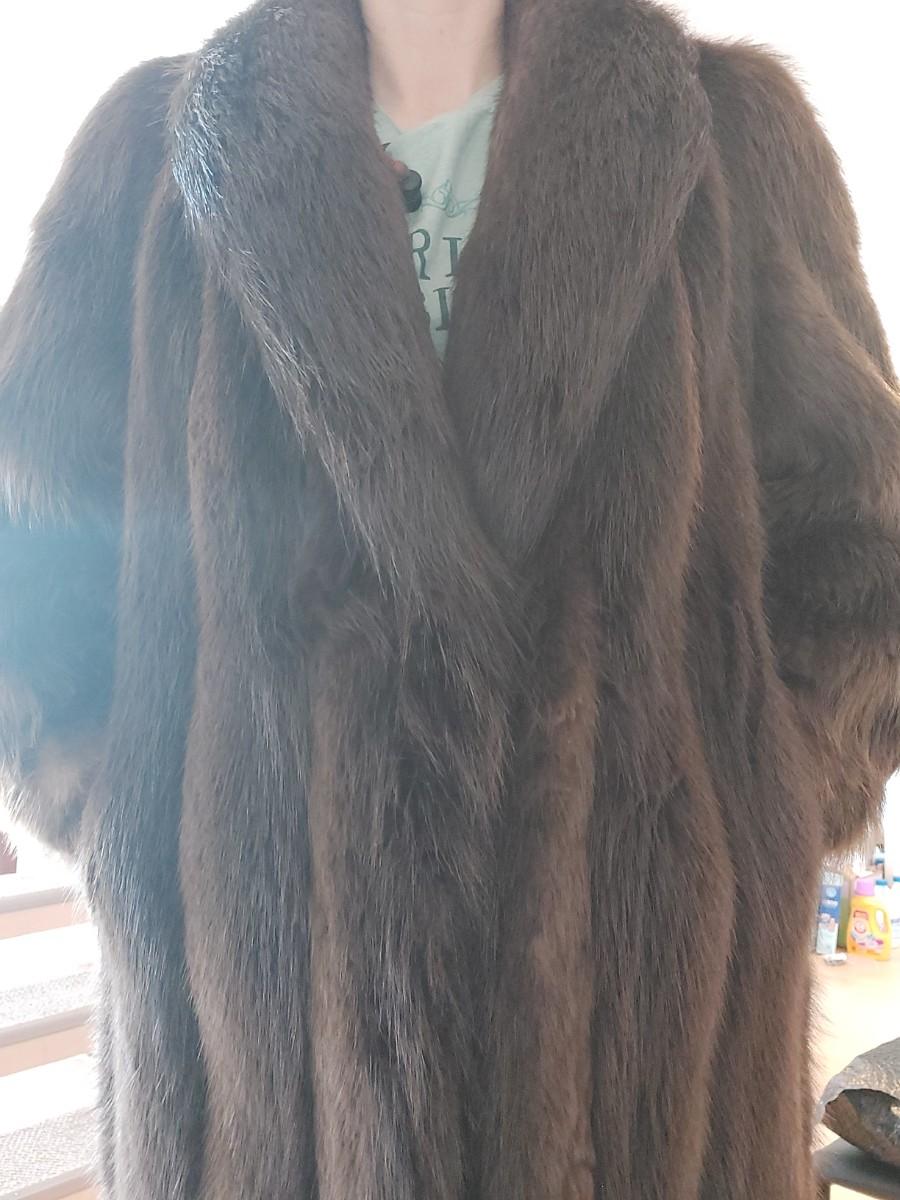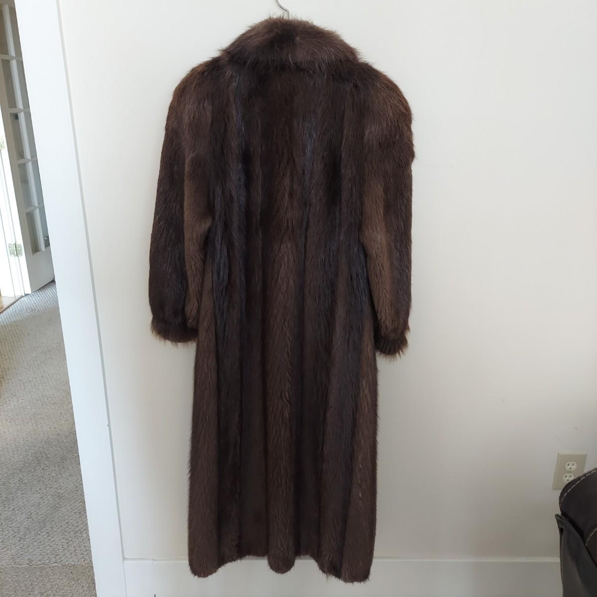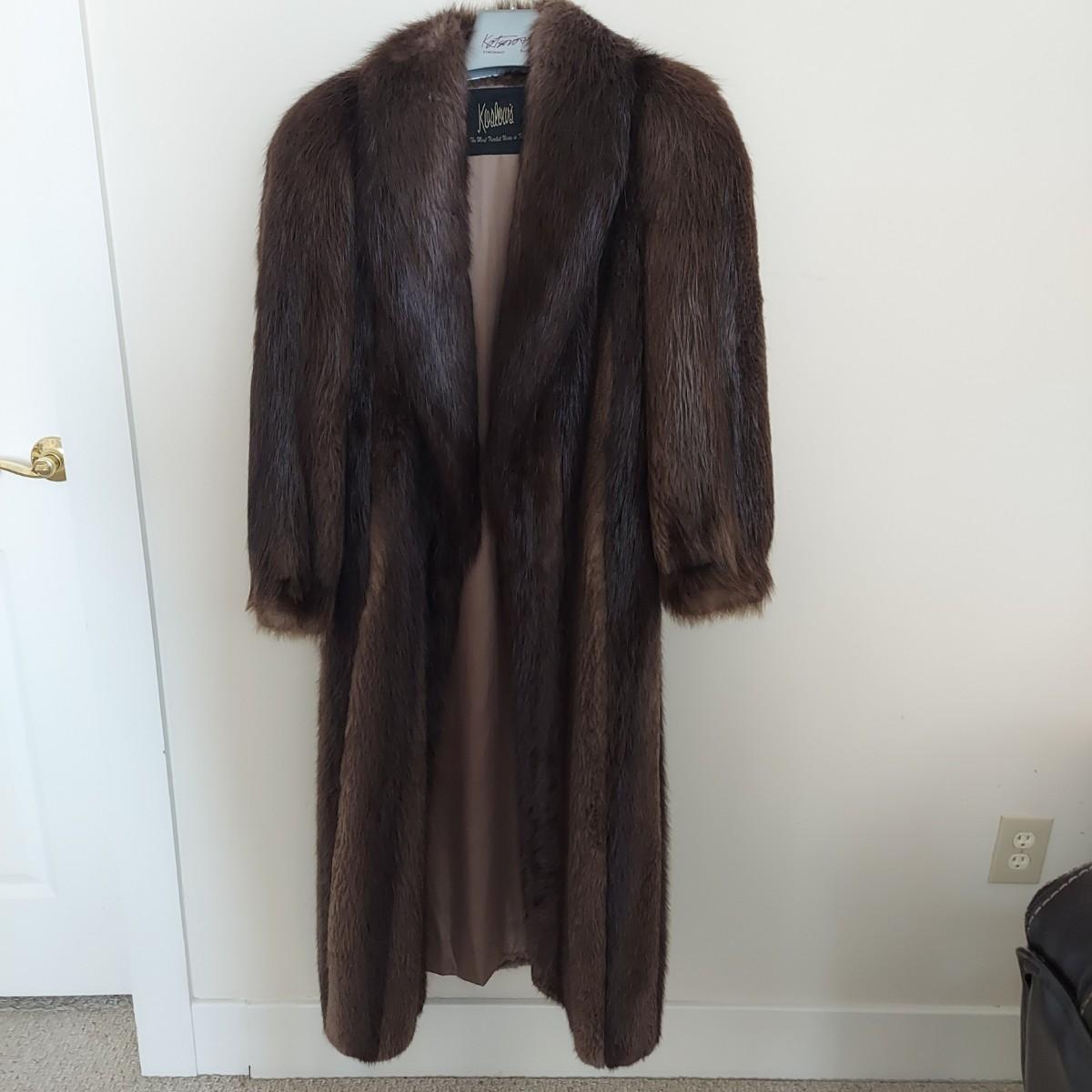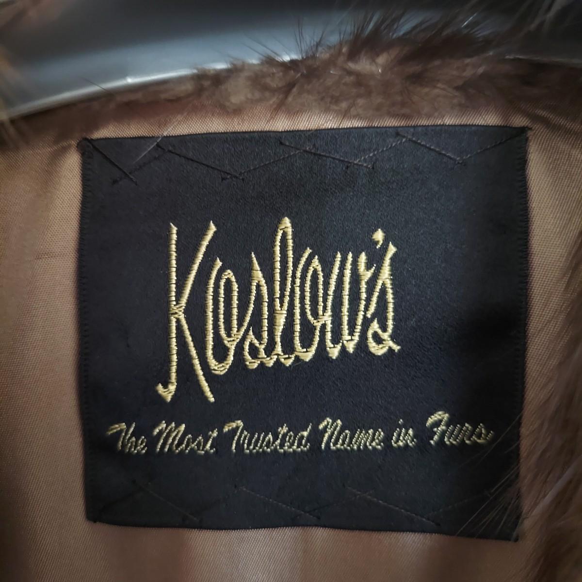 Dark fur coat that appears to be vintage. Labeled Koslow's. Fur type is unknown but similar to mink. It has a soft, fluffy under coat with long shiny over coat in a dark brown color. Size is not marked but it is shown on a tall medium. Please see photos for details. Shipping available