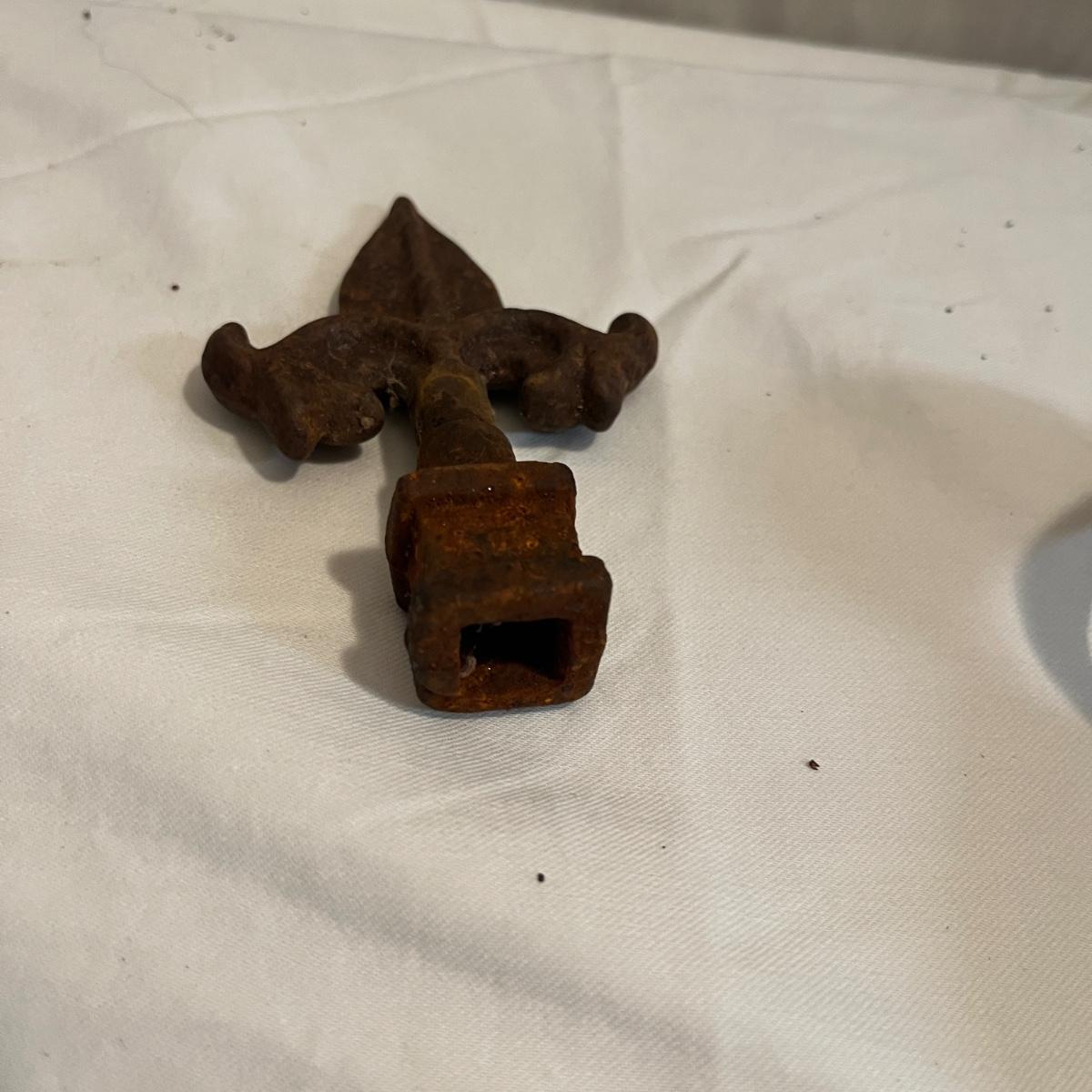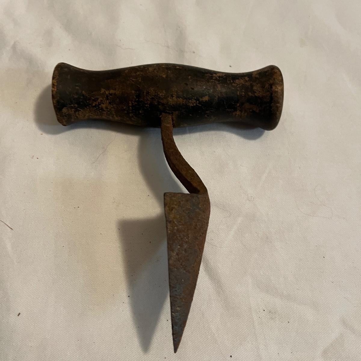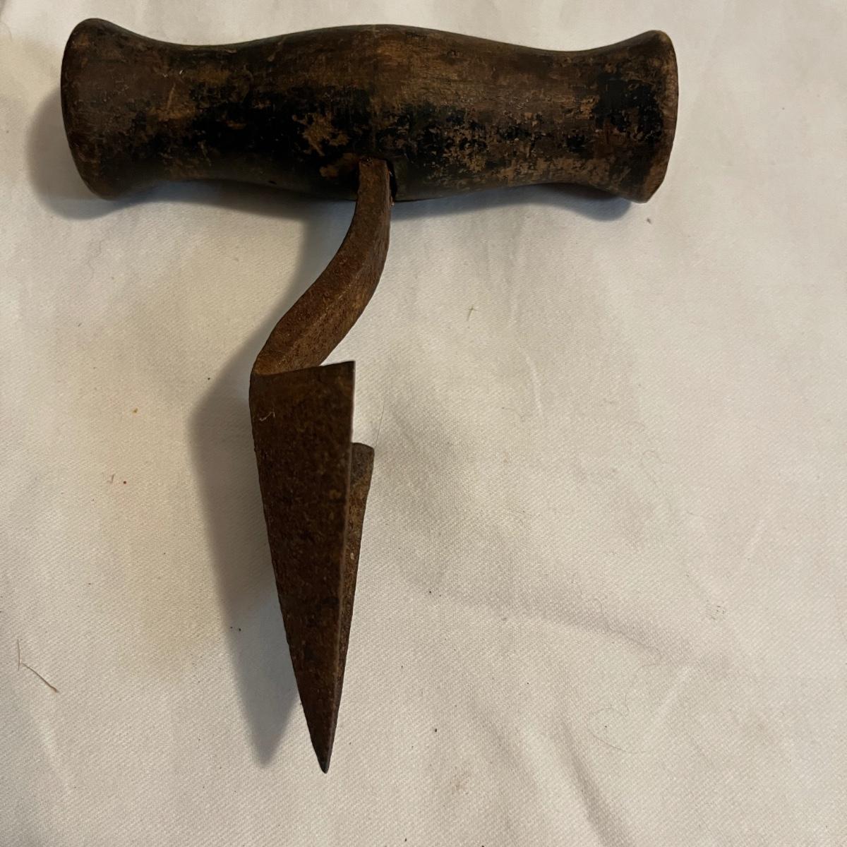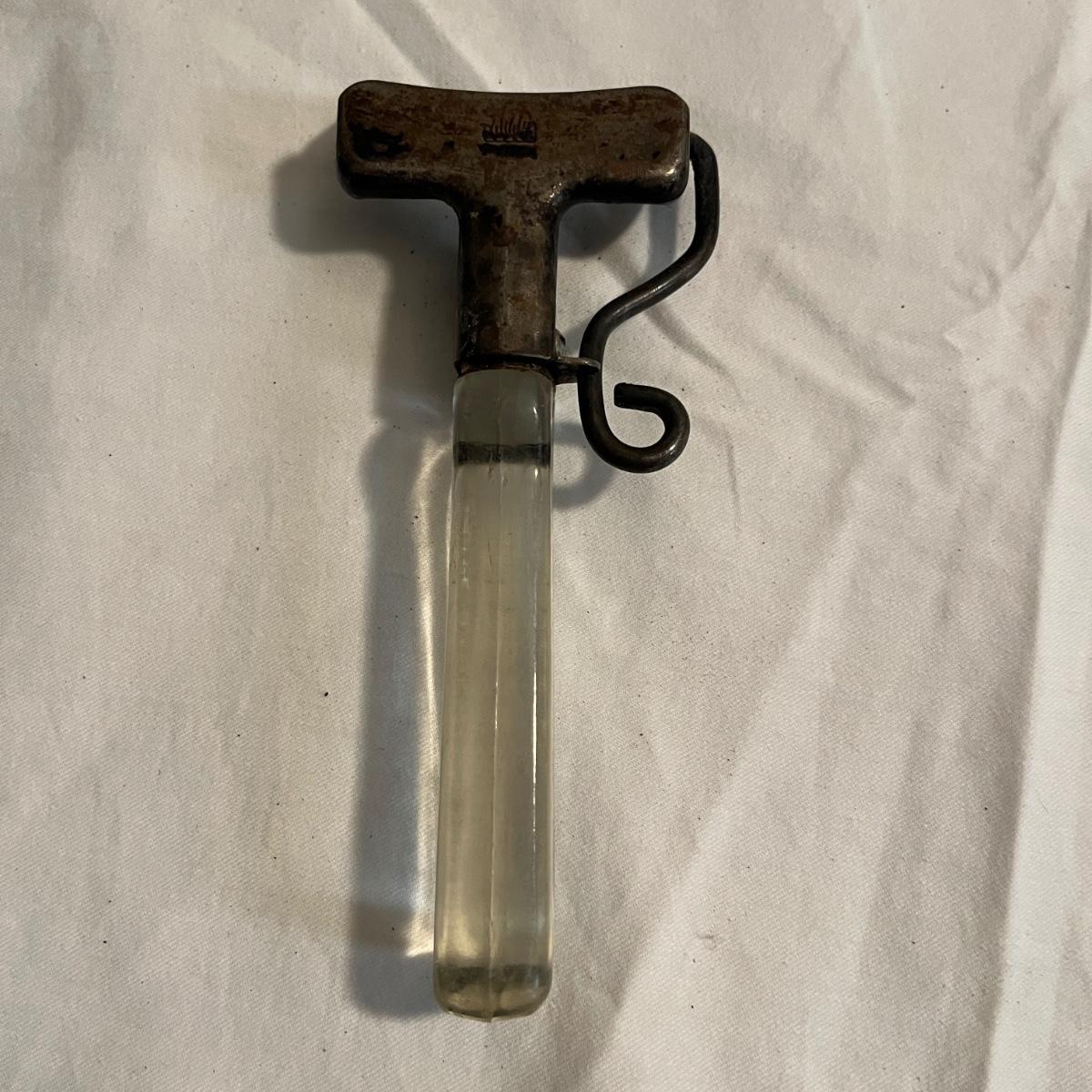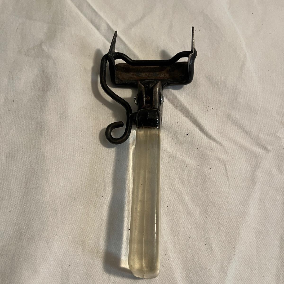 This selection of vintage gadgets includes hand sheep shears, glass handled detachable Pyrex handle, wooden pulley, reamer, Fleur de Les fence top and a silver plate wood lined box. Box measures 7.5” x 4.5” x 2.5”H.