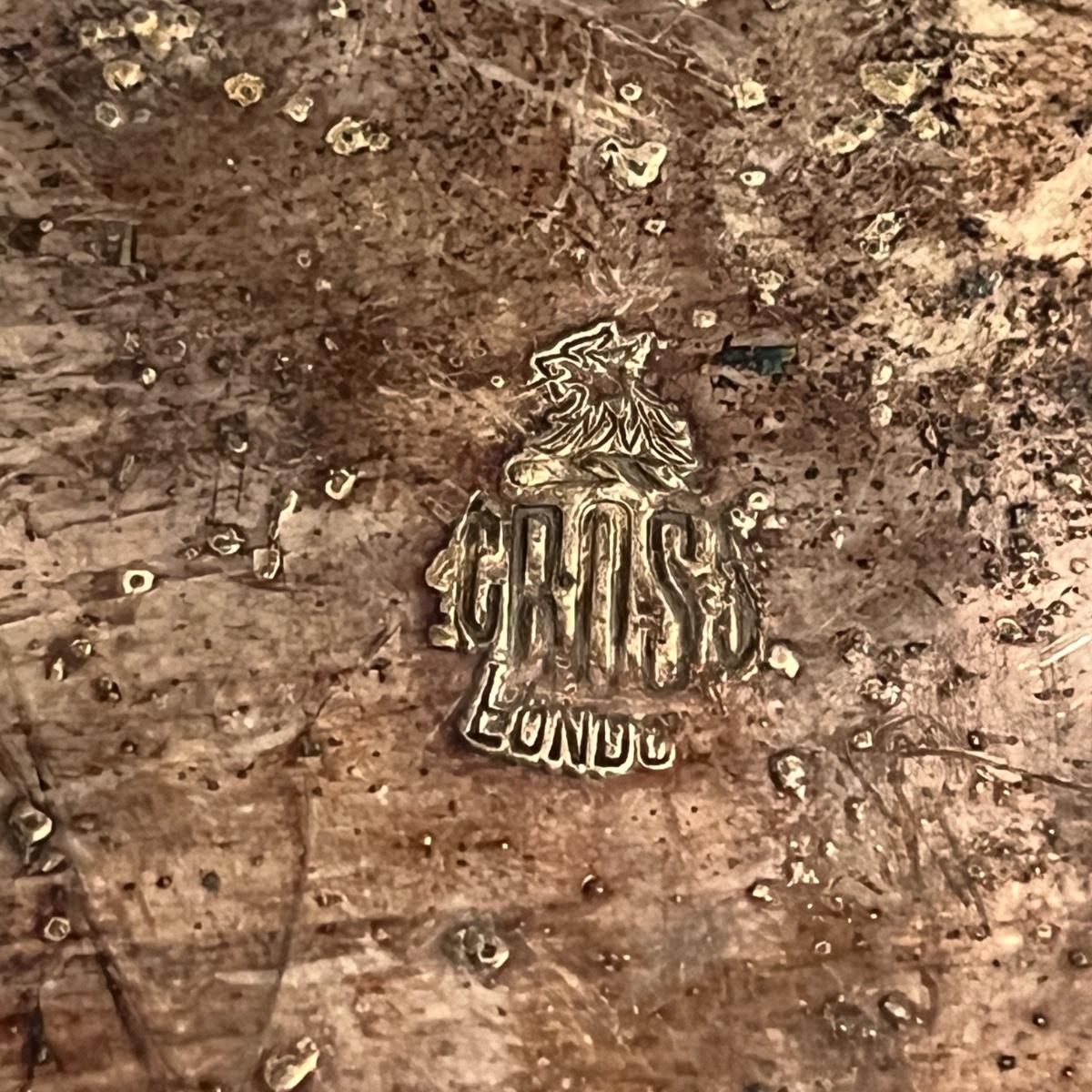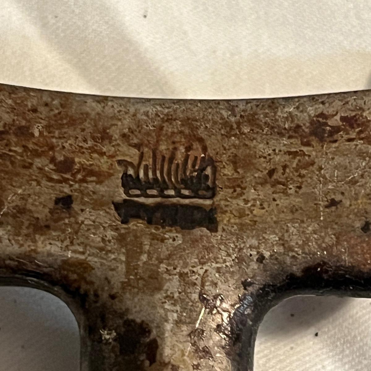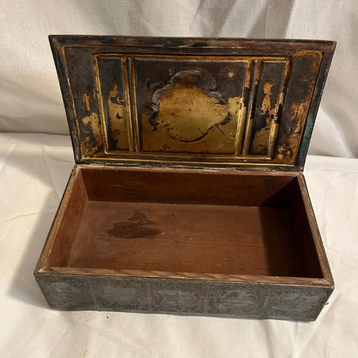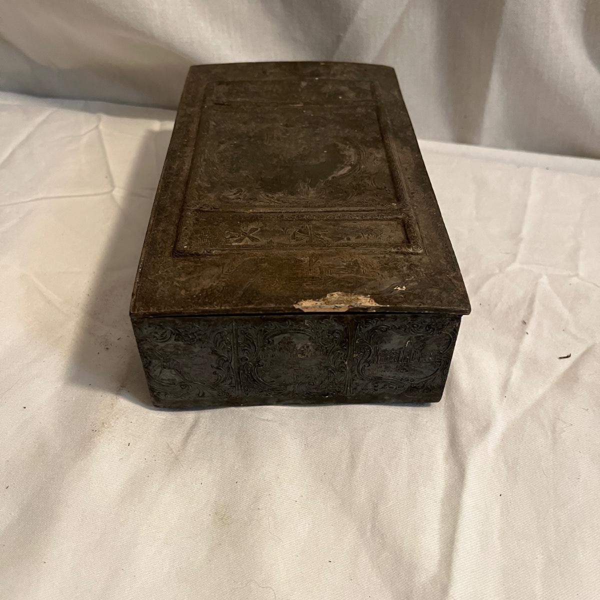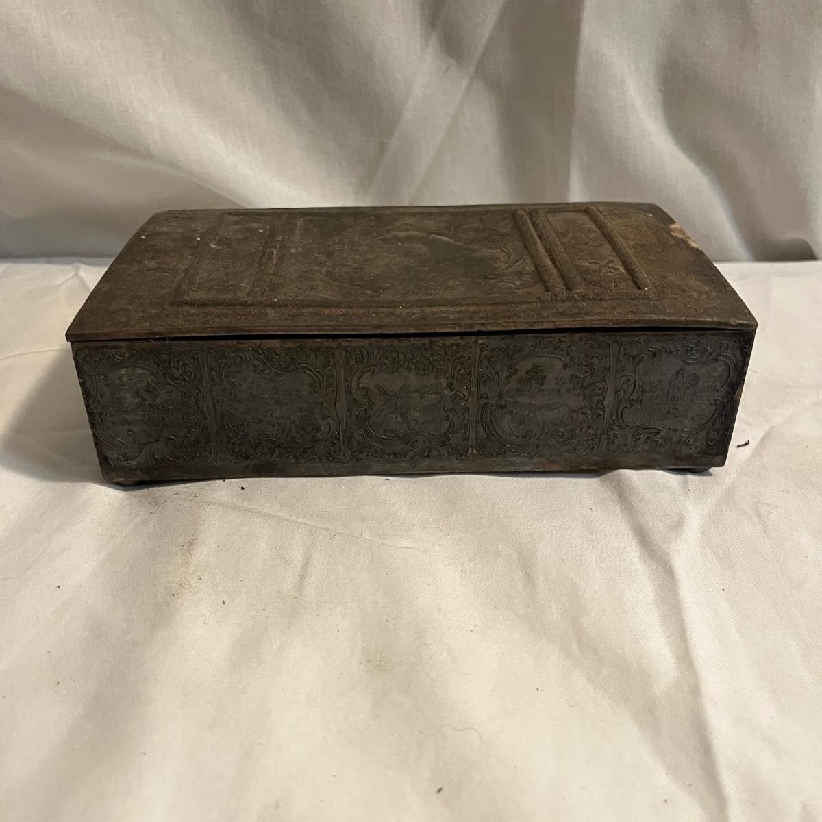This selection of vintage gadgets includes hand sheep shears, glass handled detachable Pyrex handle, wooden pulley, reamer, Fleur de Les fence top and a silver plate wood lined box. Box measures 7.5” x 4.5” x 2.5”H.
