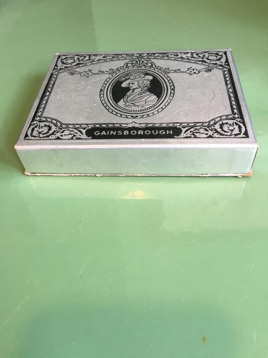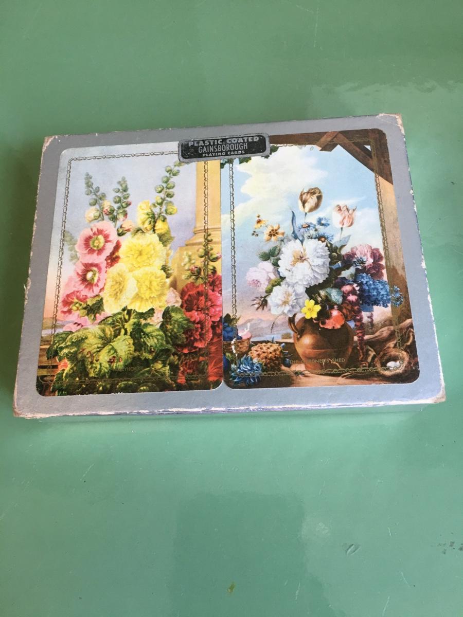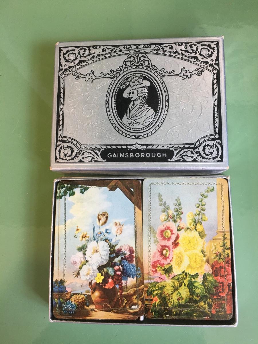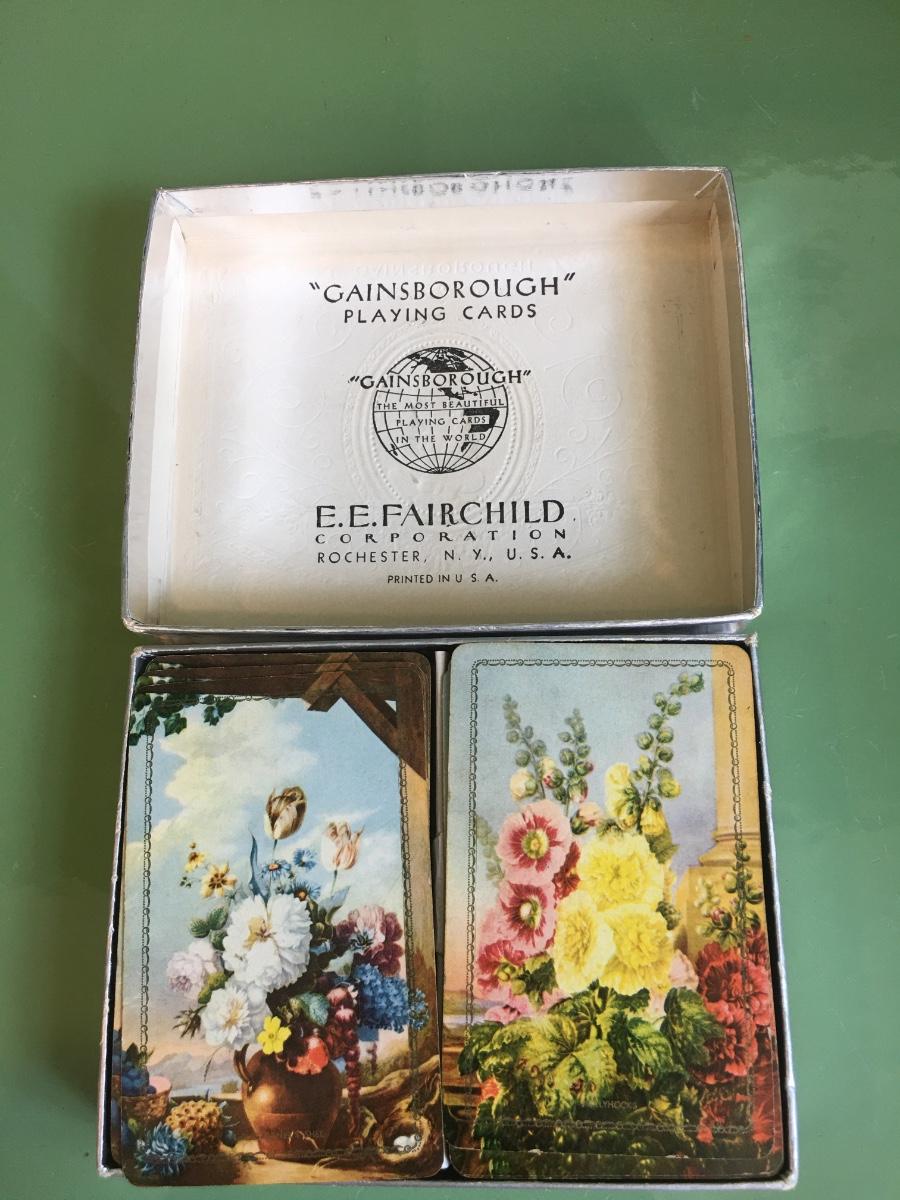 Vintage Gainsborough gilt edge playing cards. The two decks of Gainsborough EE Fairchild Corp. playing cards are in the original box. One deck is Hollyhocks and the other is The Gardner’s Shed. Silver embossed box shows minimal wear as shown in photos.