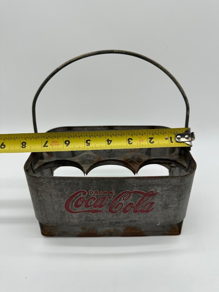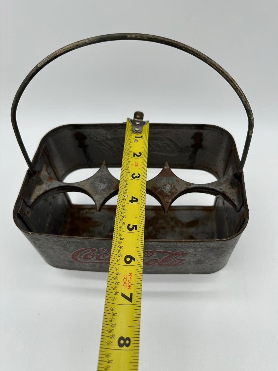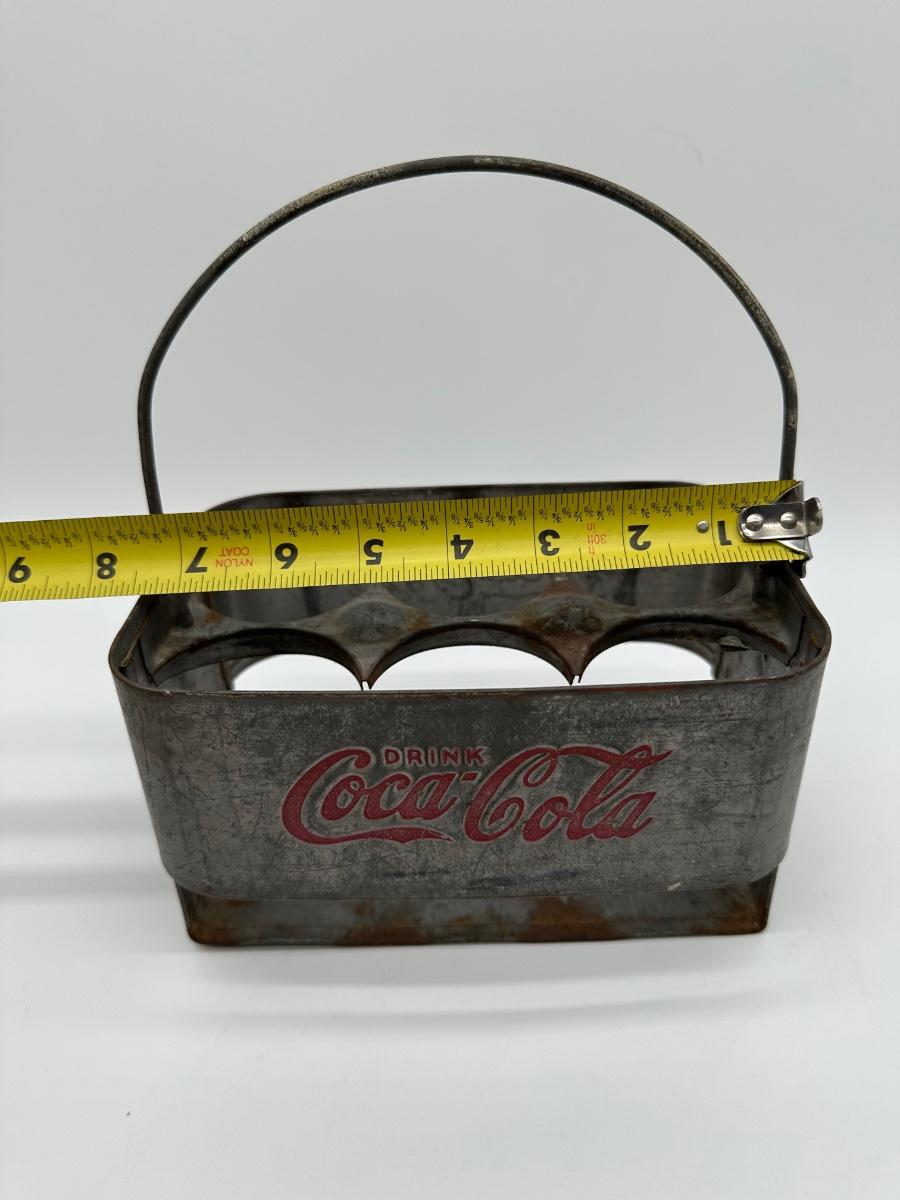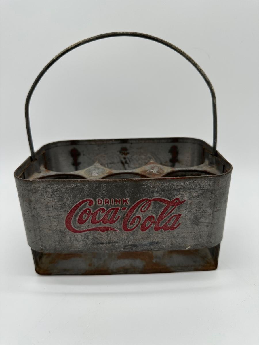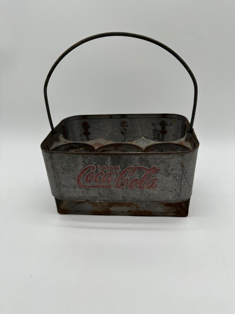 Authentic vintage galvanized metal Coca-Cola bottle carrier featuring the classic red “Drink Coca-Cola” script logo.