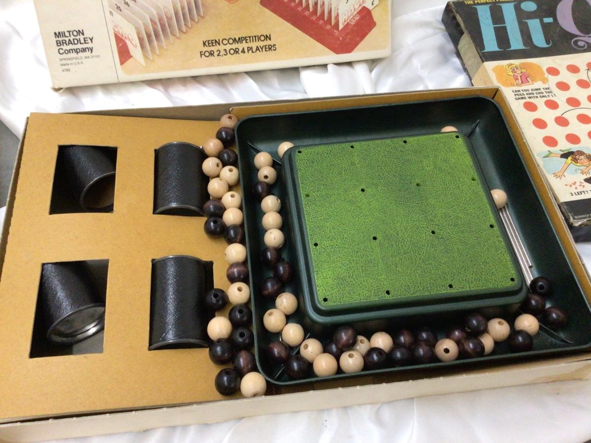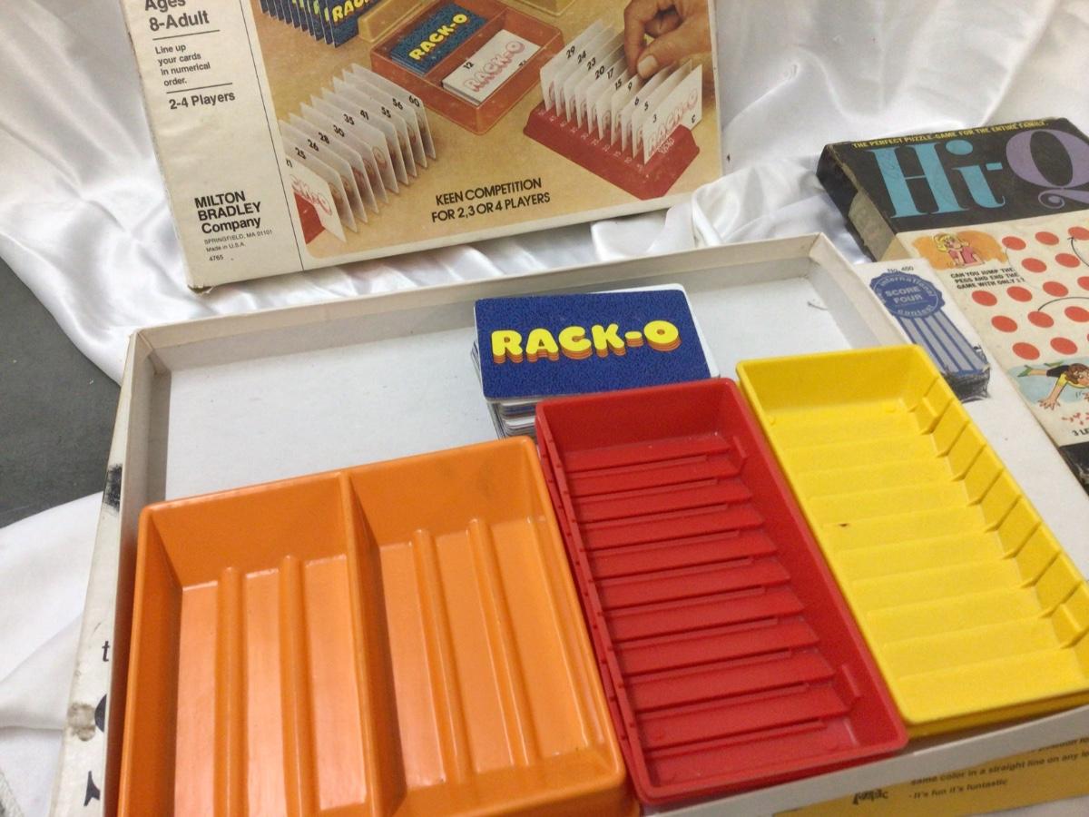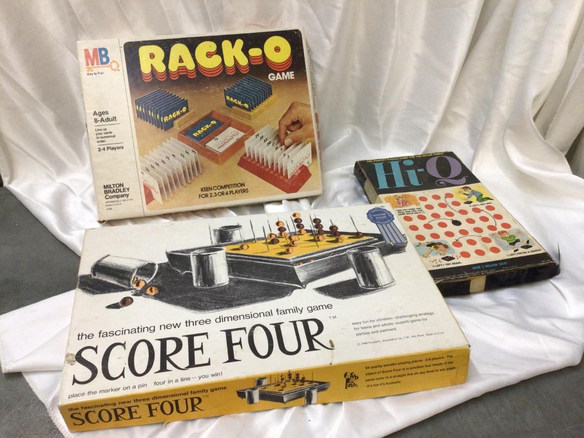You get Rack O card game open and used look complete Score Four open and used looks complete, Hi Q game open and used does not look complete.