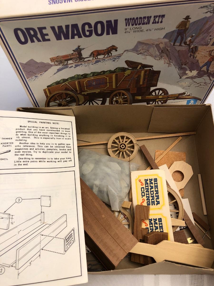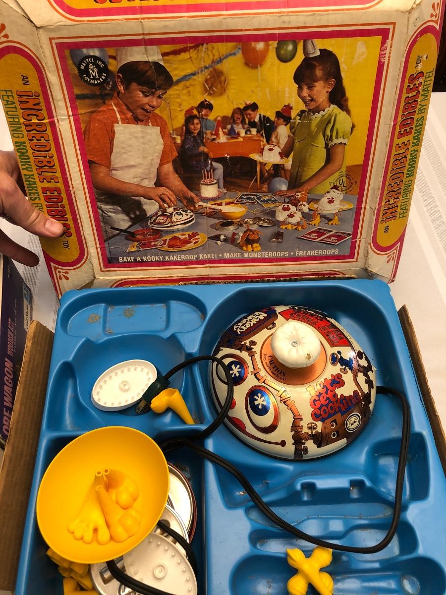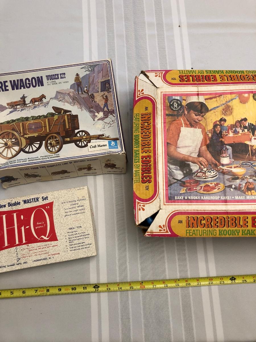 Hi““Q, Ore Wagon wooden kit from Craftmaster, and an Incredible Edibles toy featuring cookie cakes by Mattel.