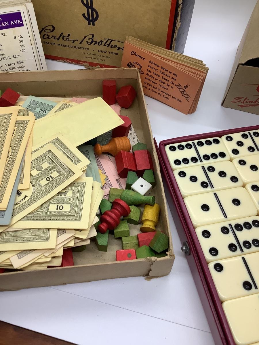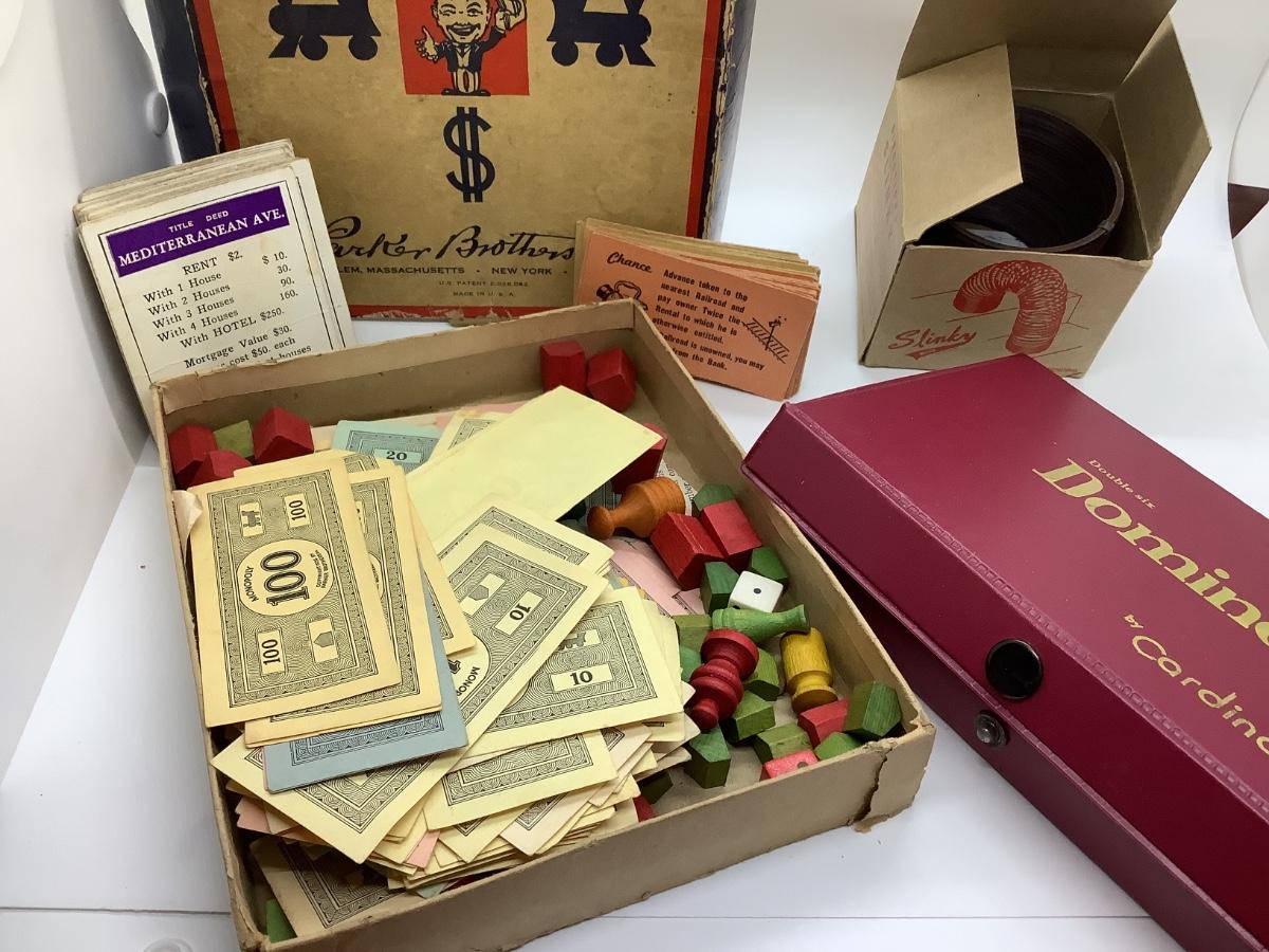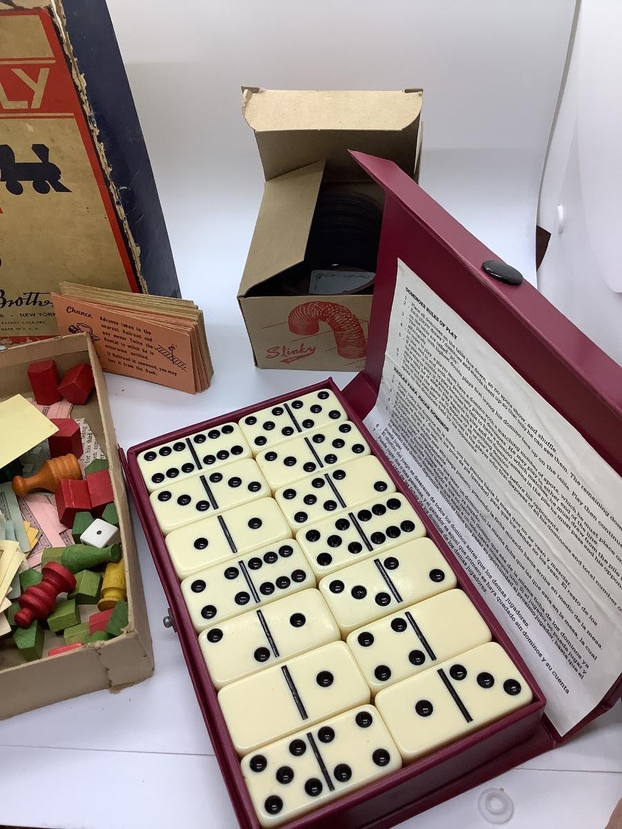 Vintage games - Monopoly with wooden houses, Slinky in original box, dominos in case