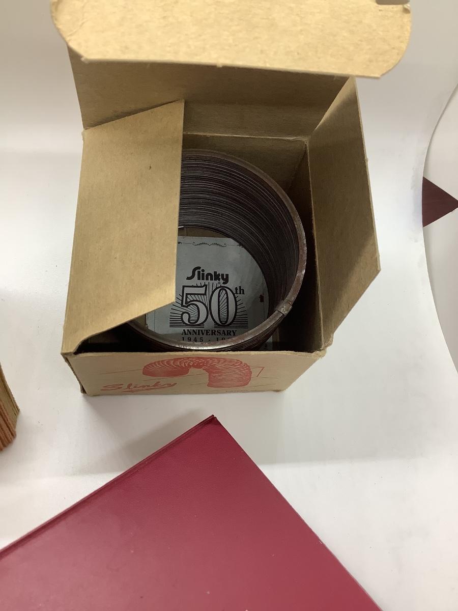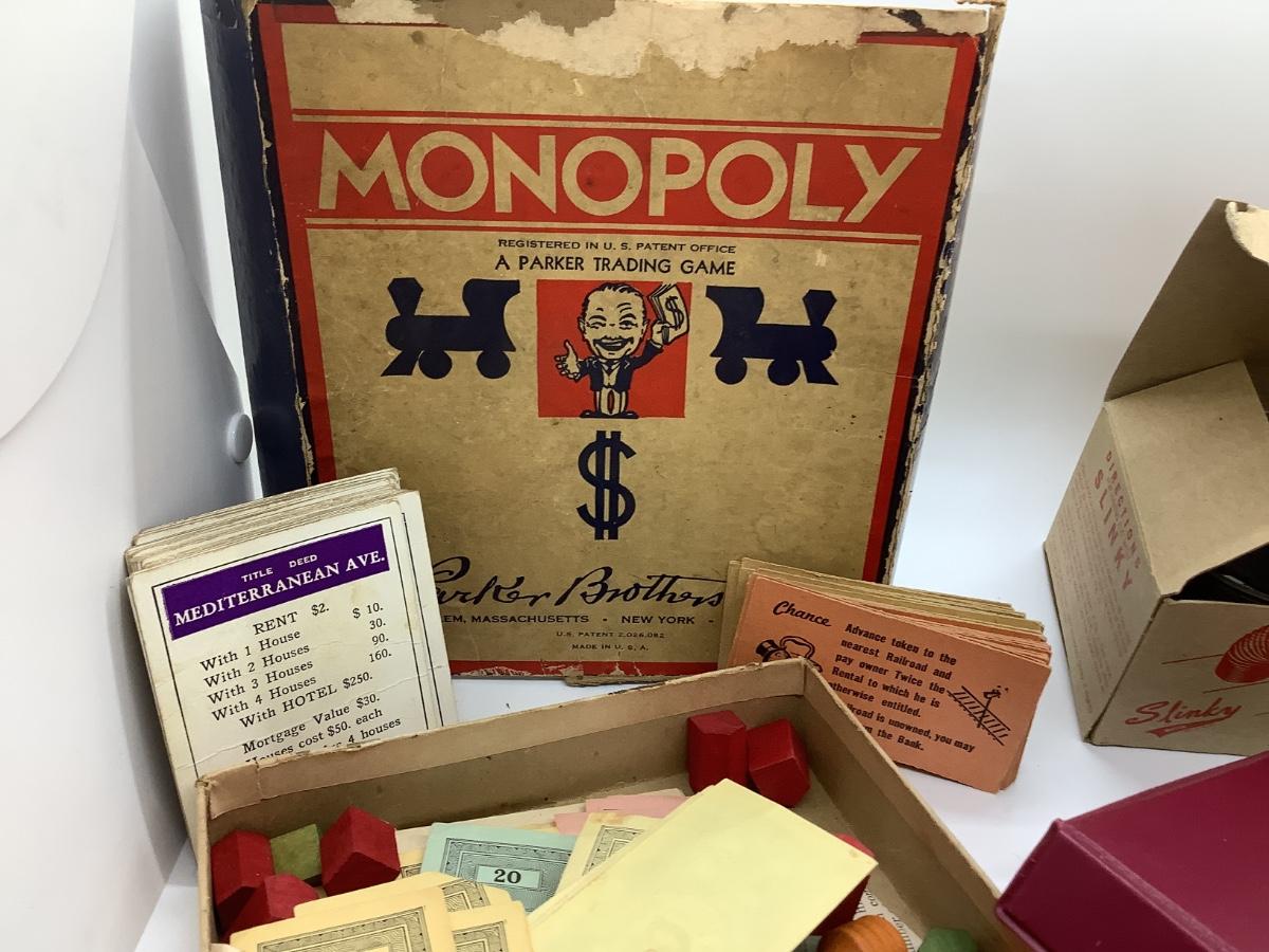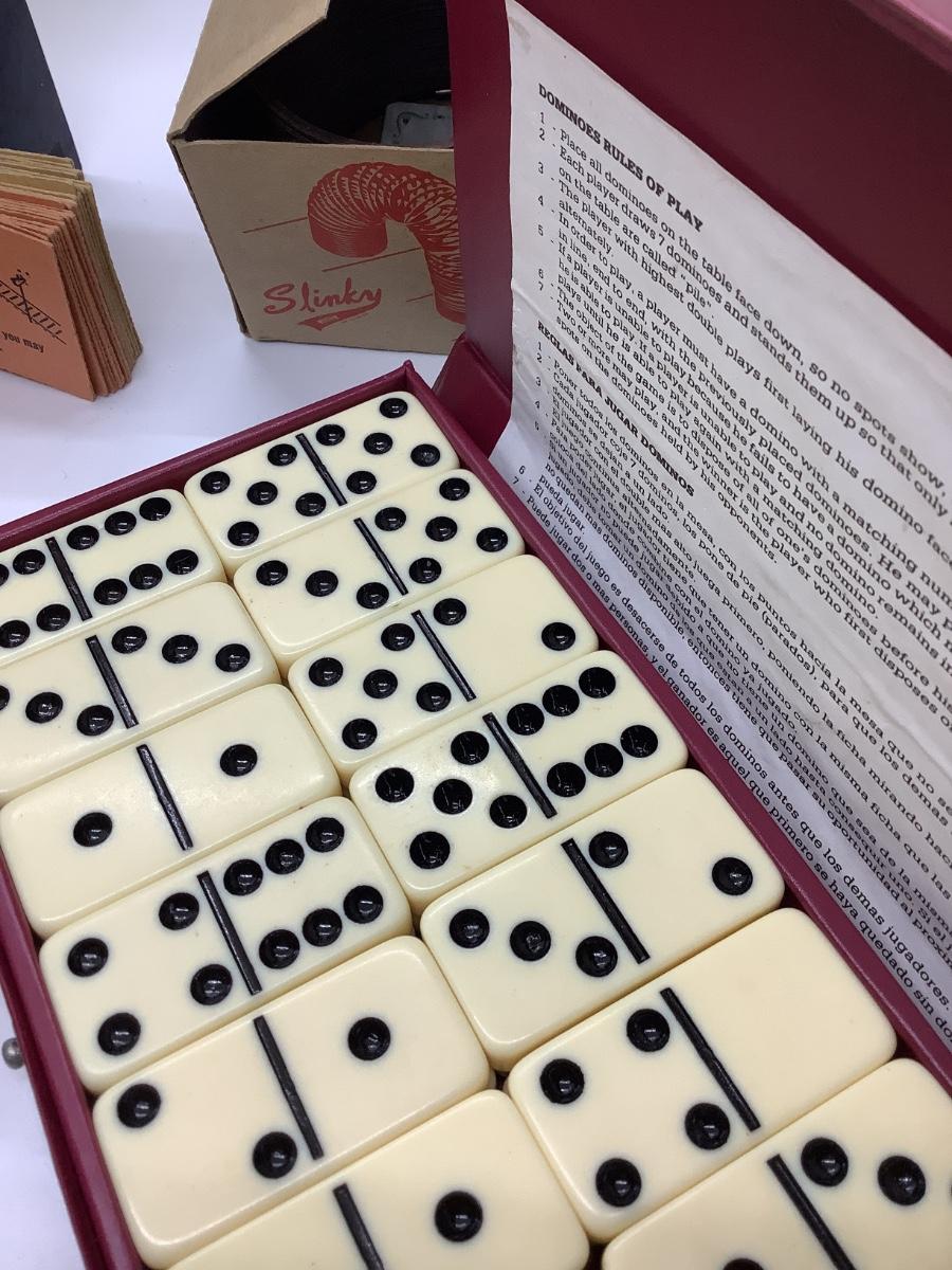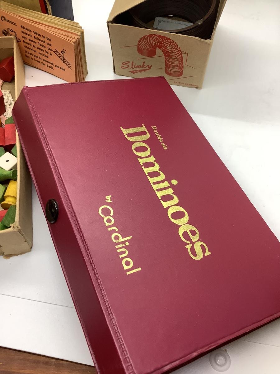 Vintage games - Monopoly with wooden houses, Slinky in original box, dominos in case