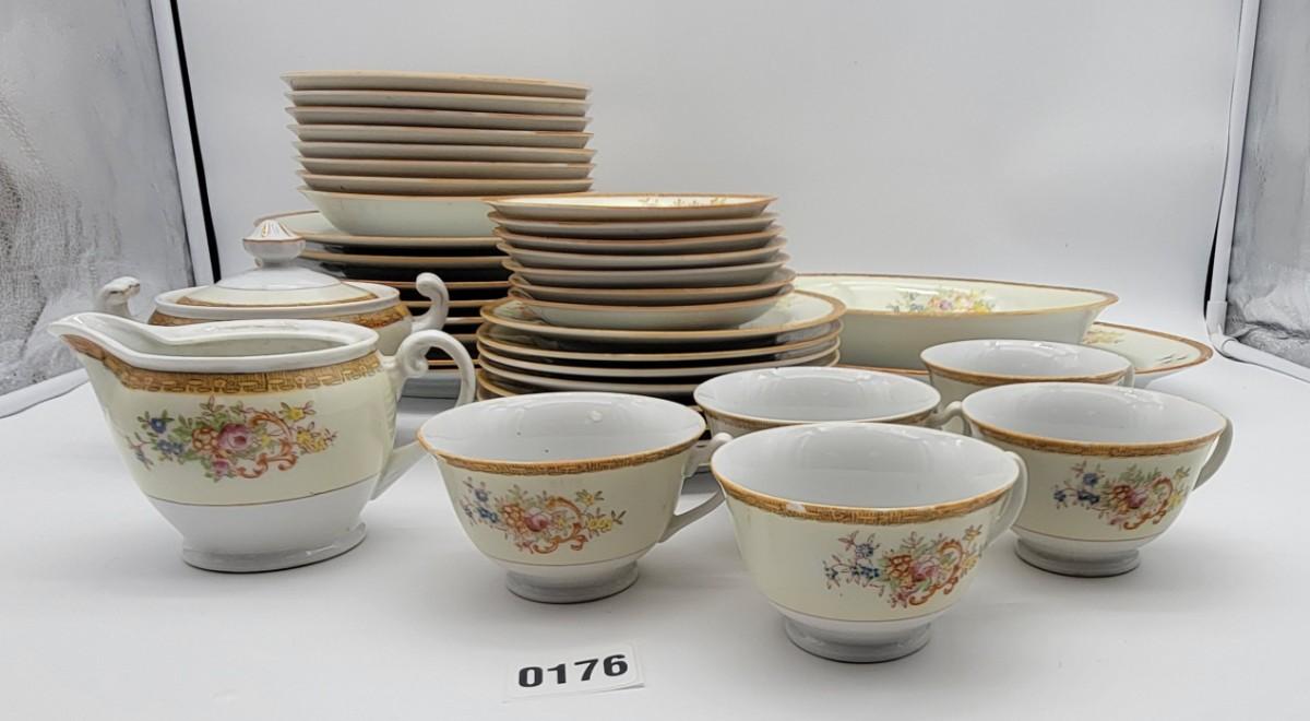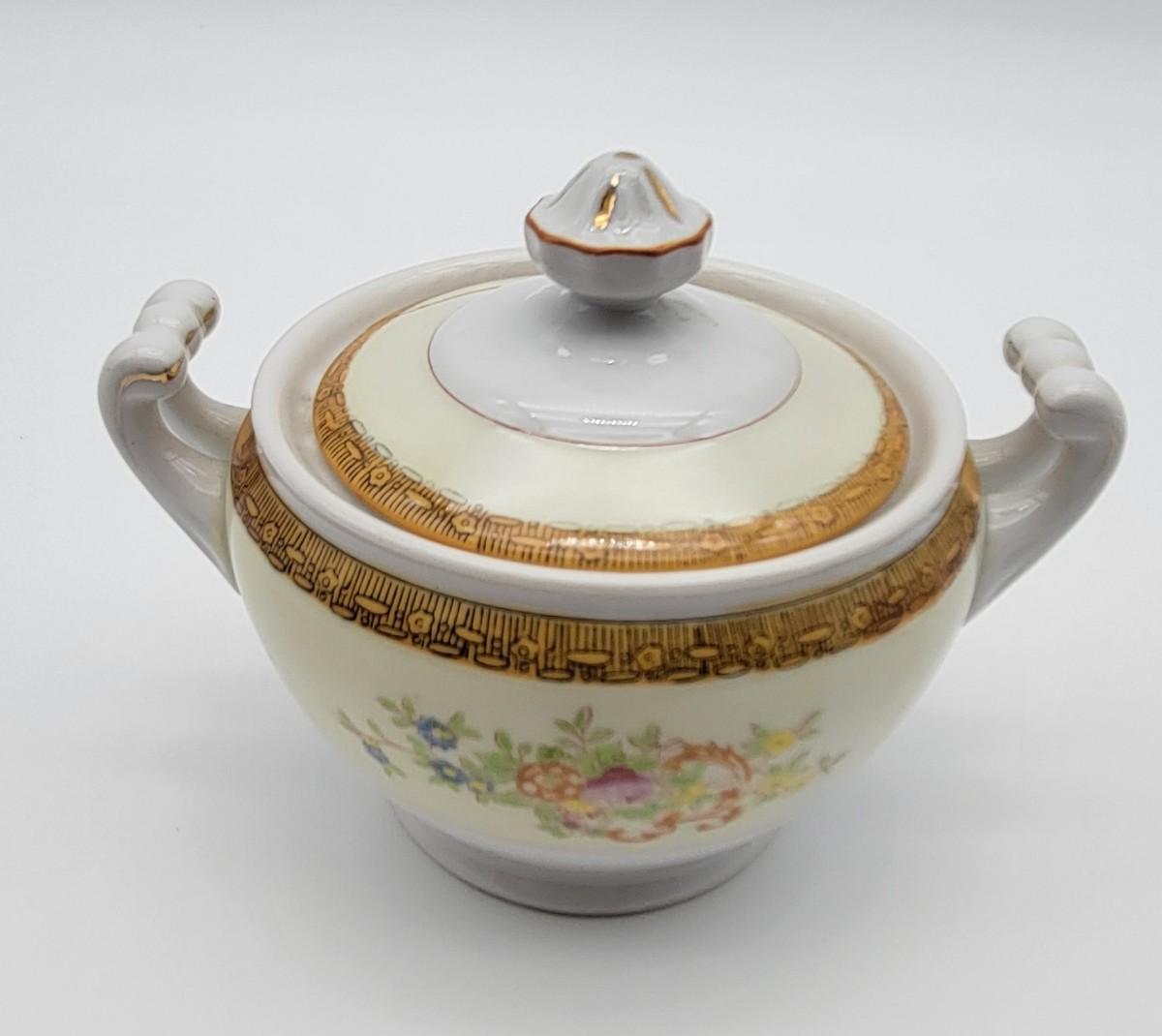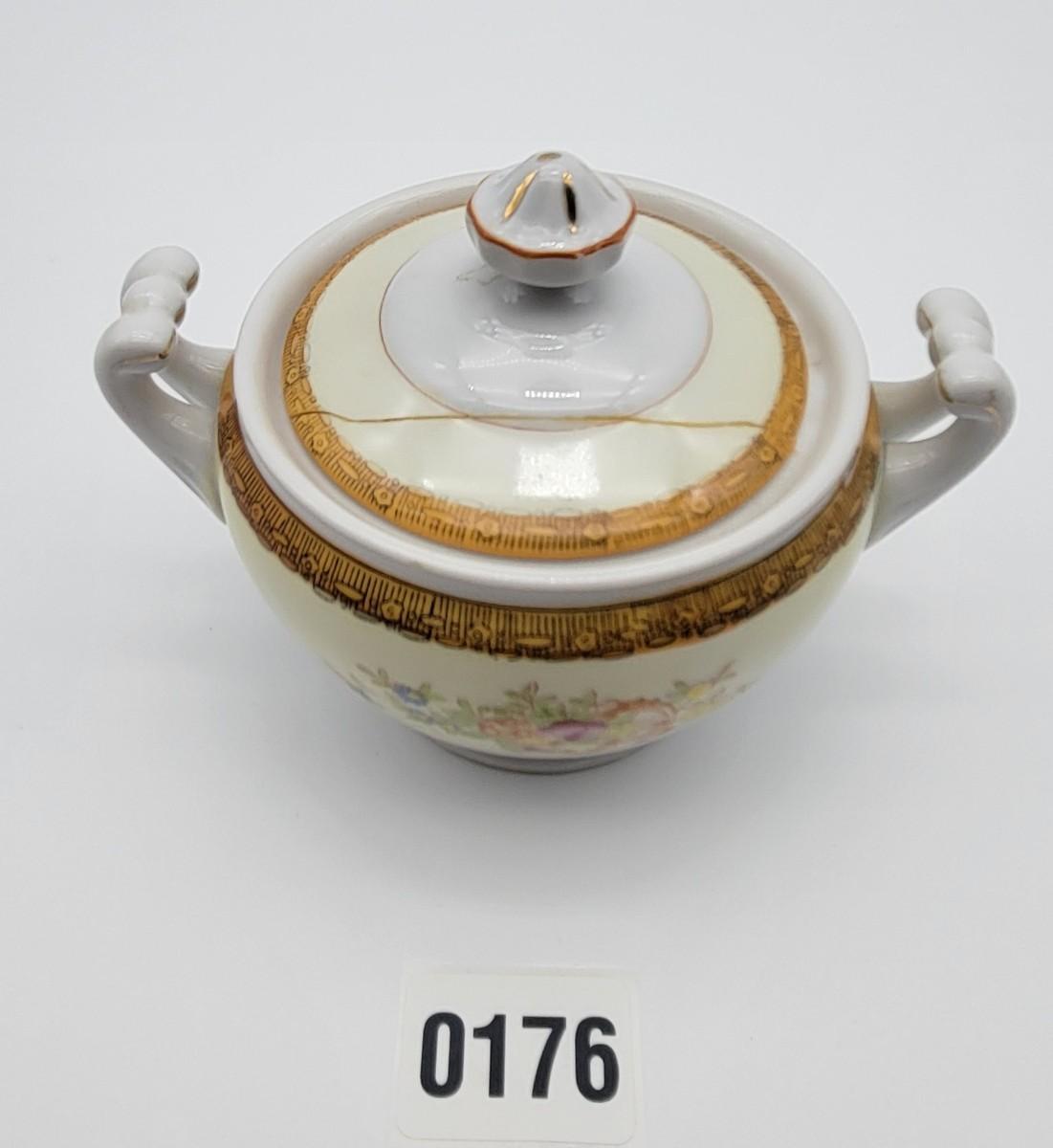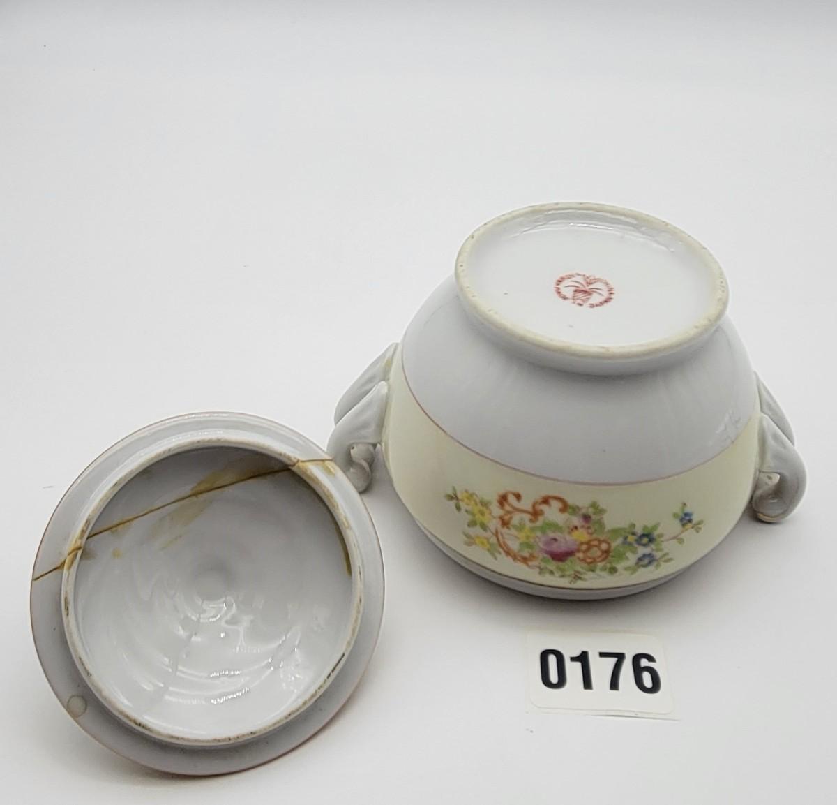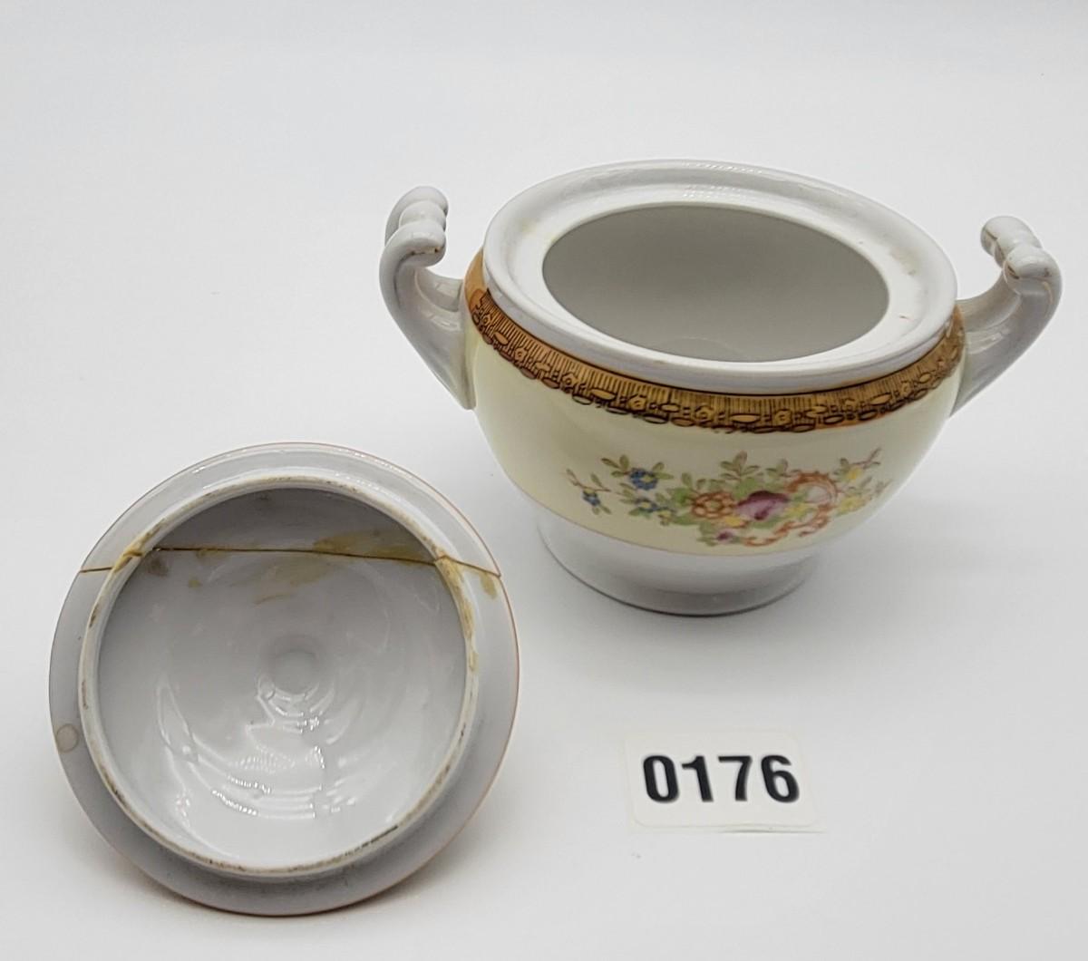 The Sugar dish has prior damage that has been repaired by the seller. The creamer canister does not have a lid.