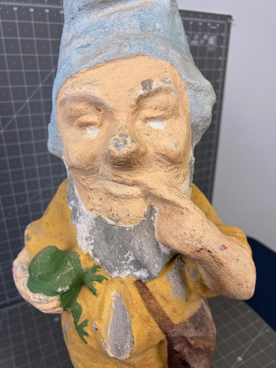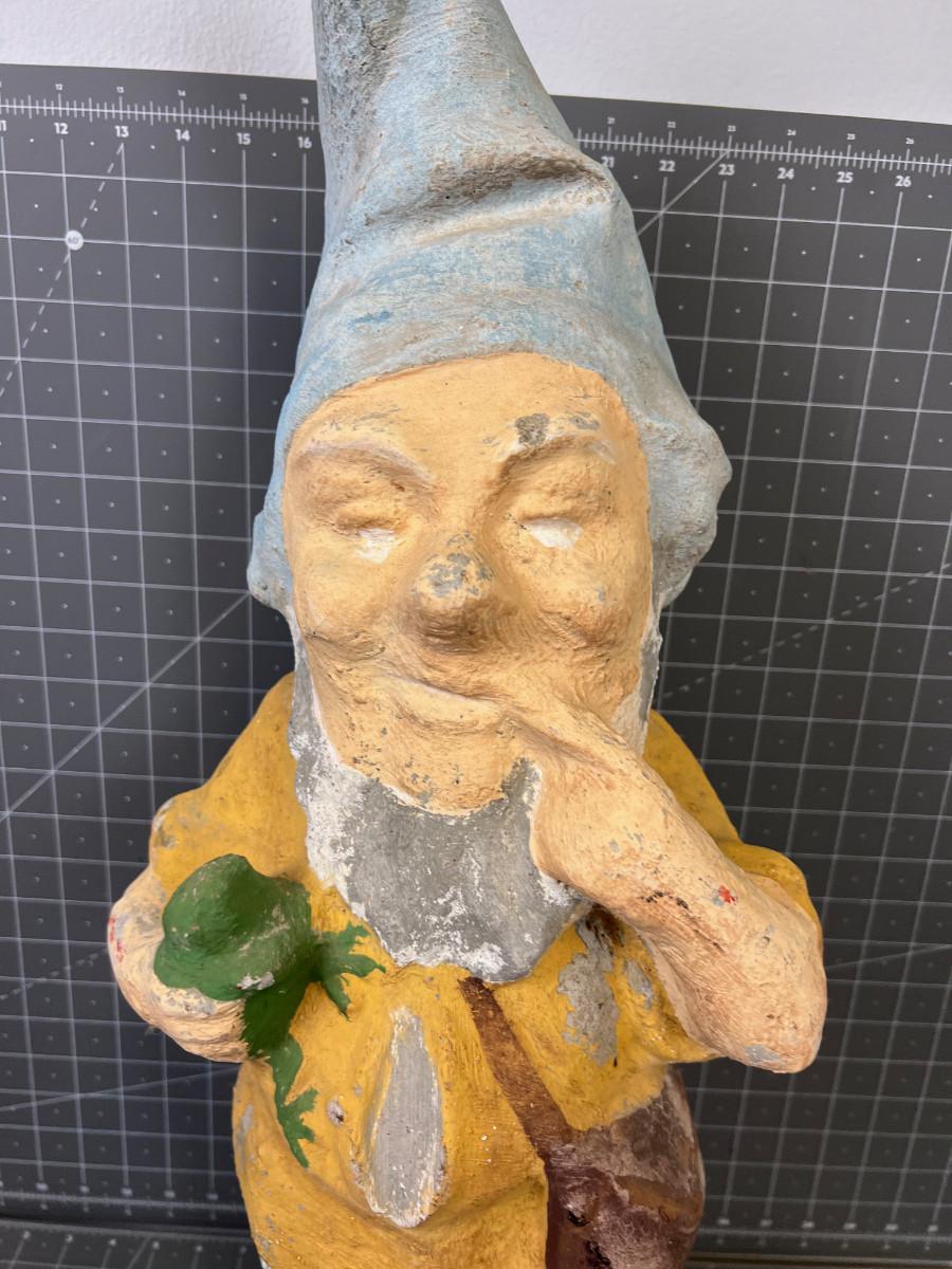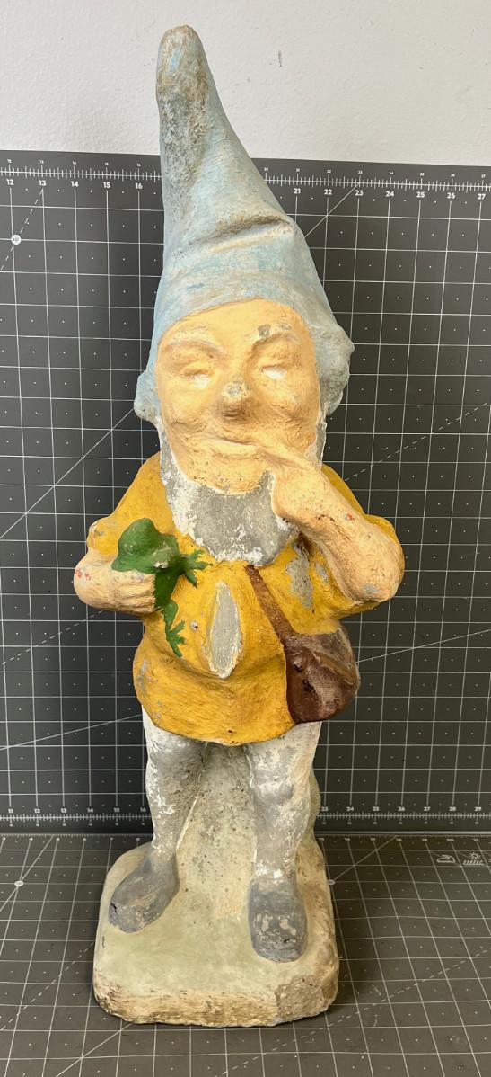 Cool old garden Gnome holding a frog, good condition about 30" tall. Cast concrete he is heavy!!!