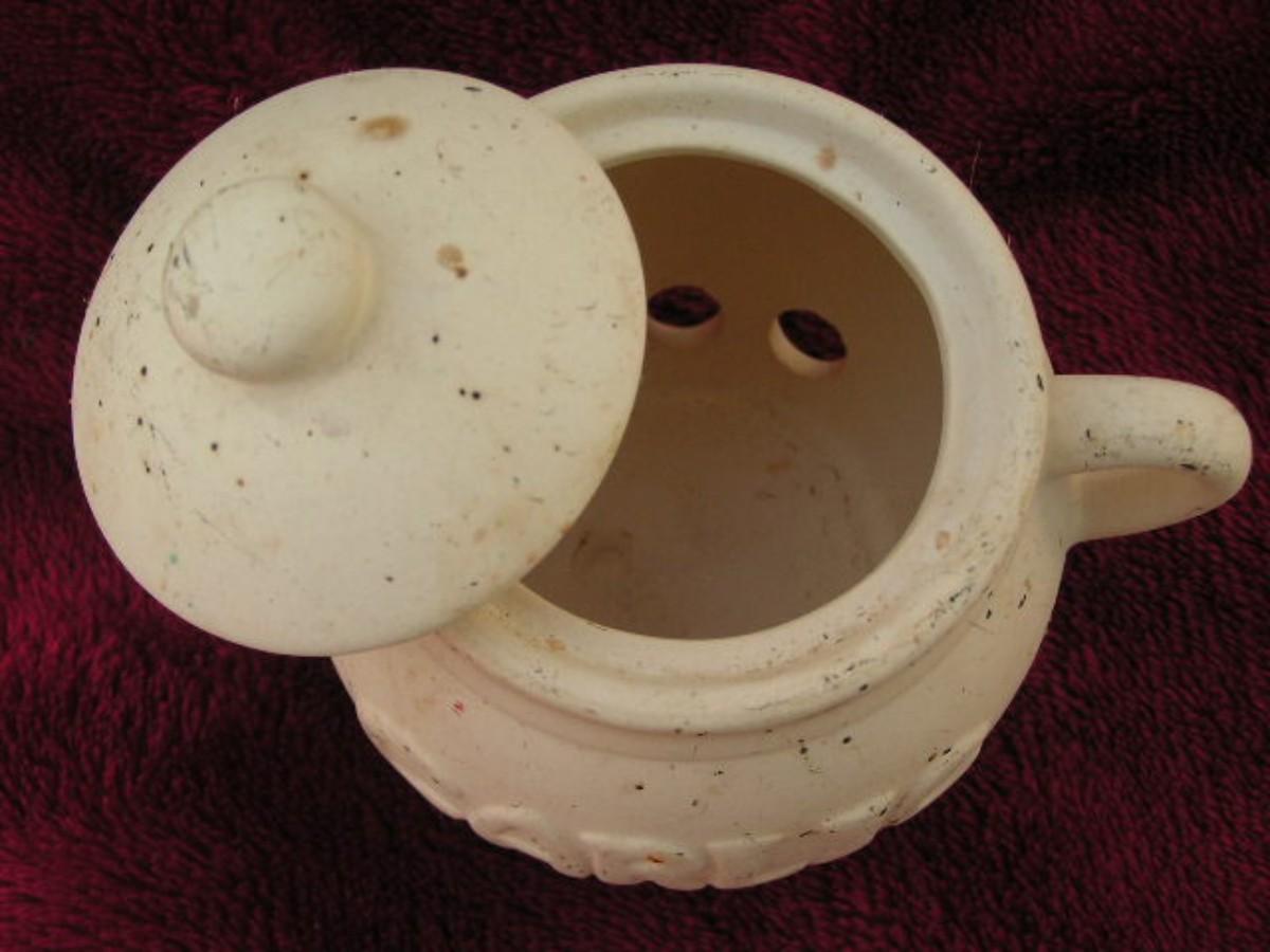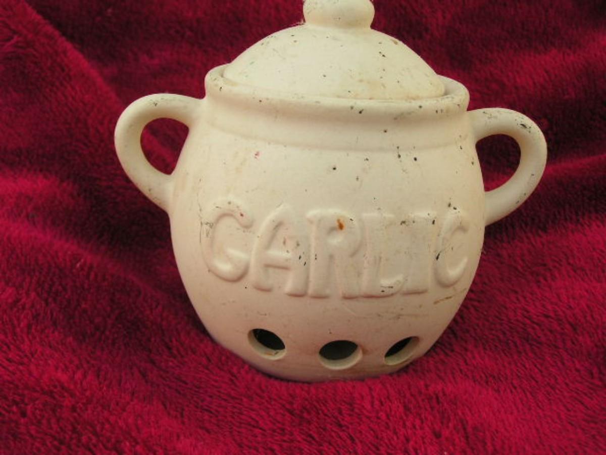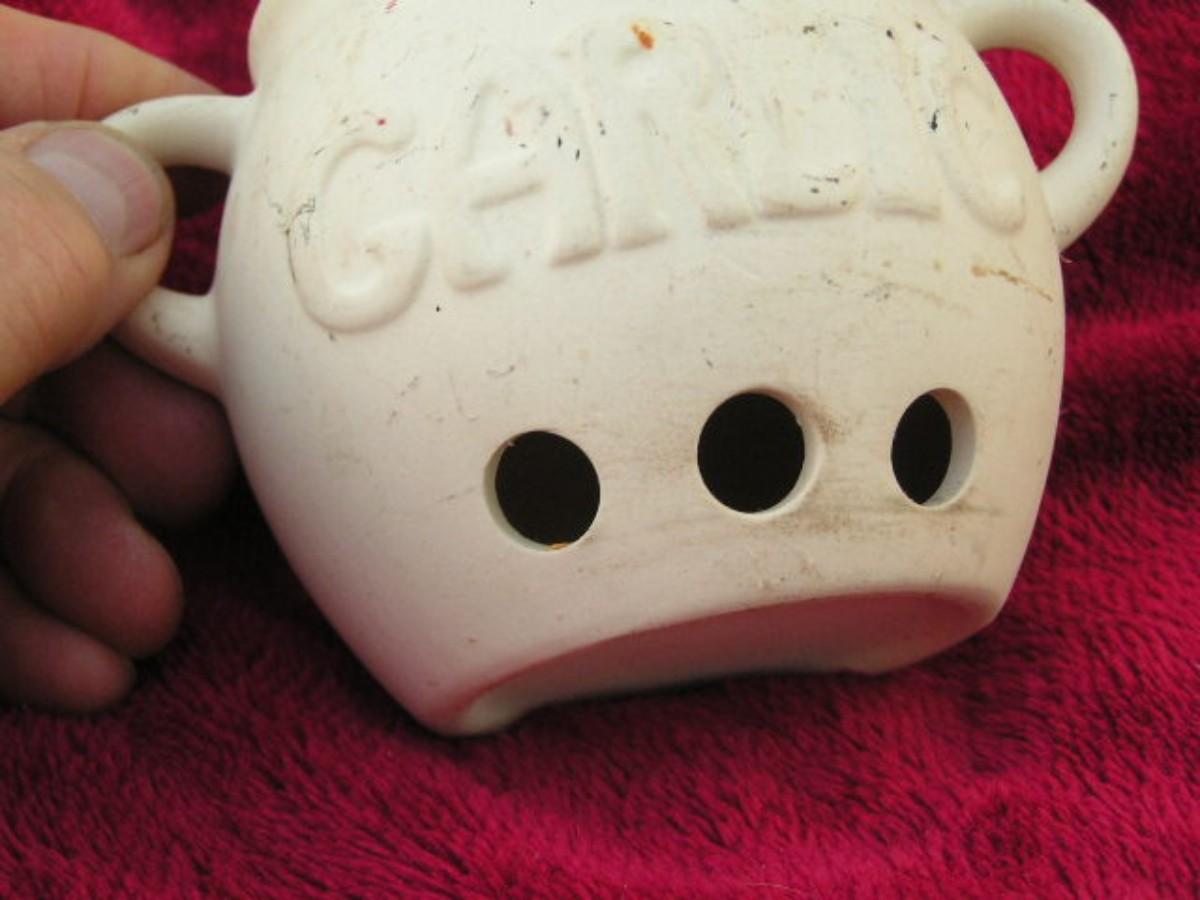 Vintage garlic keeper, vented, unglazed ceramic material.