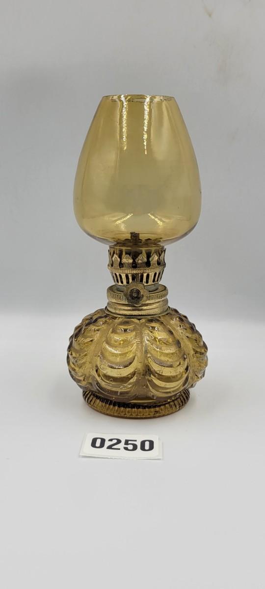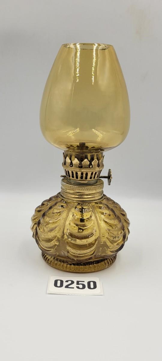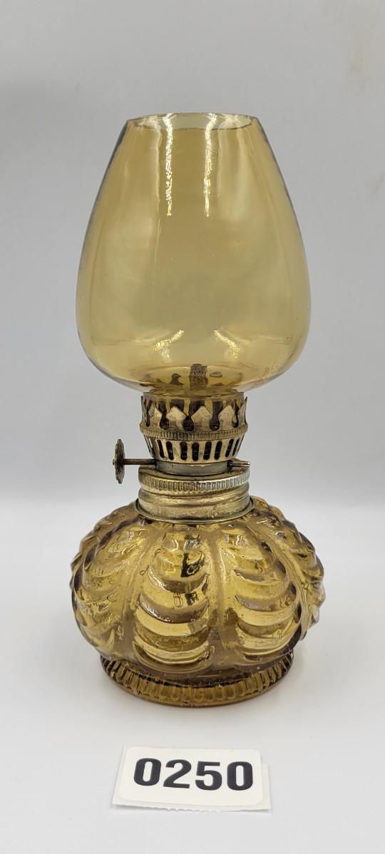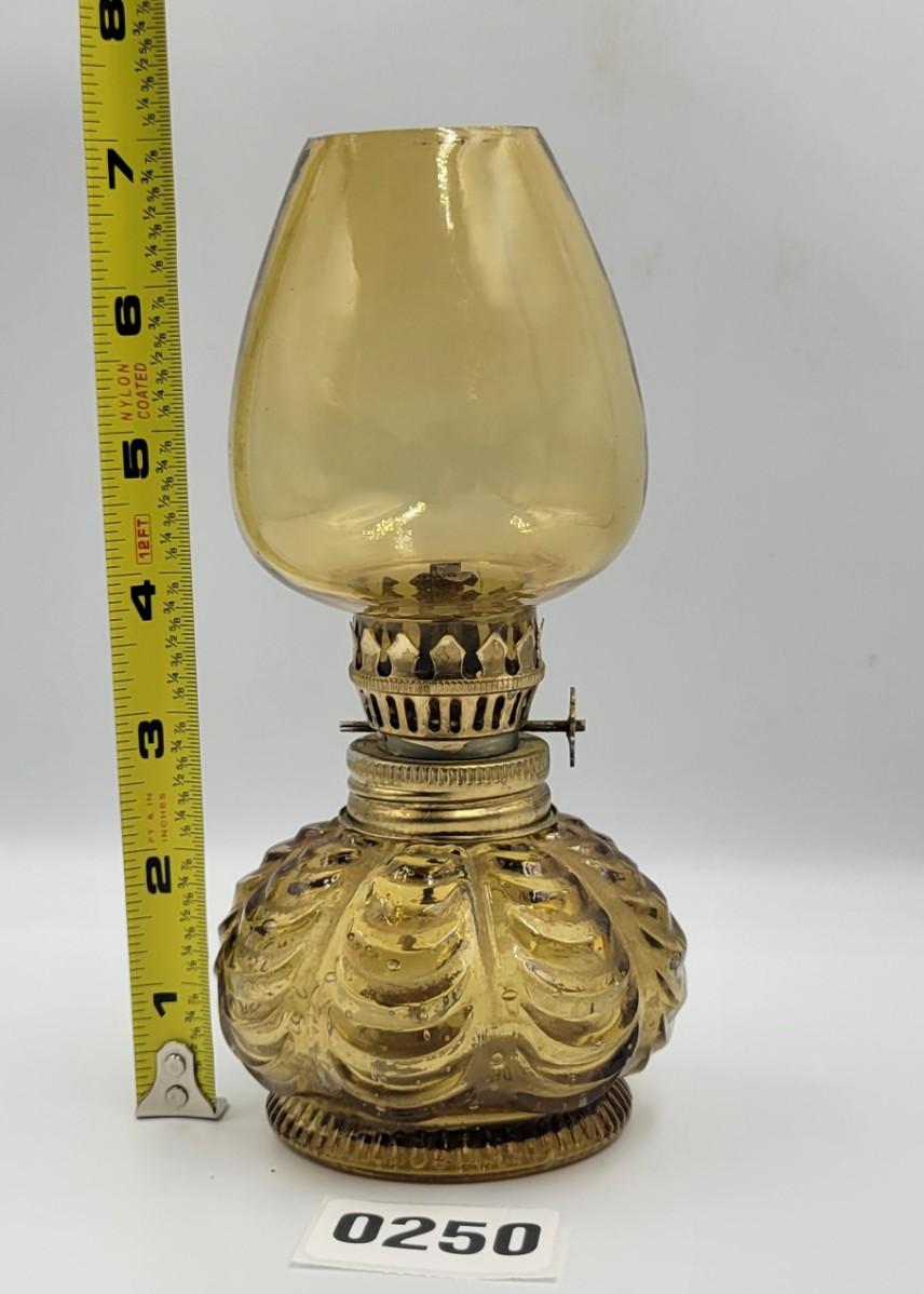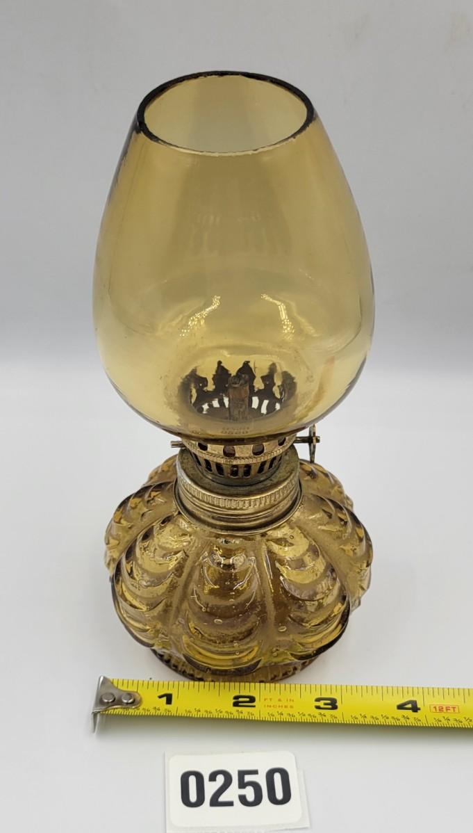 This is in good condition with no damage seen to either the bowl or the chimney. The knob does turn in both directions however it does not advance nor retract the wick. This is a miniature lamp. Dimensions are shown in the photos.