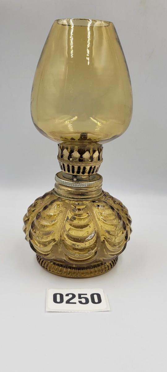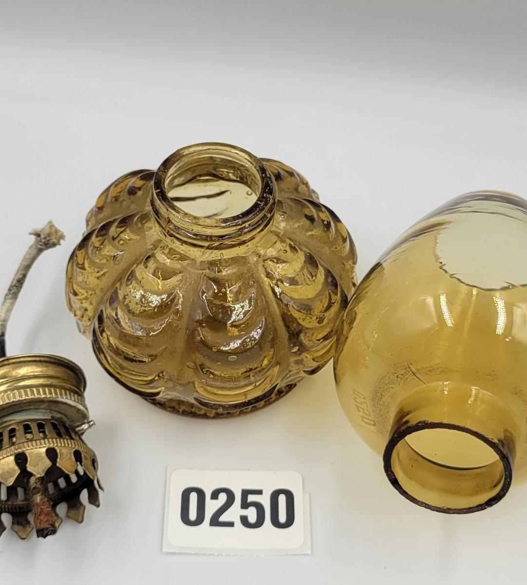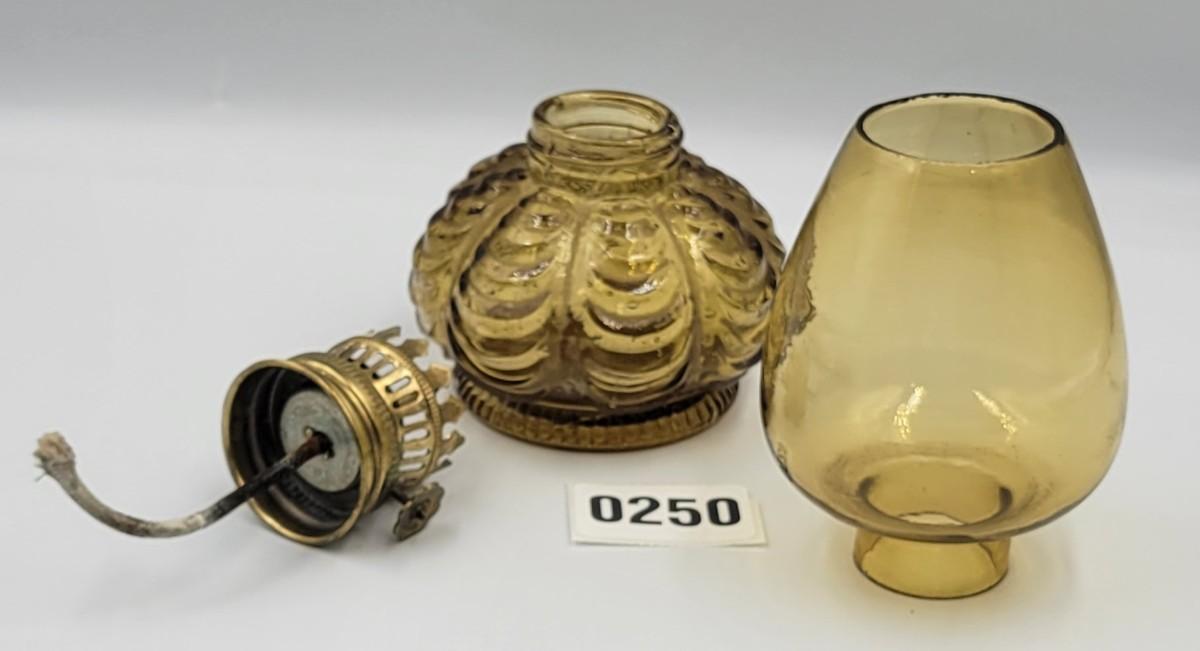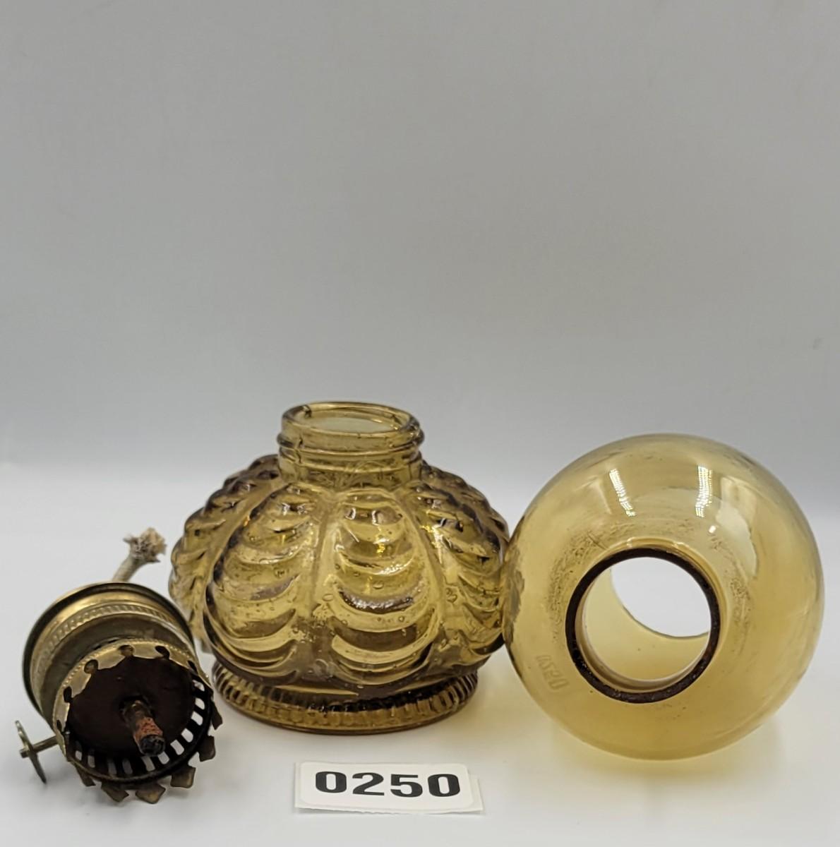 This is in good condition with no damage seen to either the bowl or the chimney. The knob does turn in both directions however it does not advance nor retract the wick. This is a miniature lamp. Dimensions are shown in the photos.