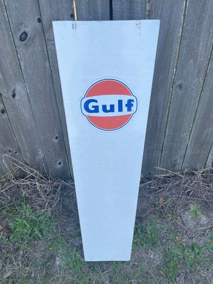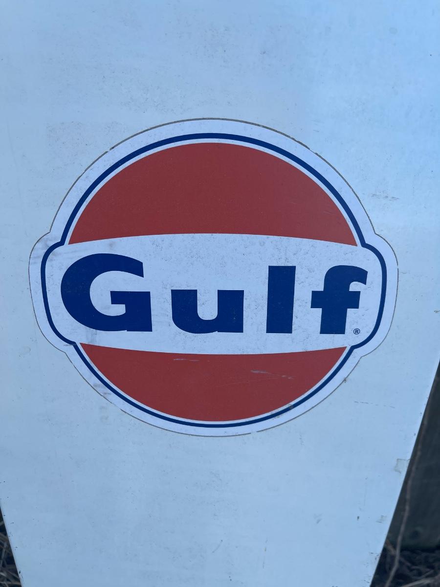 Gulf gas pump panel in good condition with scratches and scuffs. Great for a mancave or garage space!