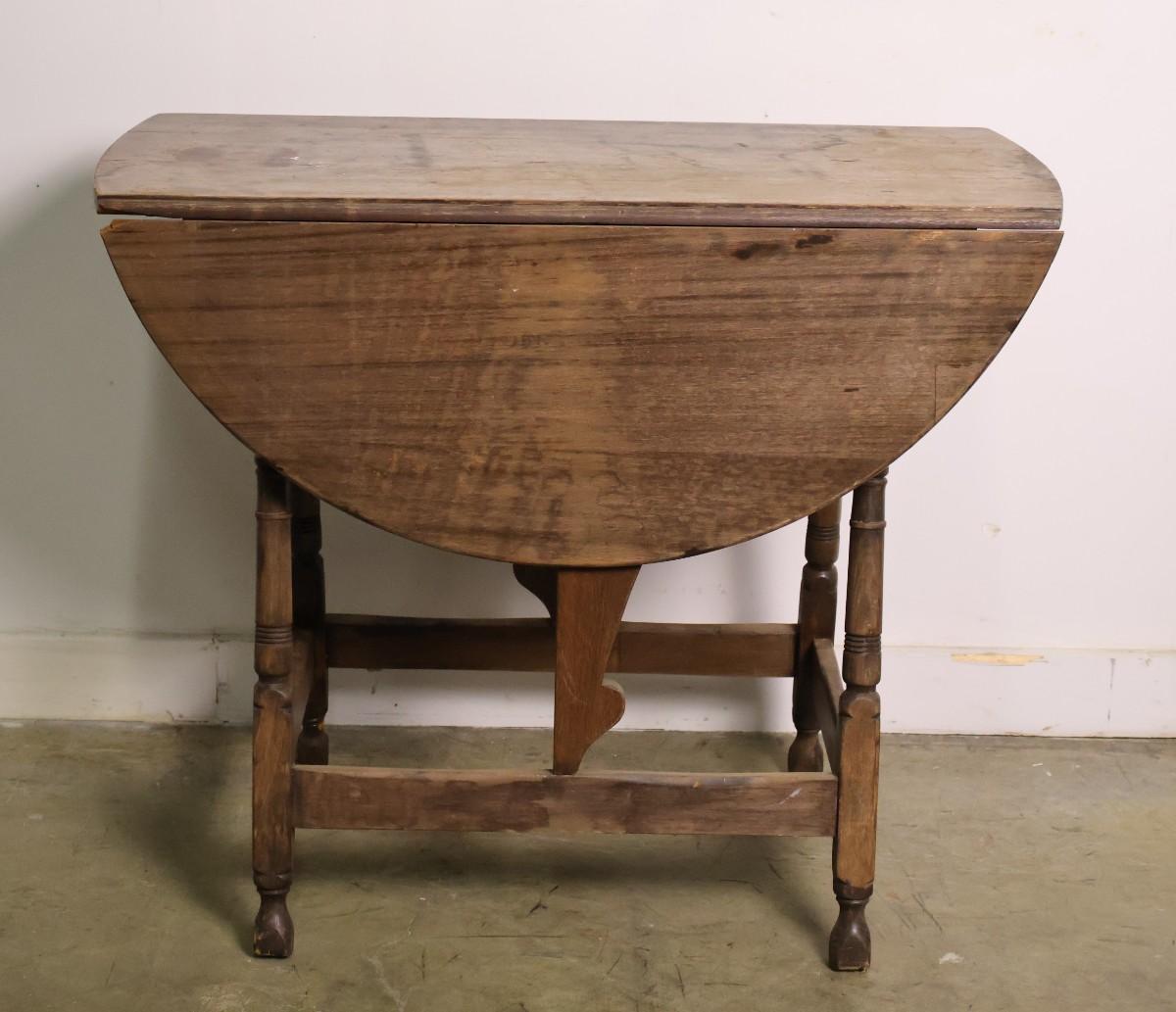 Vintage gate leg, drop leaf table. Examine photos carefully for condition as table shows extensive wear. Excellent DIY project. 14" (35" with leaves extended) x 31" x 26" high (drop leaves are 10.5").