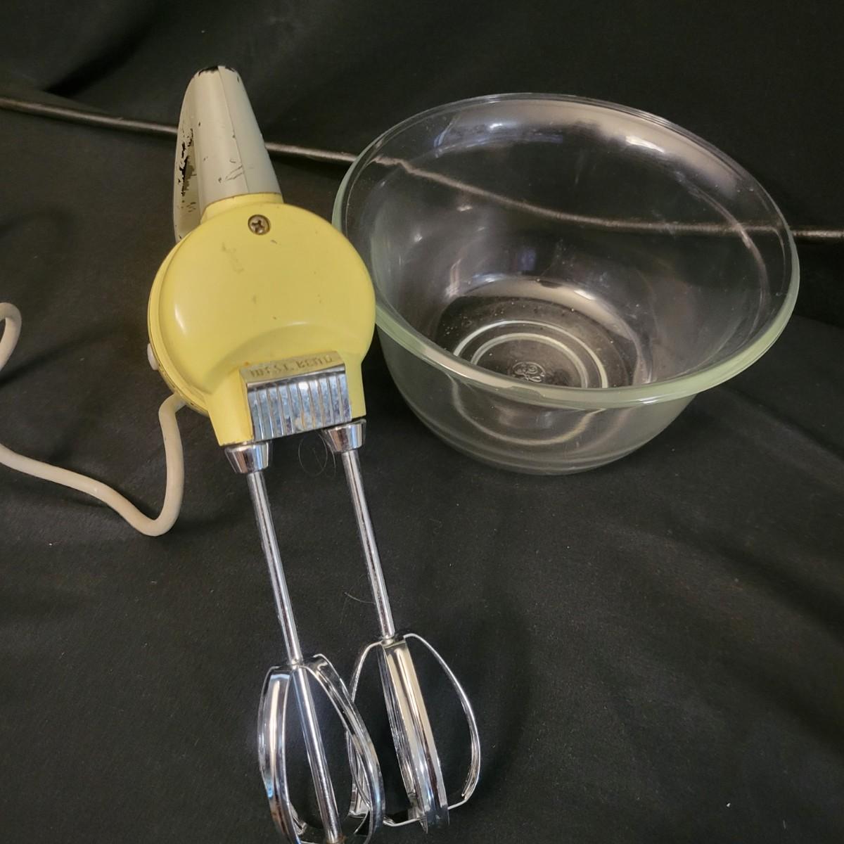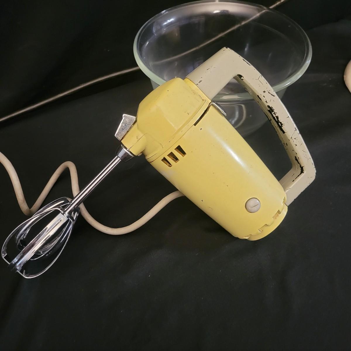 A pair of vintage mixers in good condition with some minor blemishes. The West Bend (3230E) is a hand mixer made of metal and with speed adjustments. The GE (149M8) is a stand mixer with three flat beaters and two glass mixing bowls. Both items were tested and work. The stand mixer measures approximately 12" x 9.5" x 14". Shipping available.