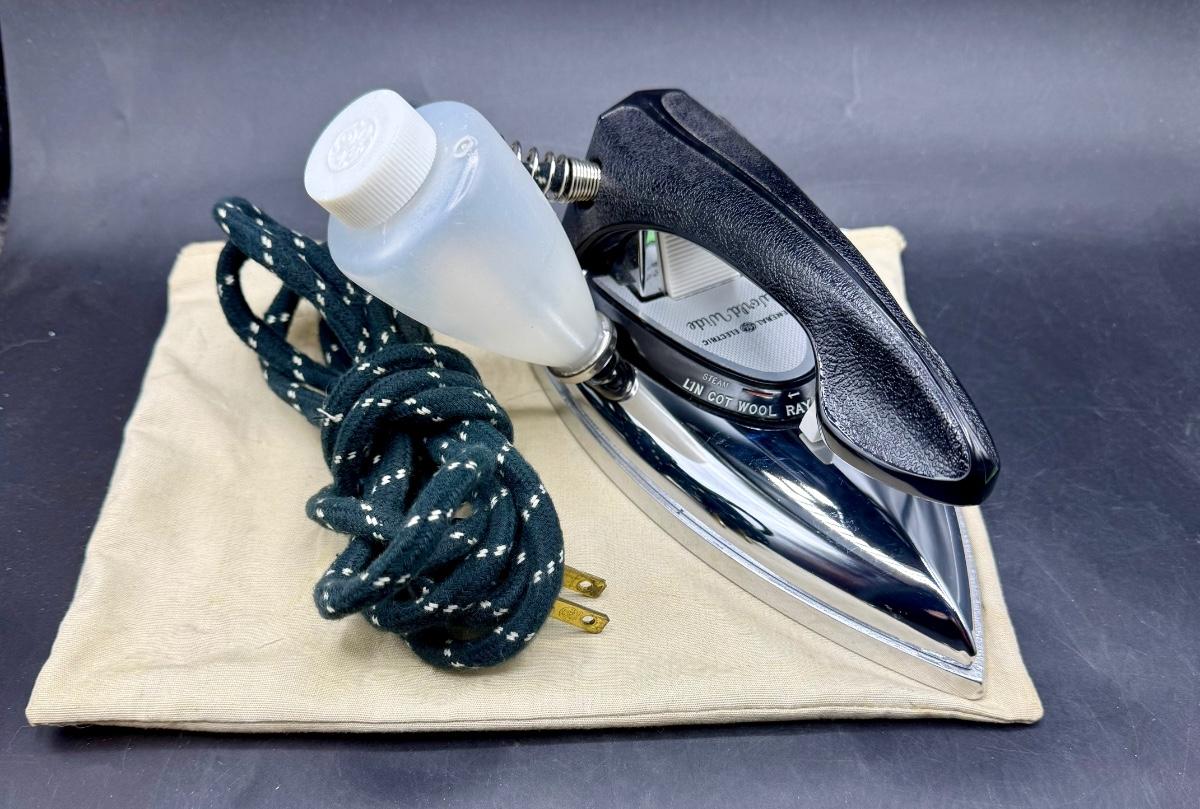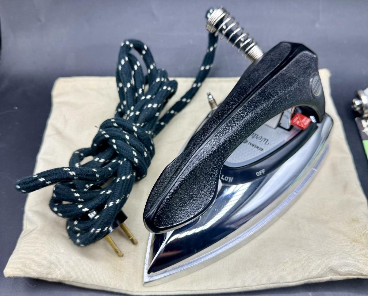 With carry bag and user guide. Tested, heats up as expected. Note that the small plastic spray bottle is missing the spray cap, but this could likely be easily replaced if desired.