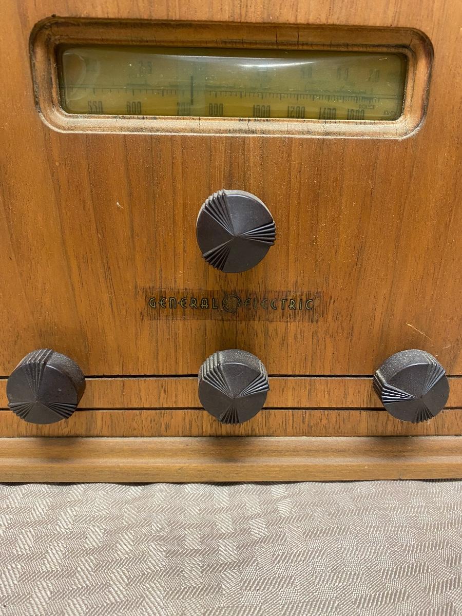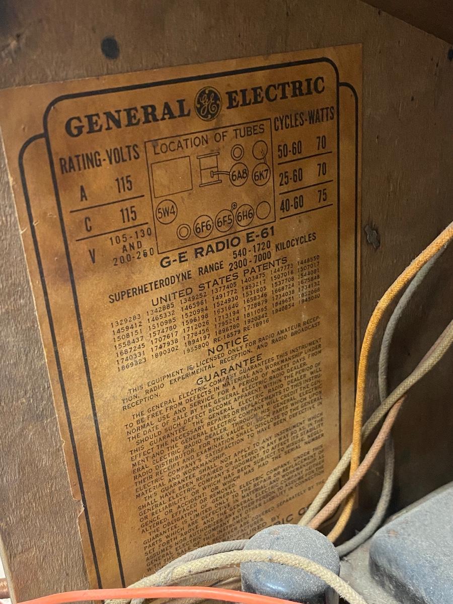 Vintage GE E-61 tube radio. Table sitting radio known as a cathedral or tombstone style radio. In good condition. Has an old cord attached, did not test. Displays nicely. About 16" tall.