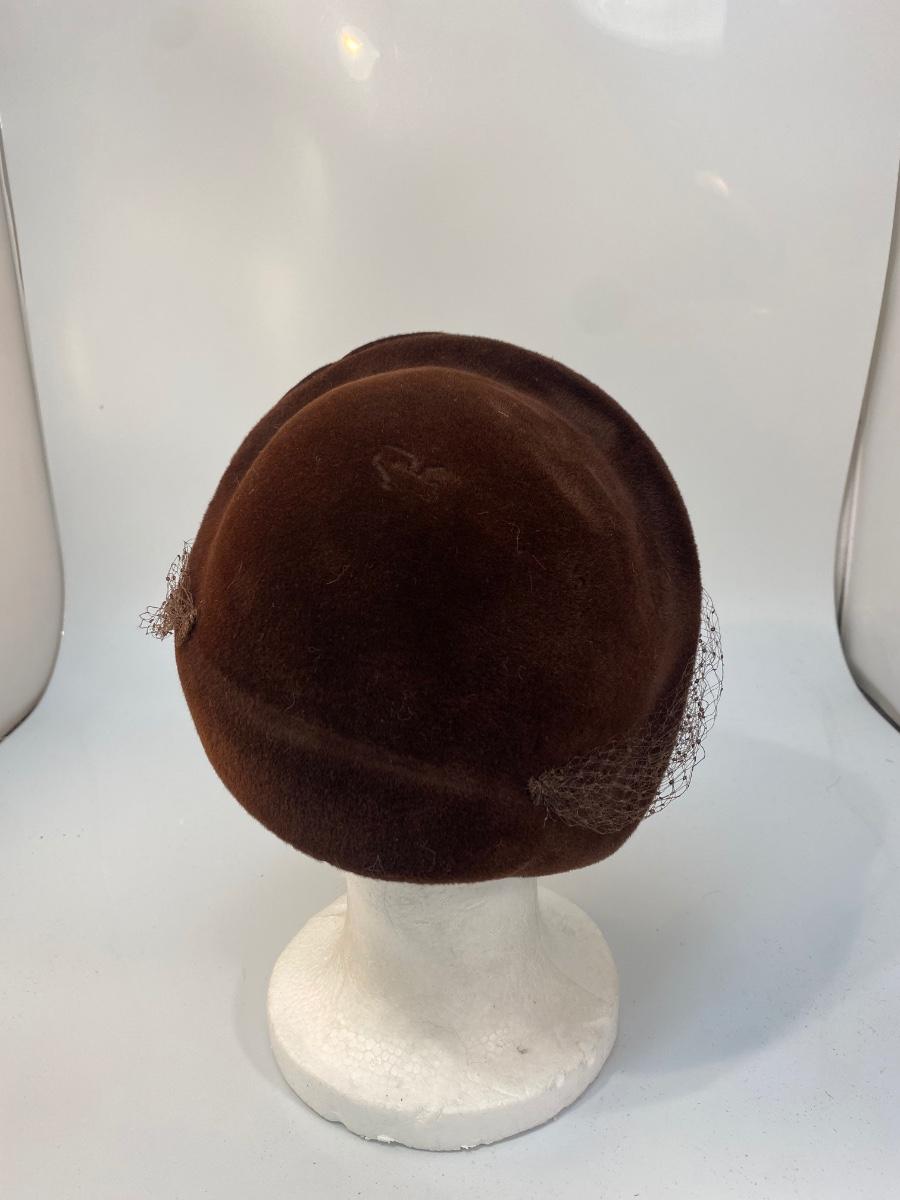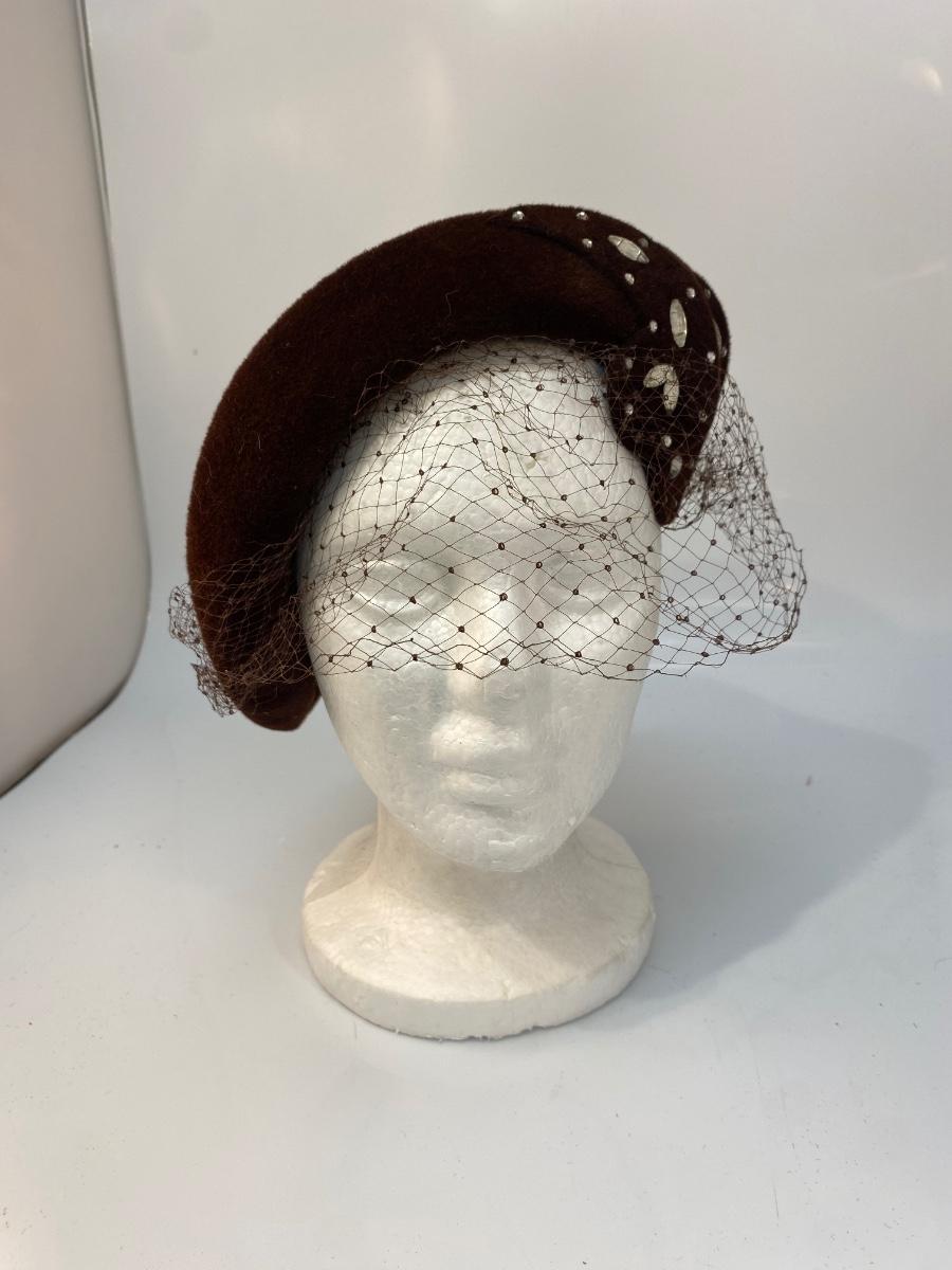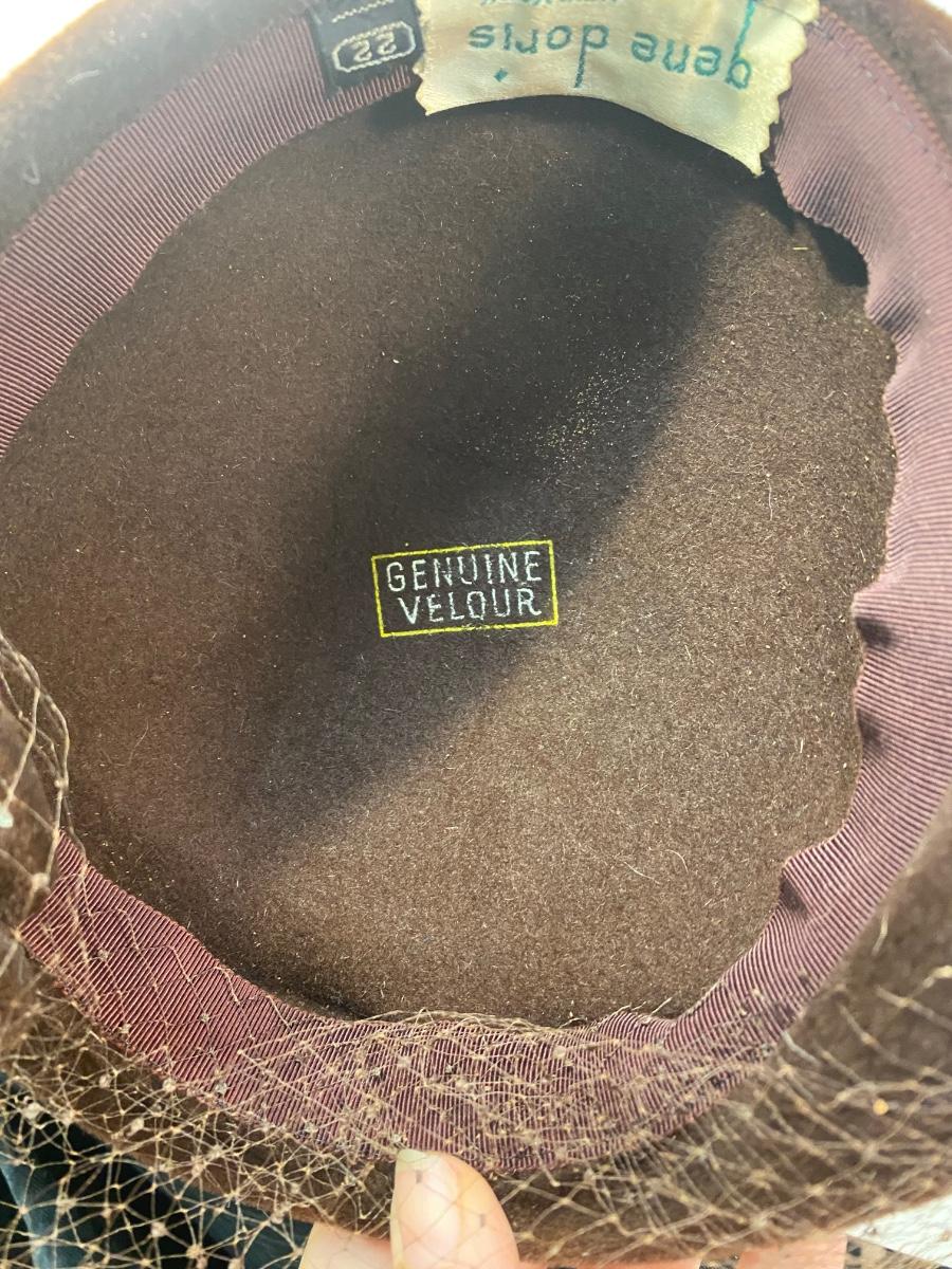 Vintage Dark Brown Genuine Velour Cloche Asymmetrical Hat with Rhinestones & Netting. In good vintage condition. A little wear on the very top of hat. Tag inside Gene Doris New York.