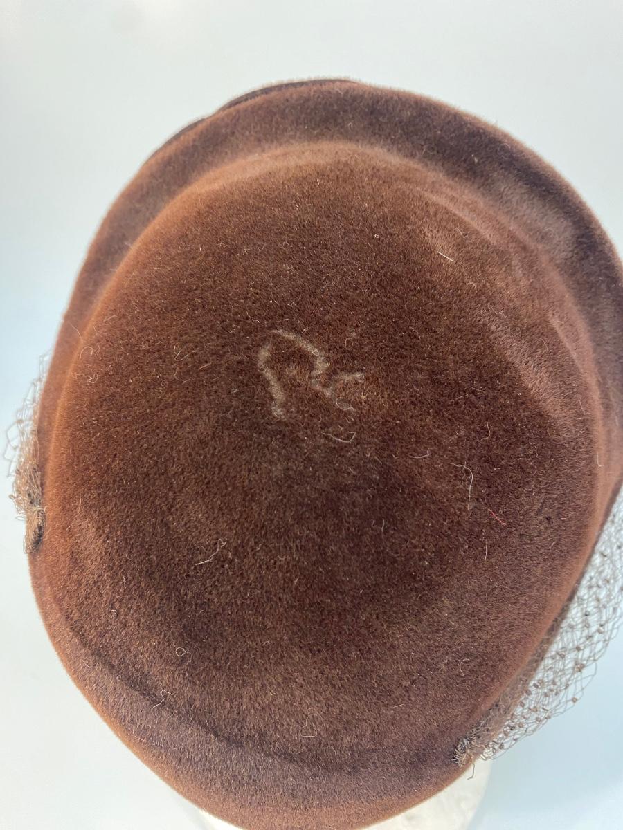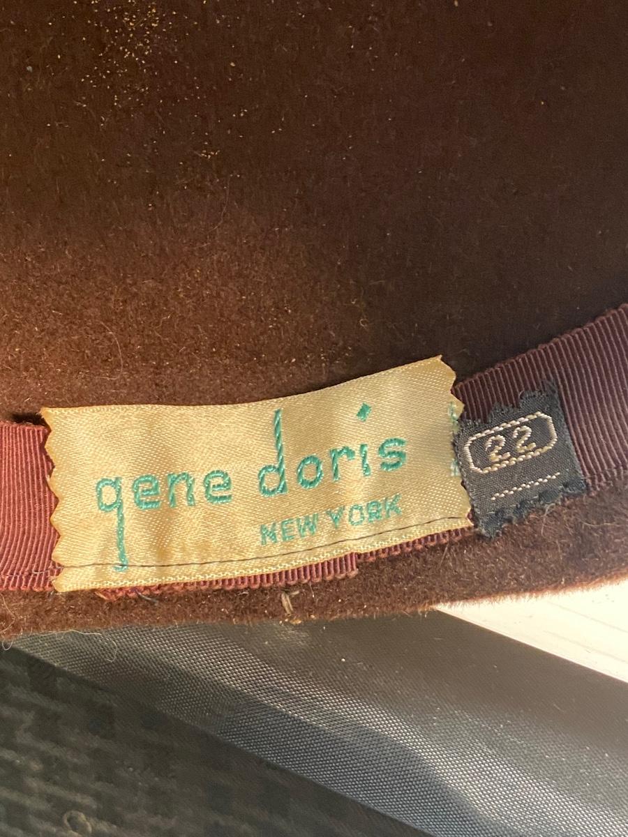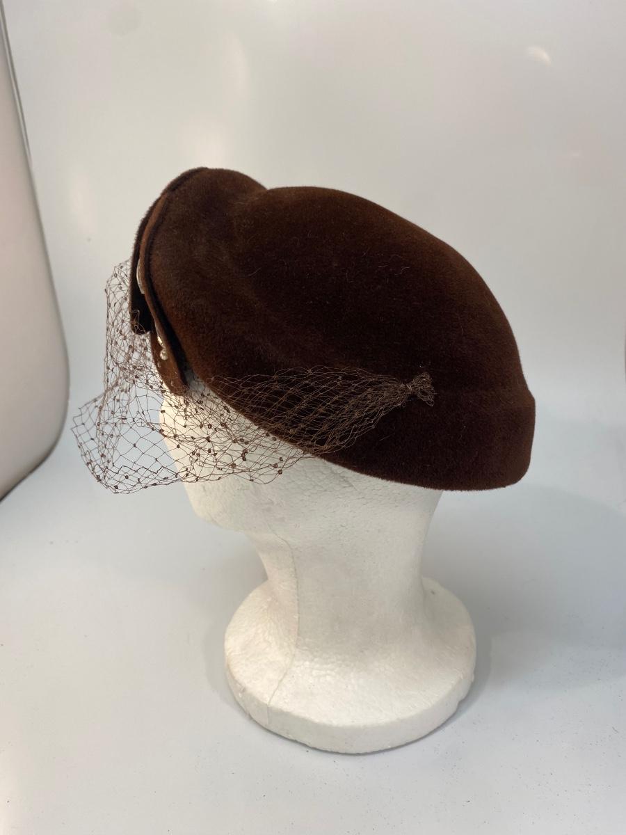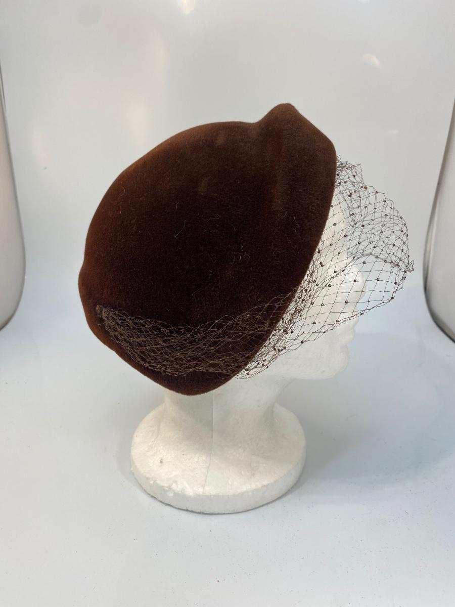 Vintage Dark Brown Genuine Velour Cloche Asymmetrical Hat with Rhinestones & Netting. In good vintage condition. A little wear on the very top of hat. Tag inside Gene Doris New York.
