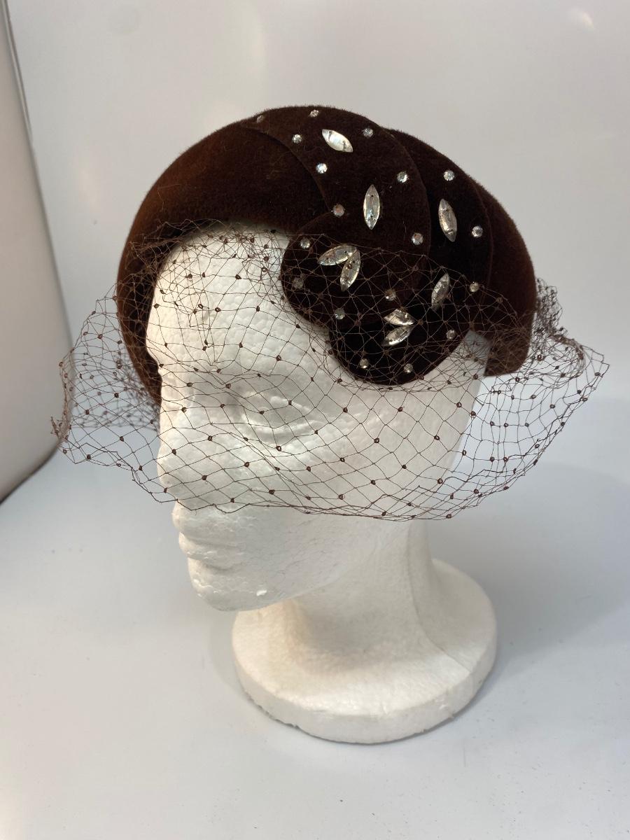 Vintage Gene Doris Dark Brown Genuine Velour Cloche Asymmetrical Hat with Rhinestones & Netting