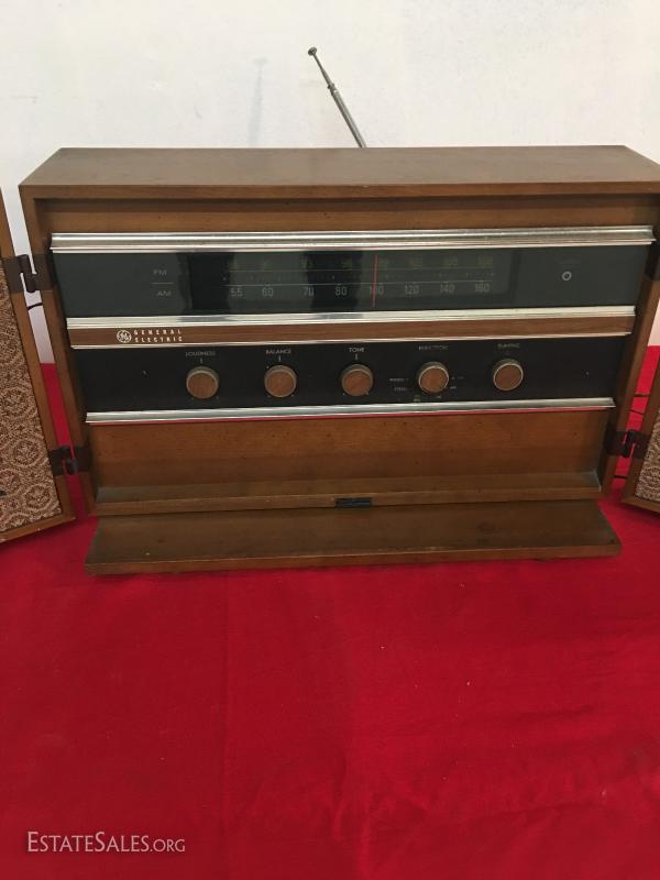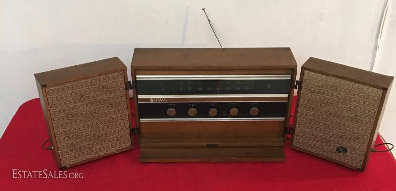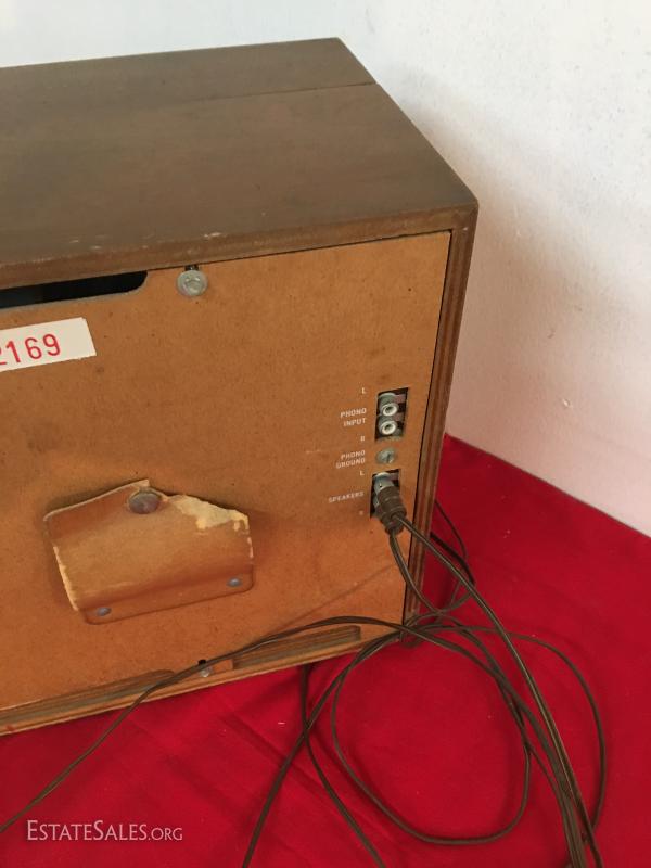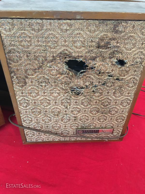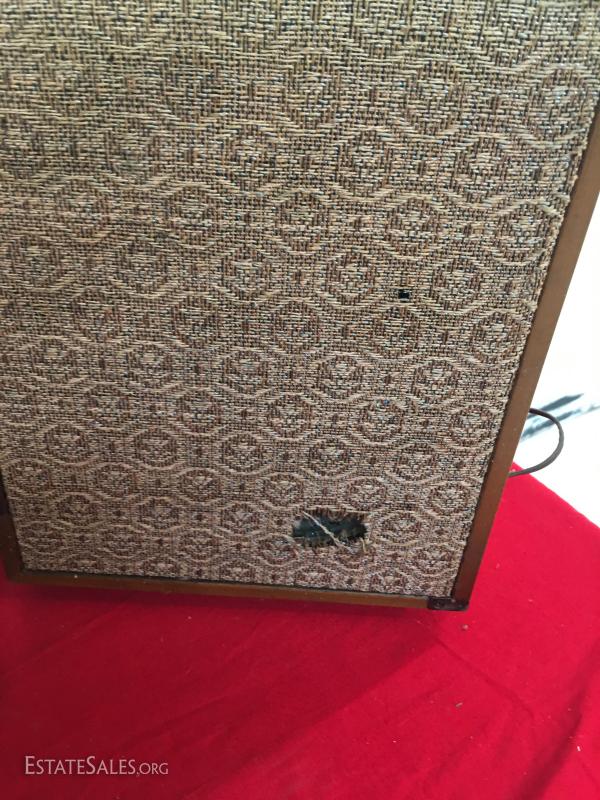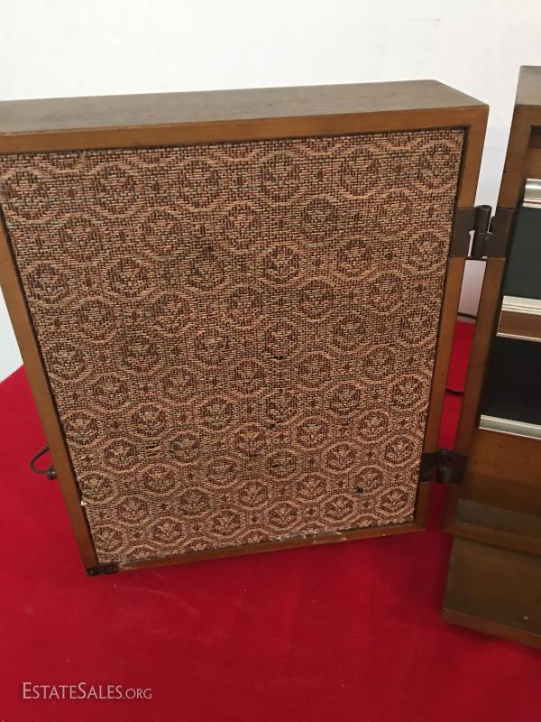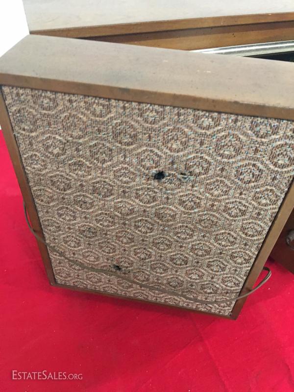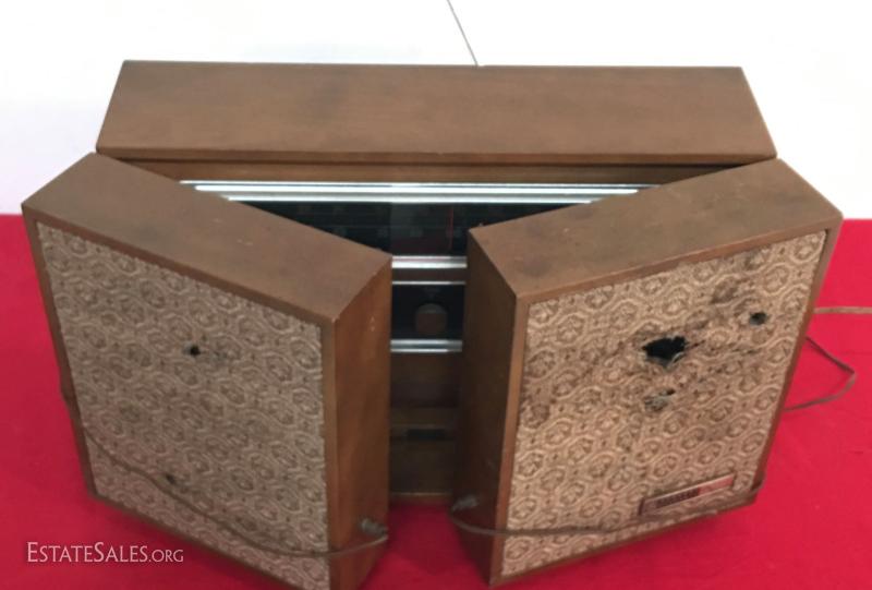 Stereo powers up and I can tune in AM stations. Has damage to speaker covers. Speakers fold in and can also be unhooked and moved farther from the tuner/amp. Sold as-is for parts or repair. Cabinet measures 18" by 7" by 12" tall when closed.